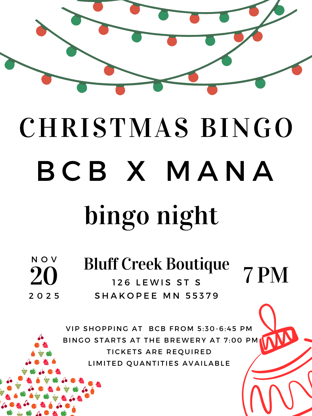 🛍️ Start the night off merry and bright! Shop at Bluff Creek from 5:00–6:45 PM and enjoy exclusive Bingo shopping discounts before the fun begins. Grab your bingo cards and drink ticket before heading to Mana. (Daubers will be distributed at Mana!)