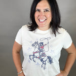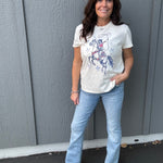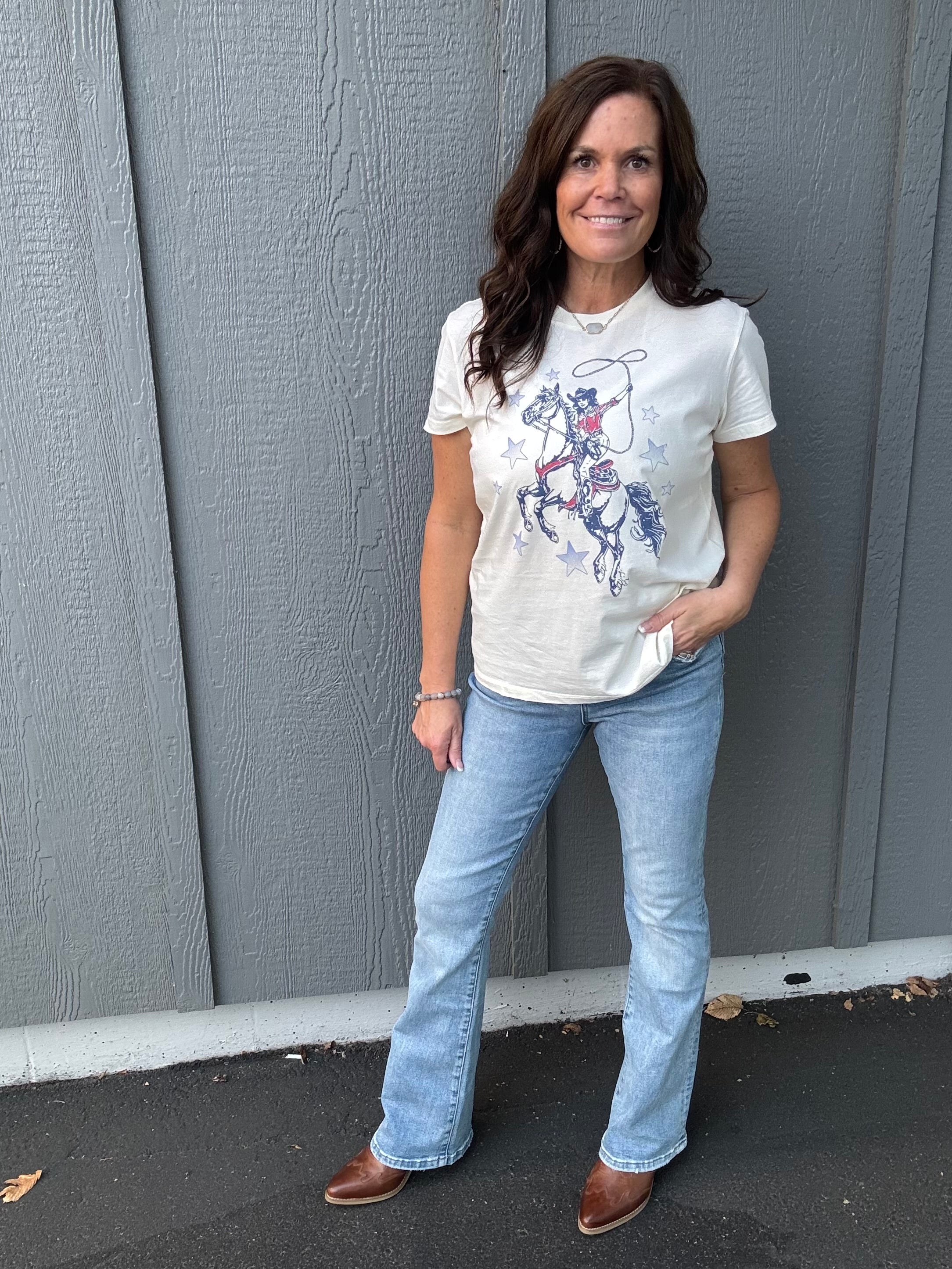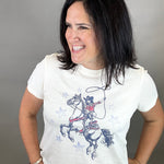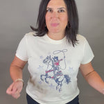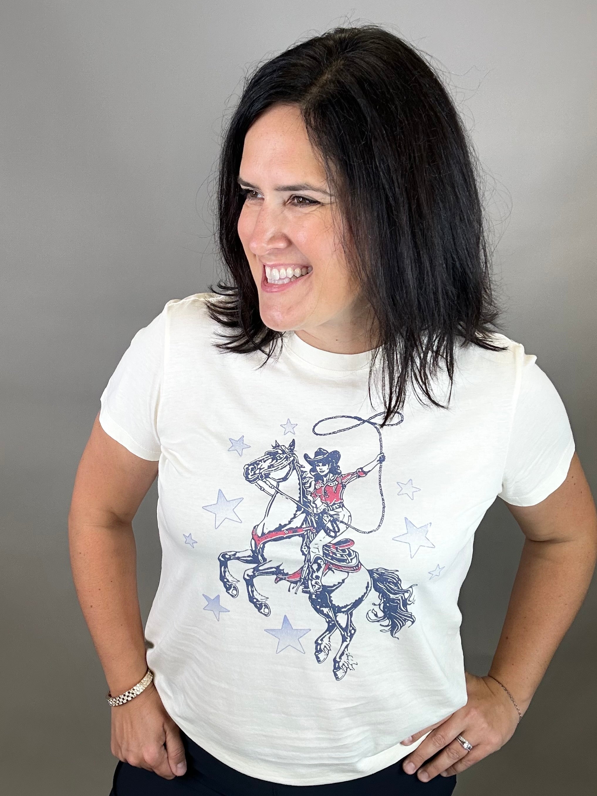 Bring a touch of western charm to your everyday style with the Cream Cowgirl Graphic Tee. Made from soft 100% cotton, this relaxed-fit tee is as comfortable as it is eye-catching. The bold cowgirl graphic—set in striking red and blue against a cream backdrop—makes it the perfect mix of playful and stylish.