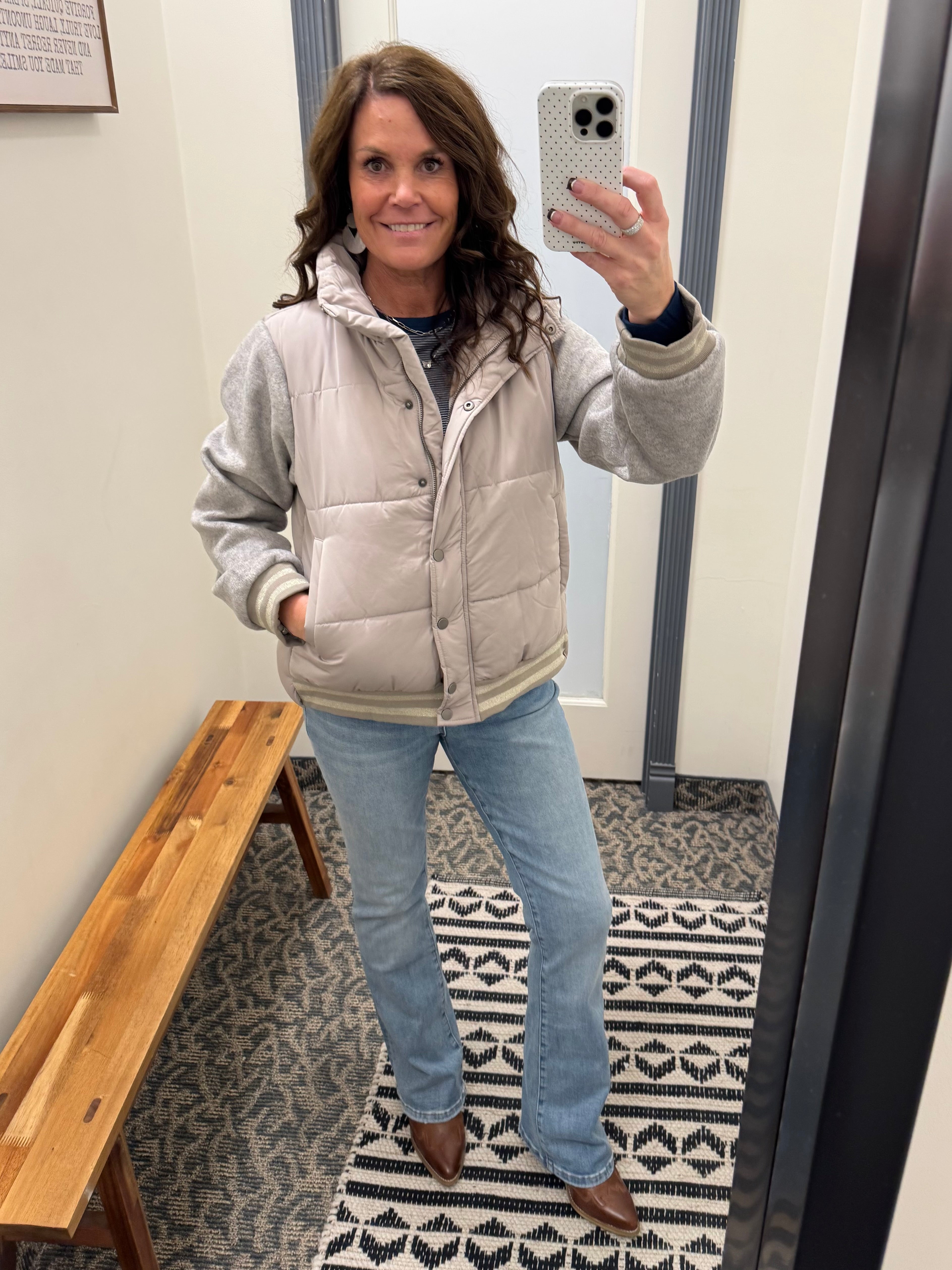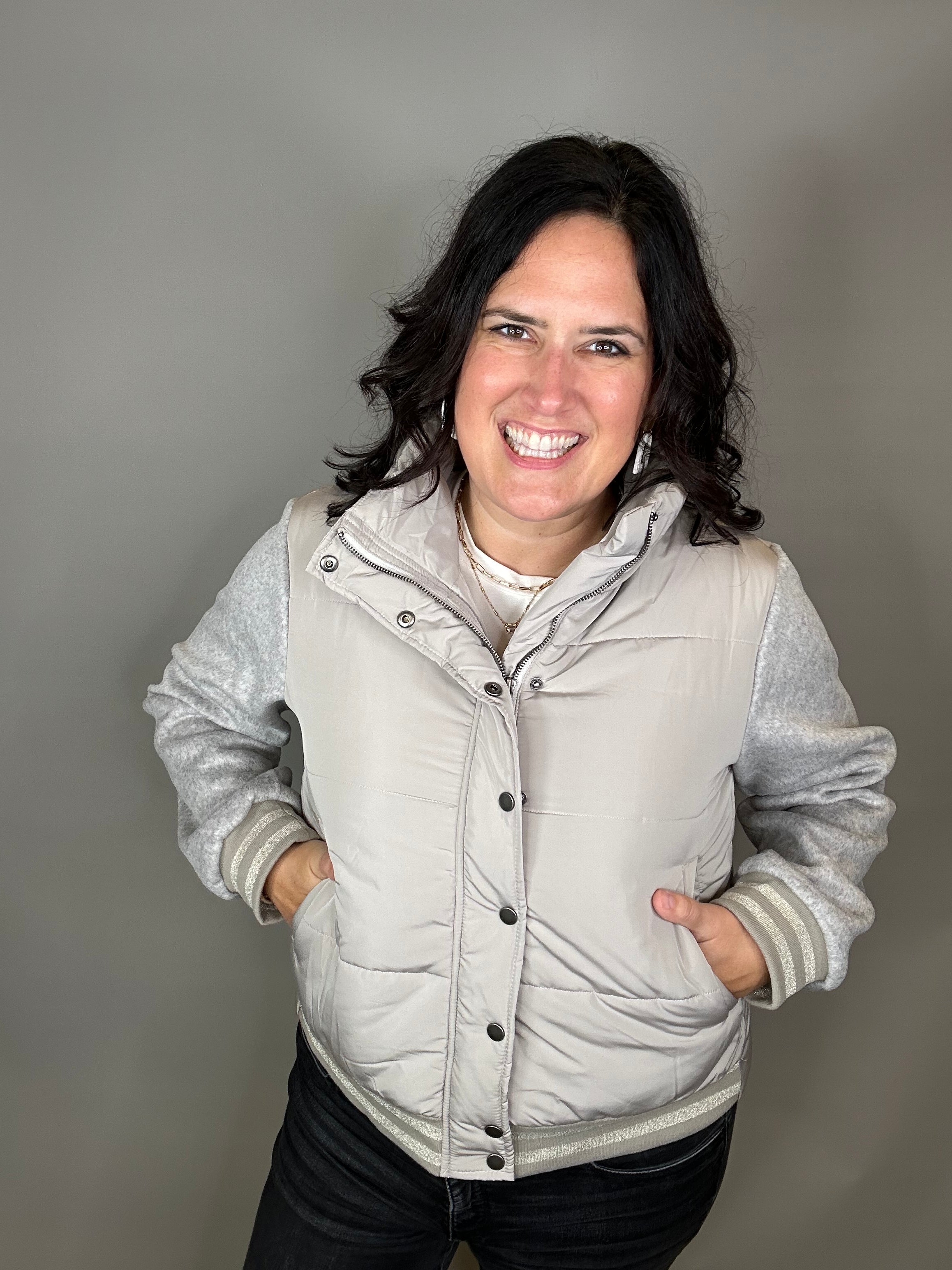 The Mixed Media Puffer Jacket from Mystree combines cozy warmth with modern edge. With its soft puffer body, wool-blend contrast panels, and striped glitter trim, this jacket brings sporty-chic energy to any outfit. Whether you’re running errands or heading out for a weekend adventure, it’s the perfect balance of comfort and statement style.