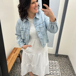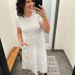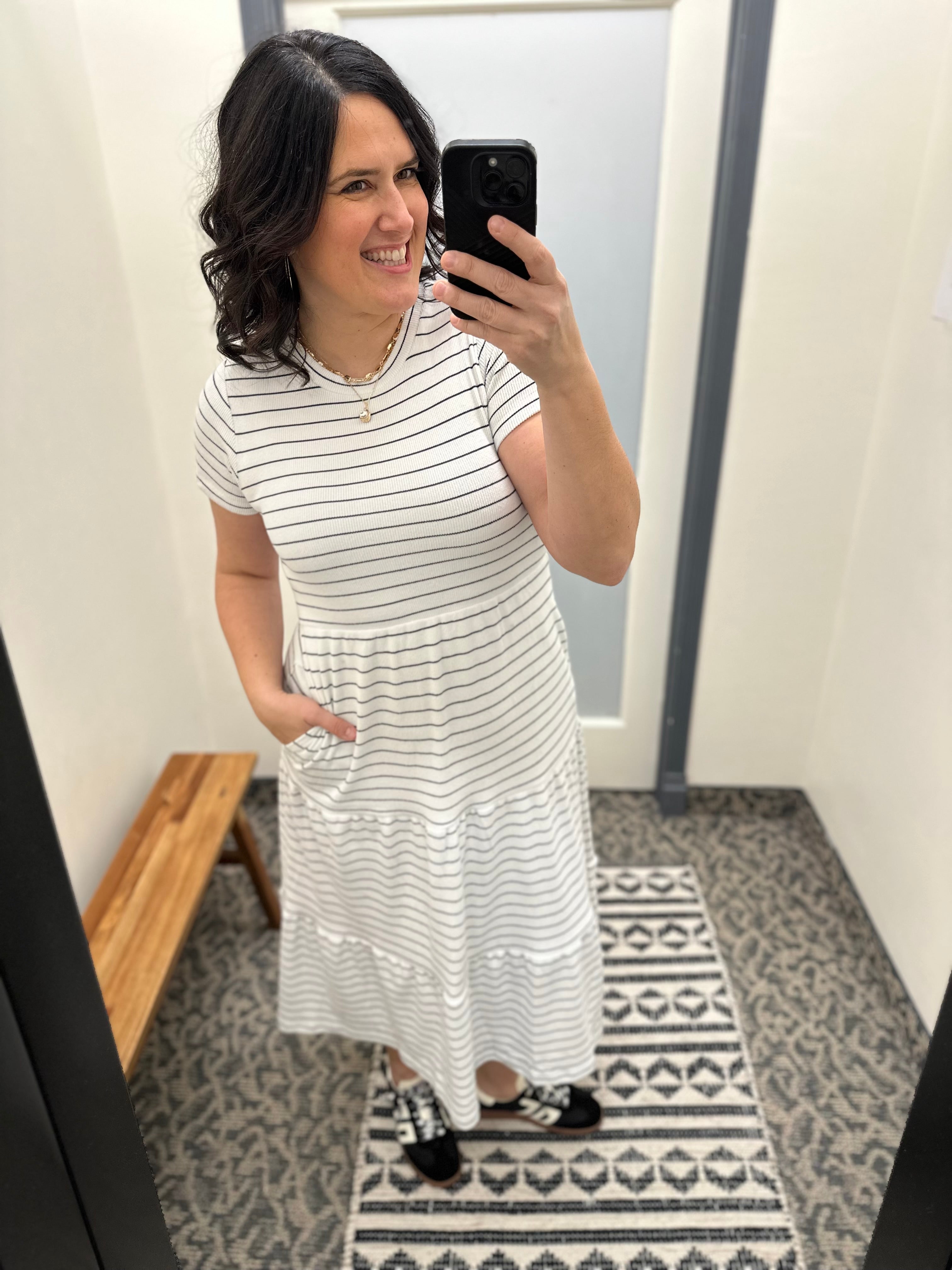 Easy, comfortable, and effortlessly cute—the Ashby Tiered Striped Dress by Flag & Anthem is the kind of piece you'll find yourself reaching for week after week. Featuring classic black stripes, a flattering tiered silhouette, and the softest stretchy fabric, this dress combines everyday comfort with timeless style.