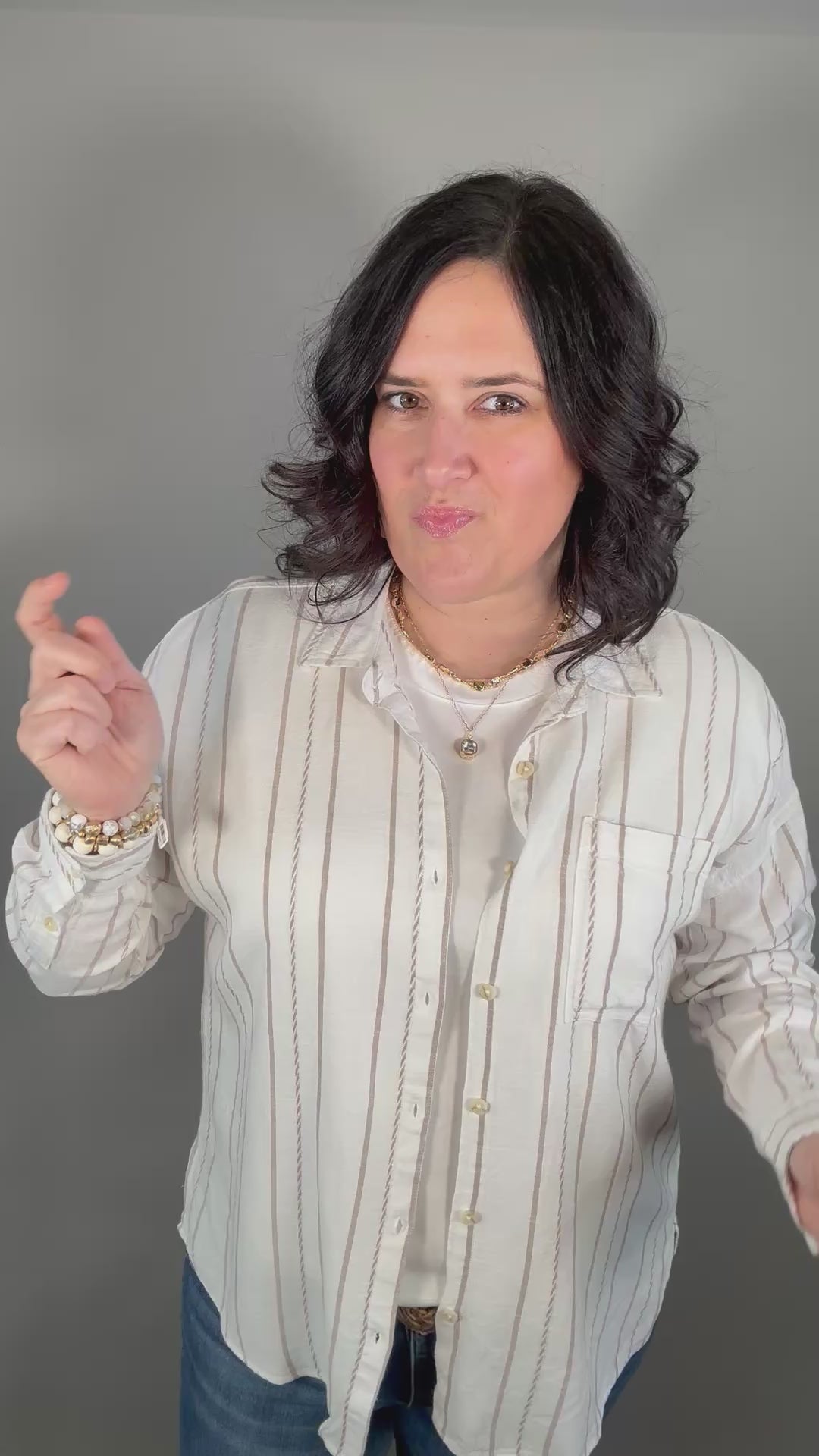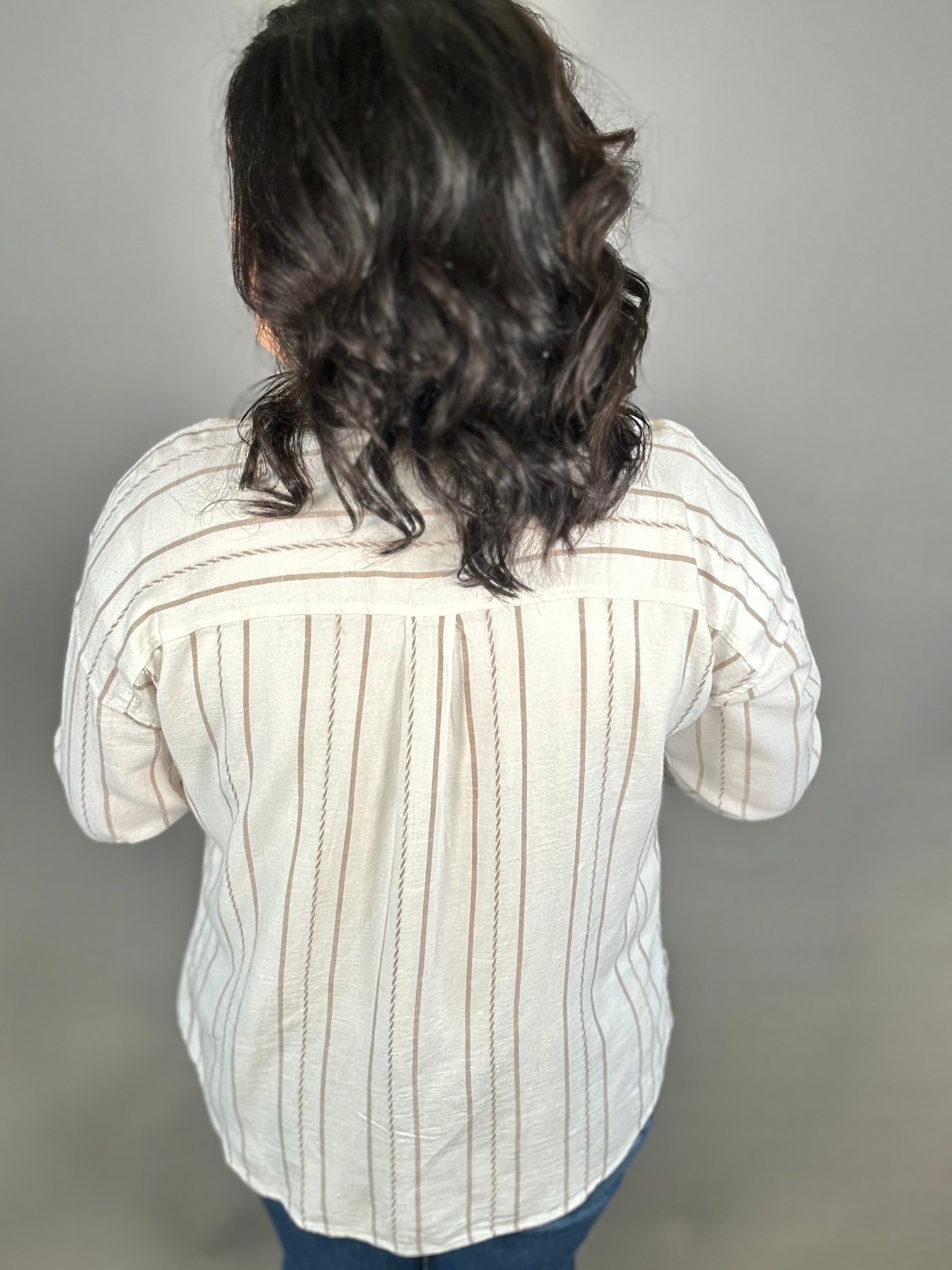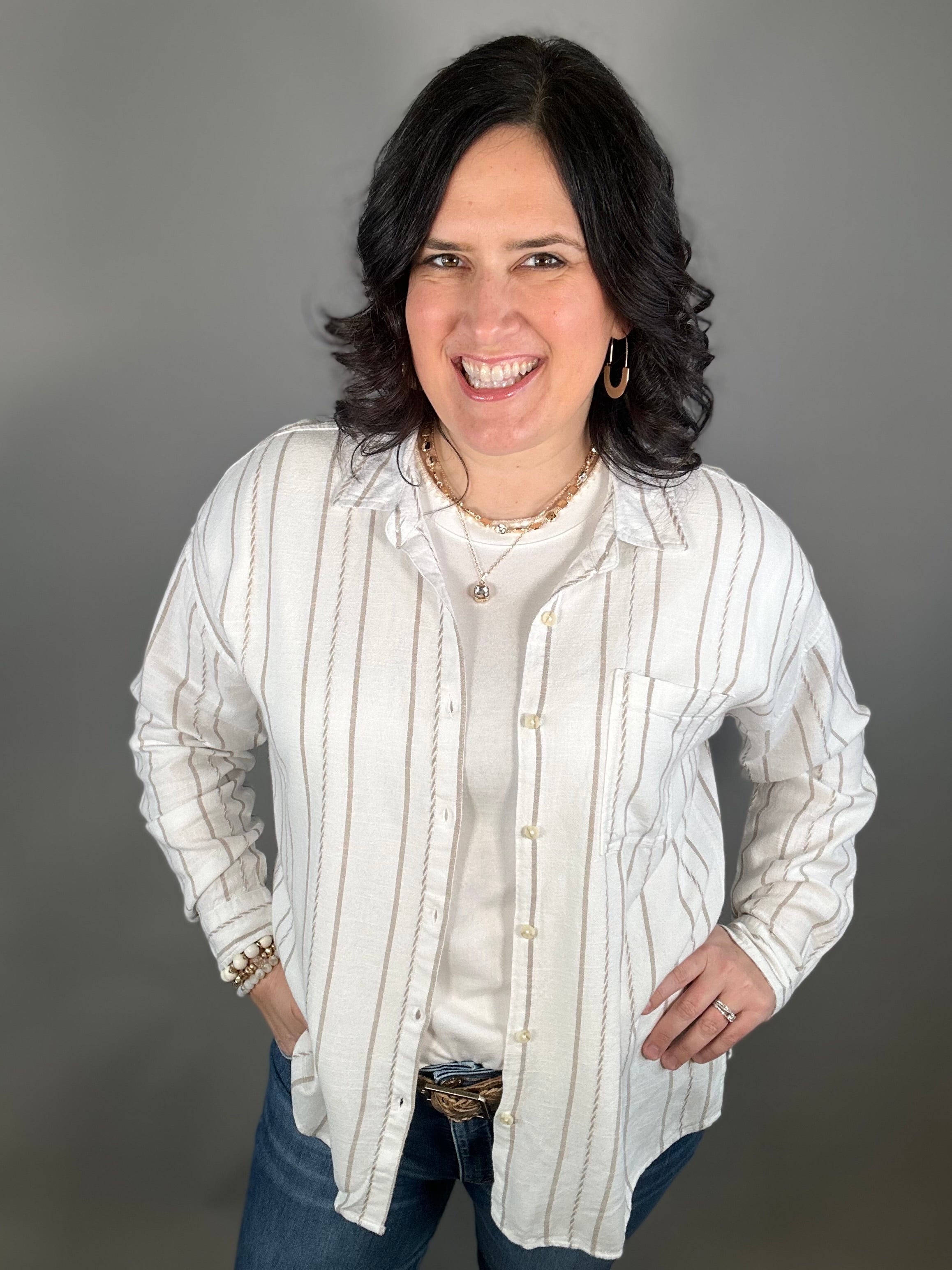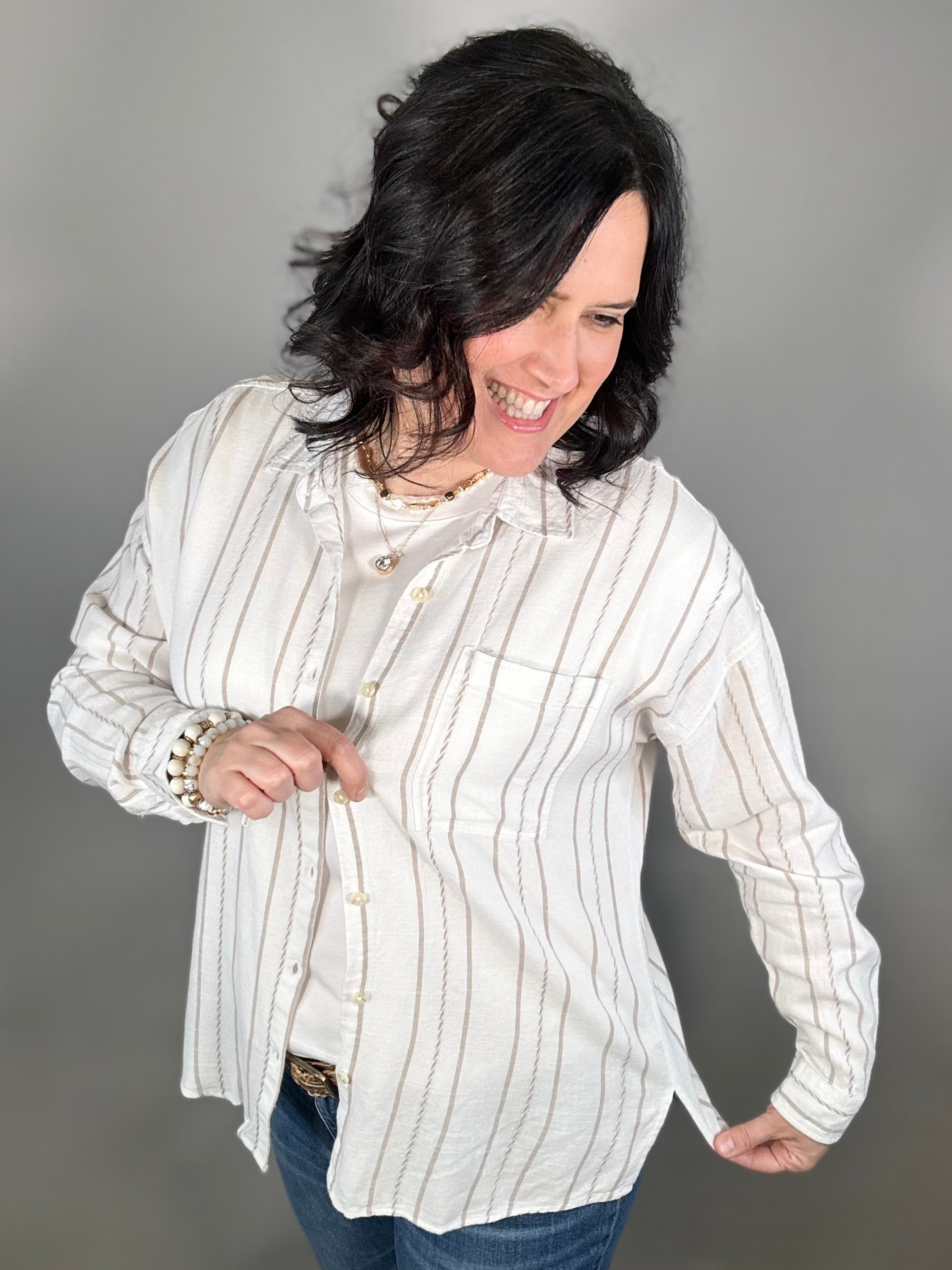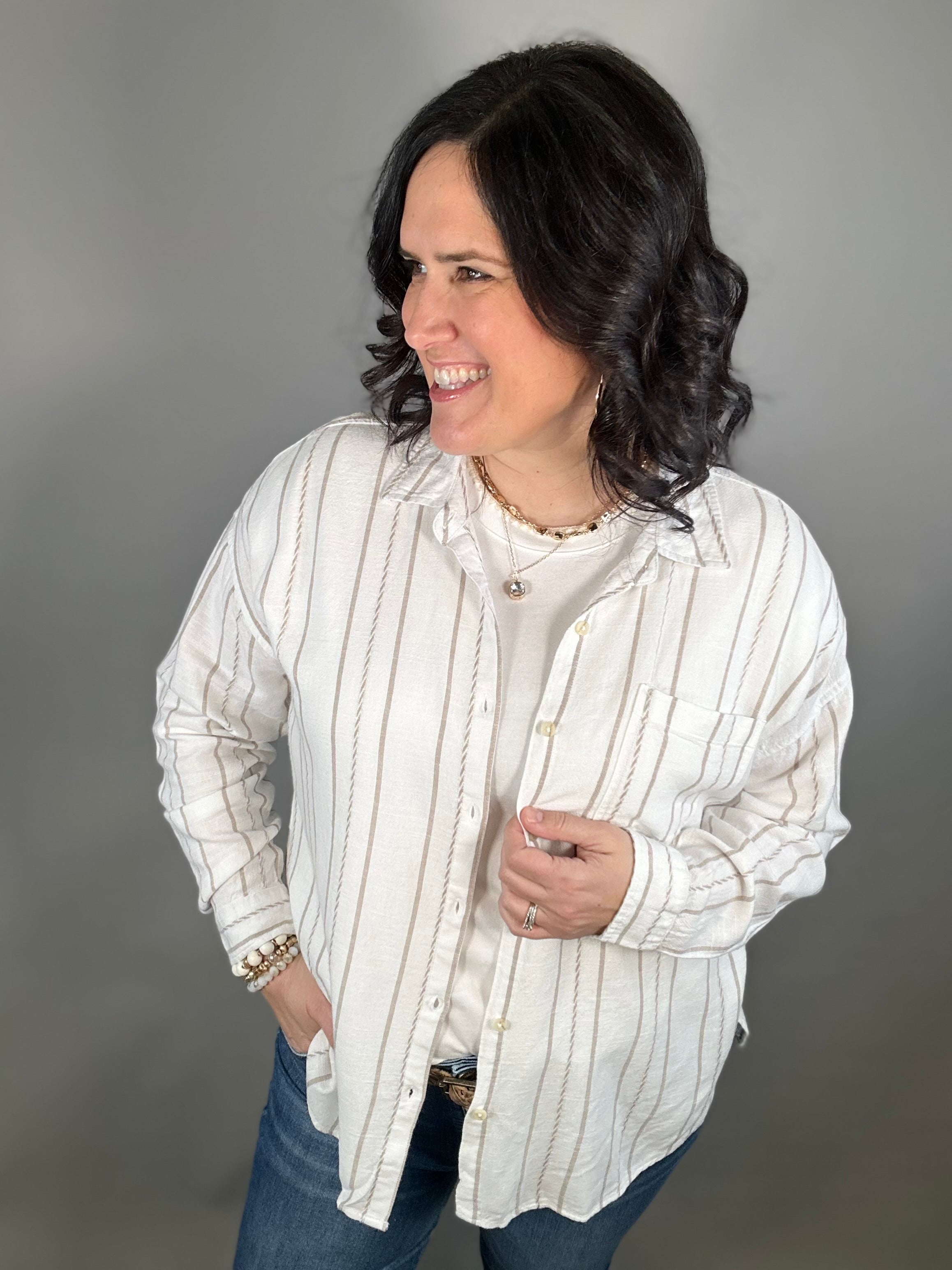 Easy, breezy, and effortlessly cool—the Amorette Shirt by Thread & Supply is the kind of top you’ll reach for all season long. Designed with a relaxed, beachy vibe, this lightweight button-up features soft ivory and taupe stripes that create a timeless, coastal-inspired look. The flowy silhouette drapes beautifully, giving you that laid-back feel while still looking polished and put together.