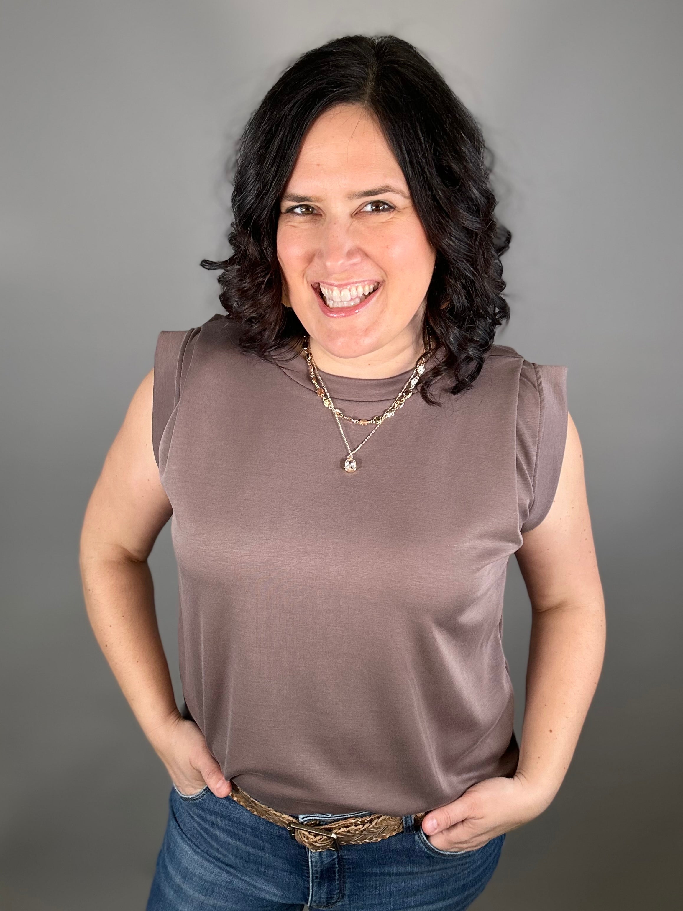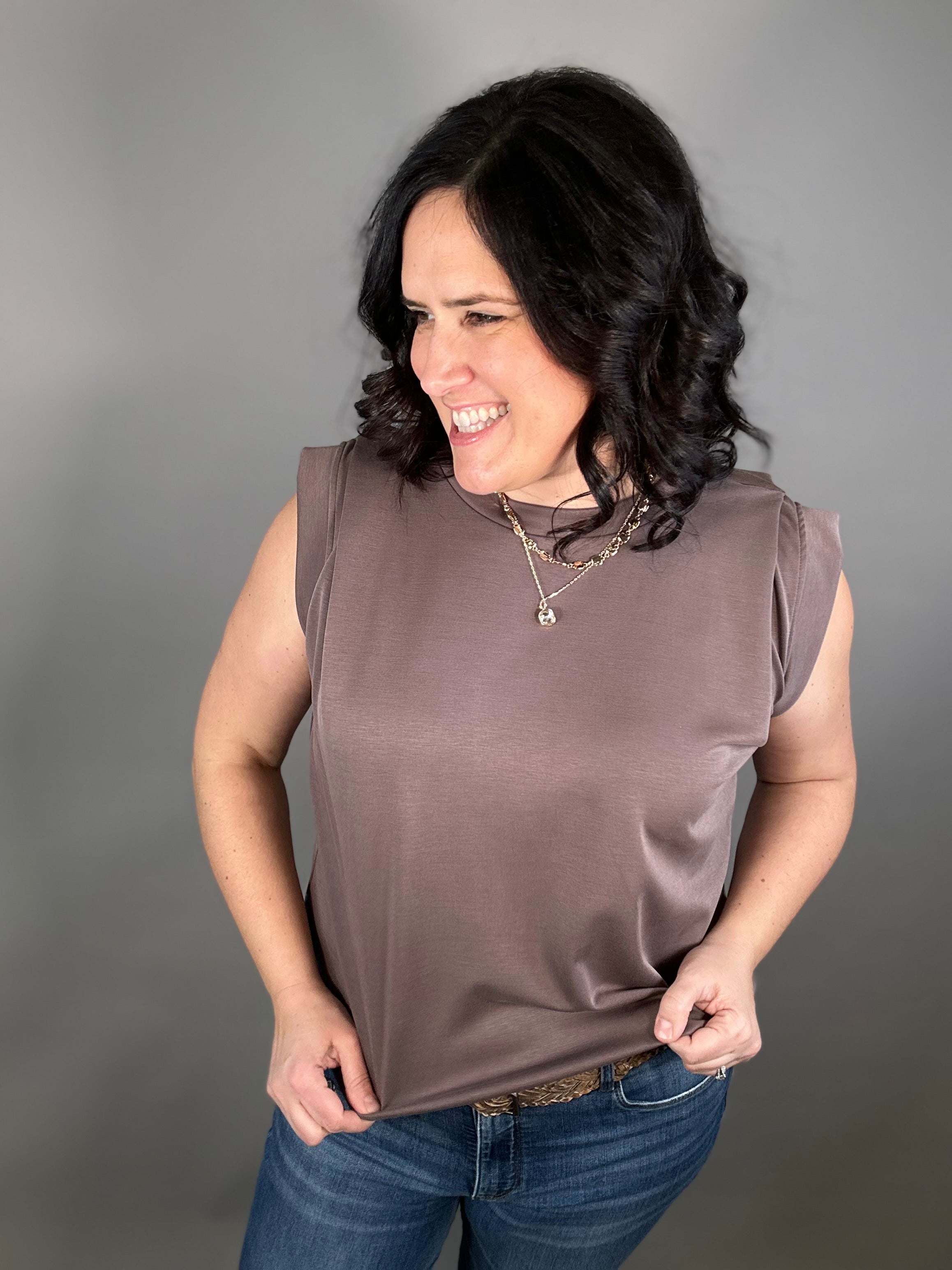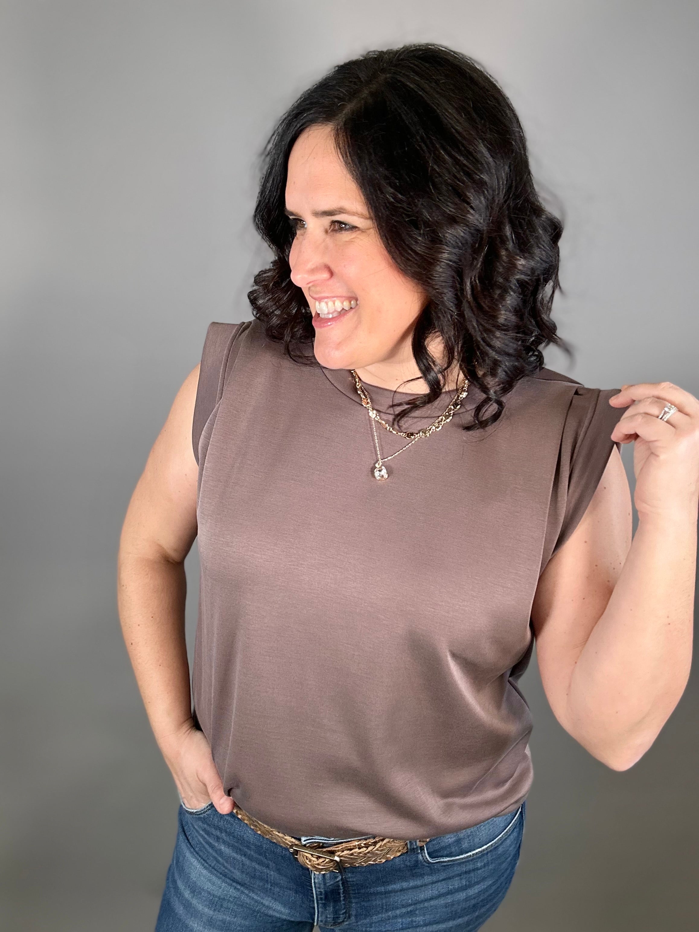 The tucked shoulder detail adds a subtle, stylish touch that instantly elevates this everyday piece. With its flowy fit and easy drape, this top moves beautifully and feels effortless to wear from morning errands to dinner out.