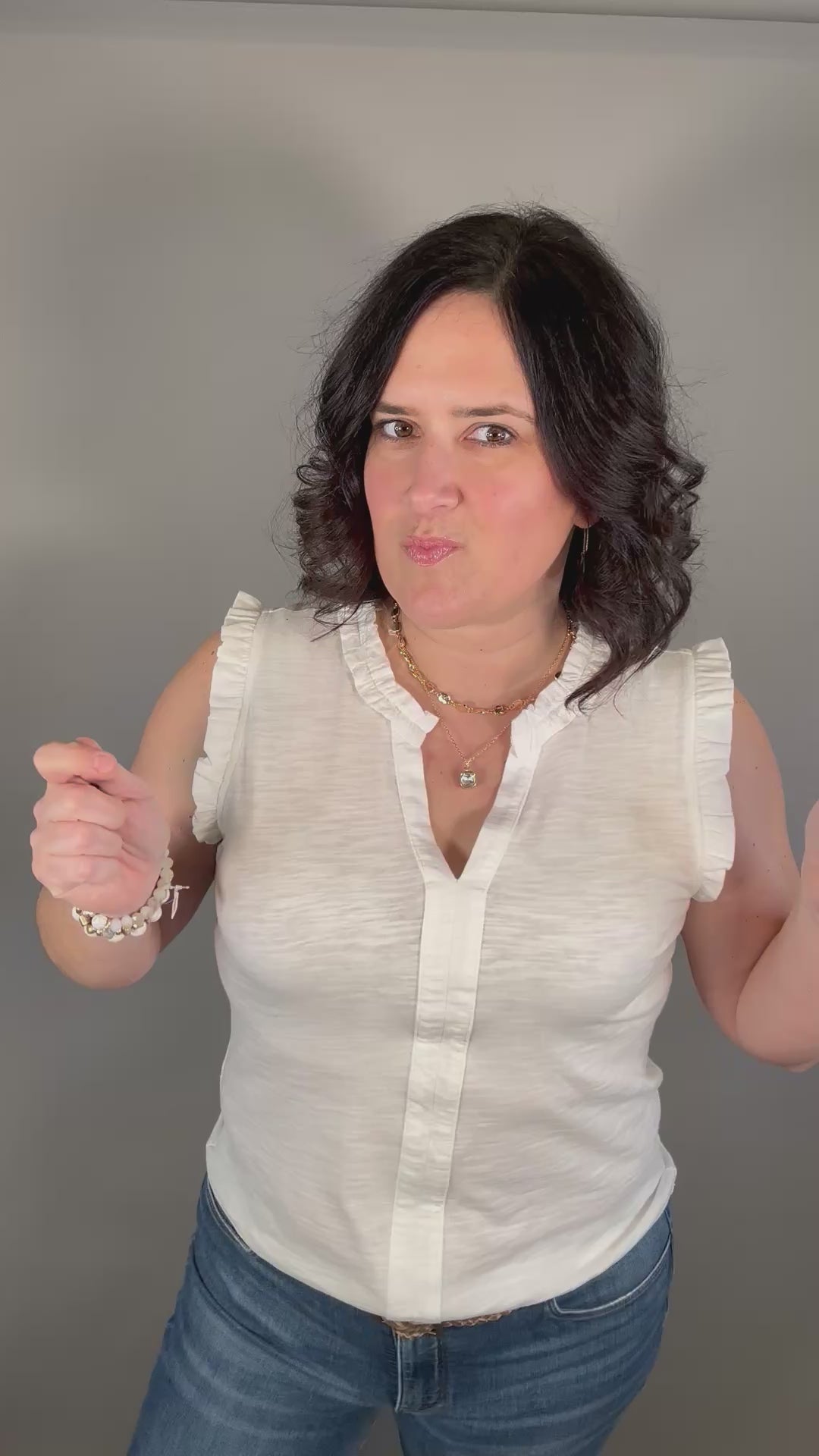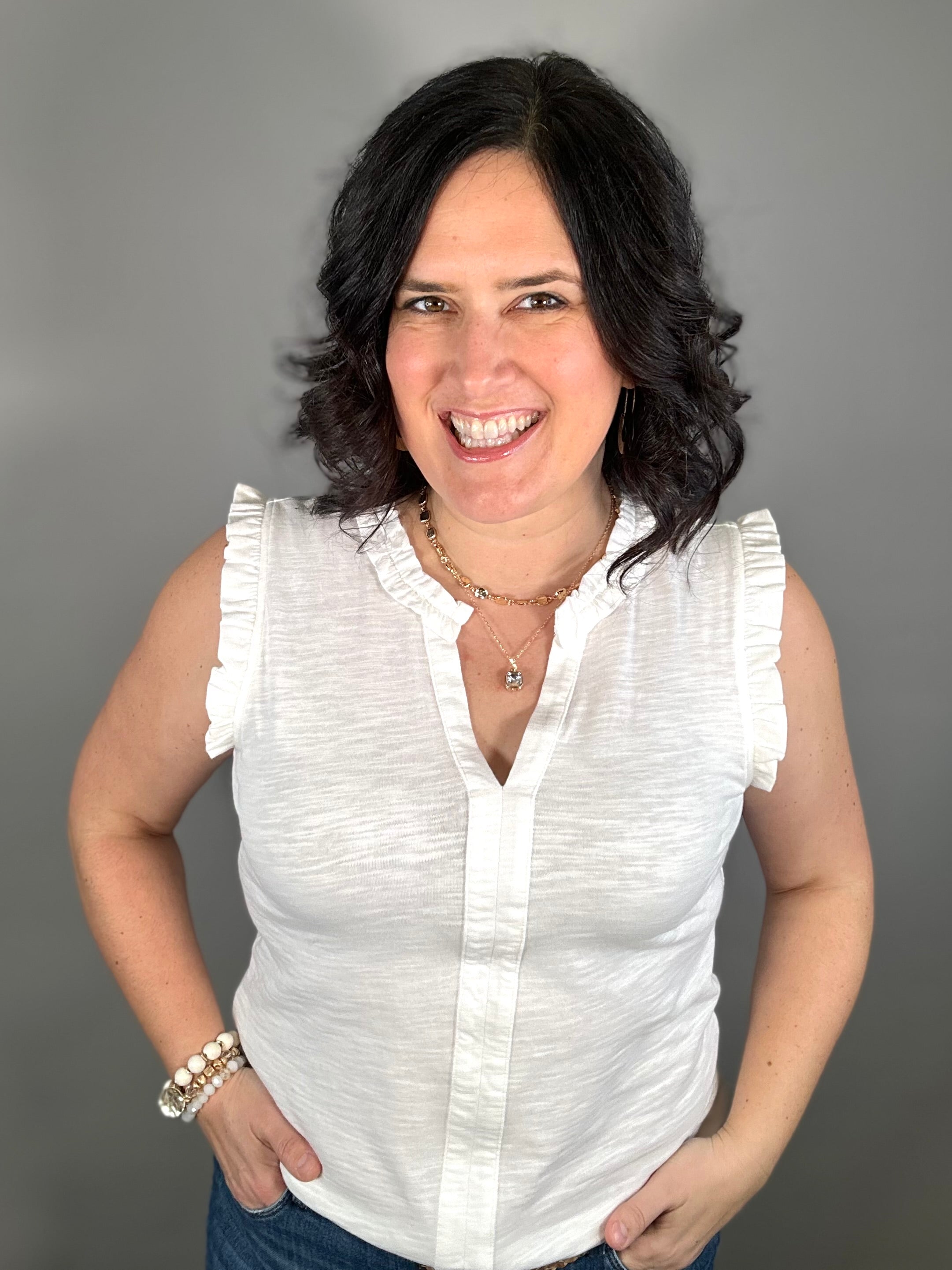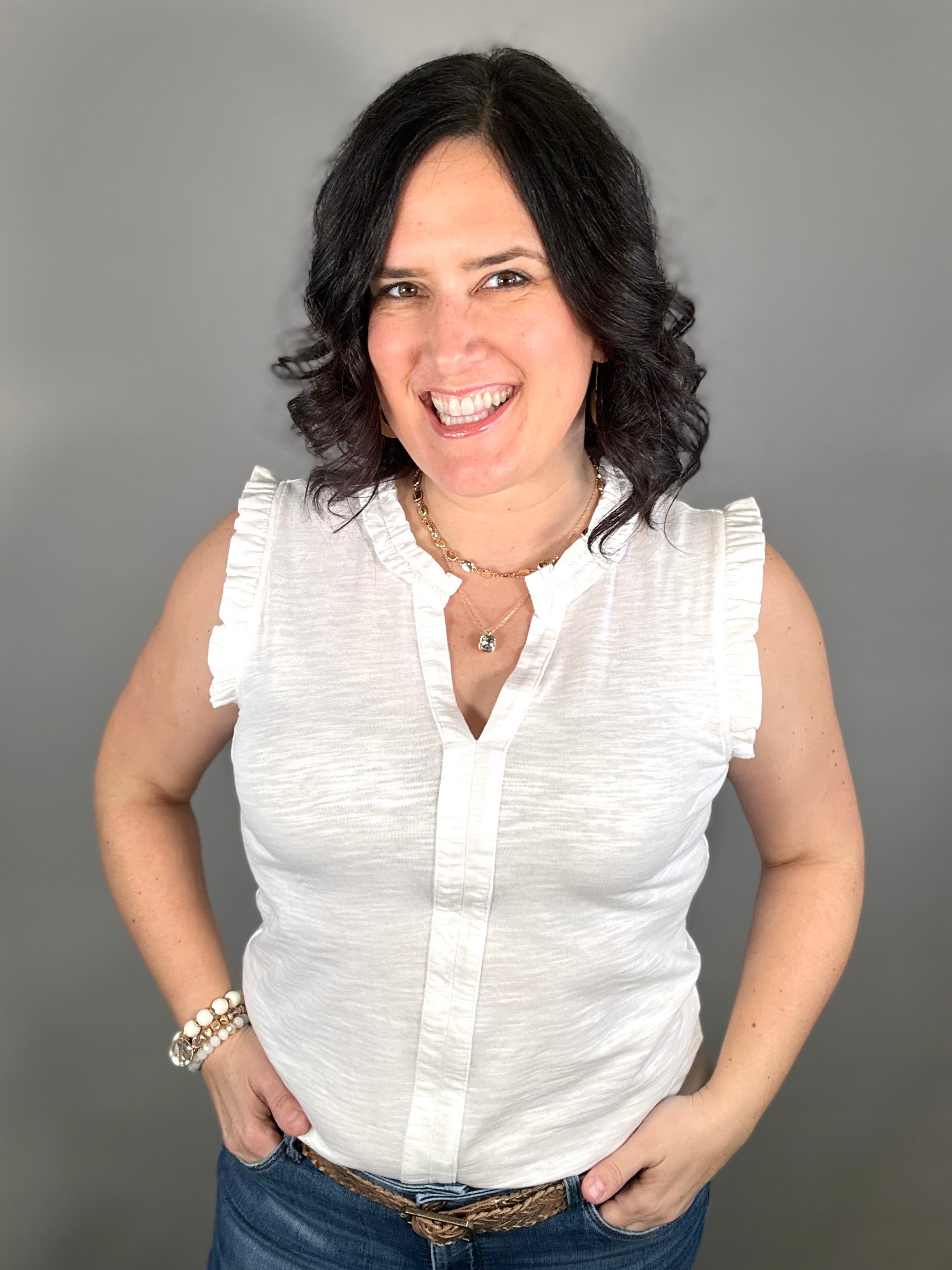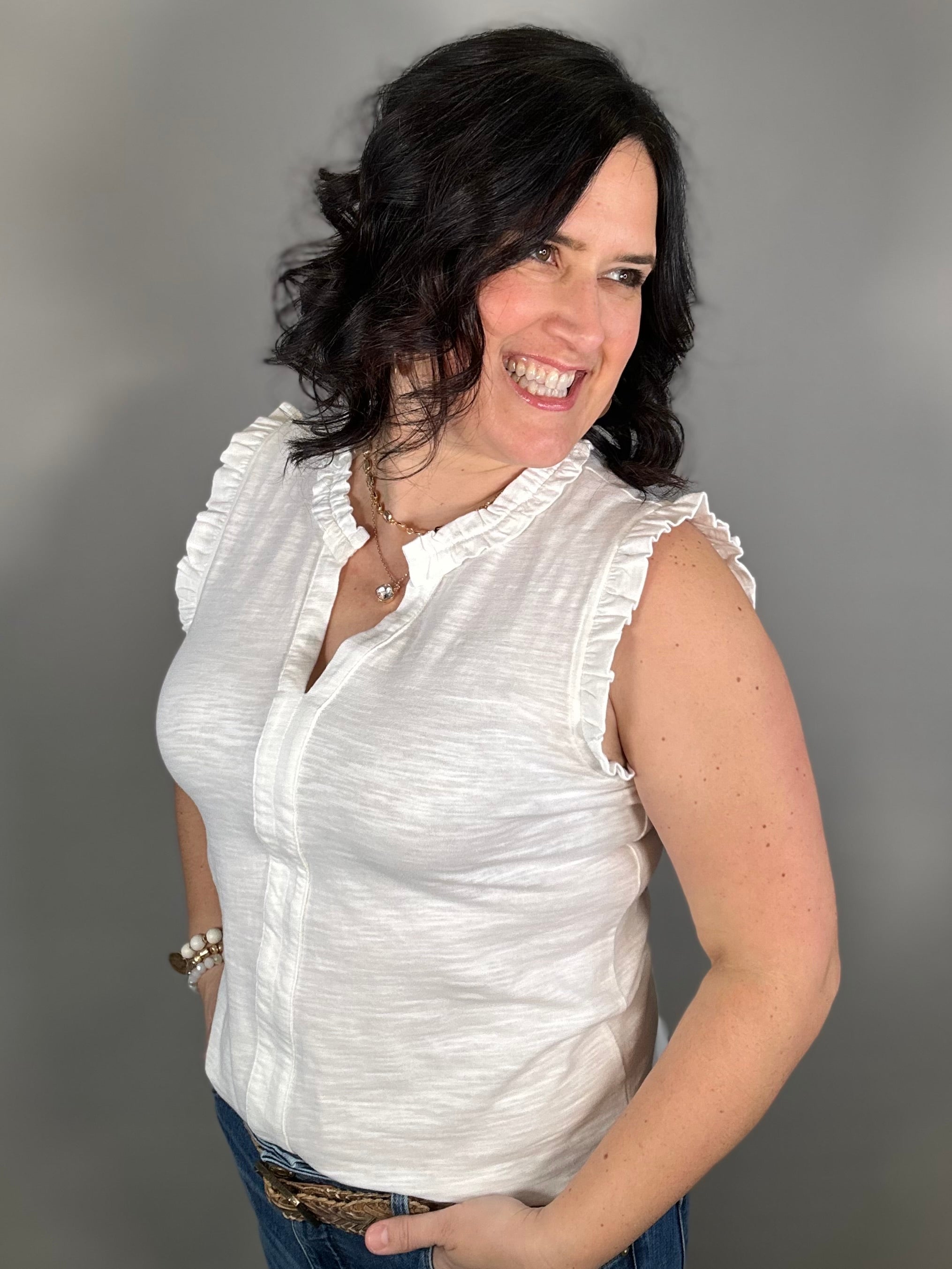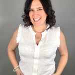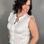 The split V-neckline with delicate frill detail adds a touch of charm, while the sleeveless design keeps the look easy and comfortable. Whether you’re dressing it up for a lunch date or keeping it casual for everyday errands, this versatile top pairs beautifully with everything from denim to shorts.