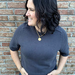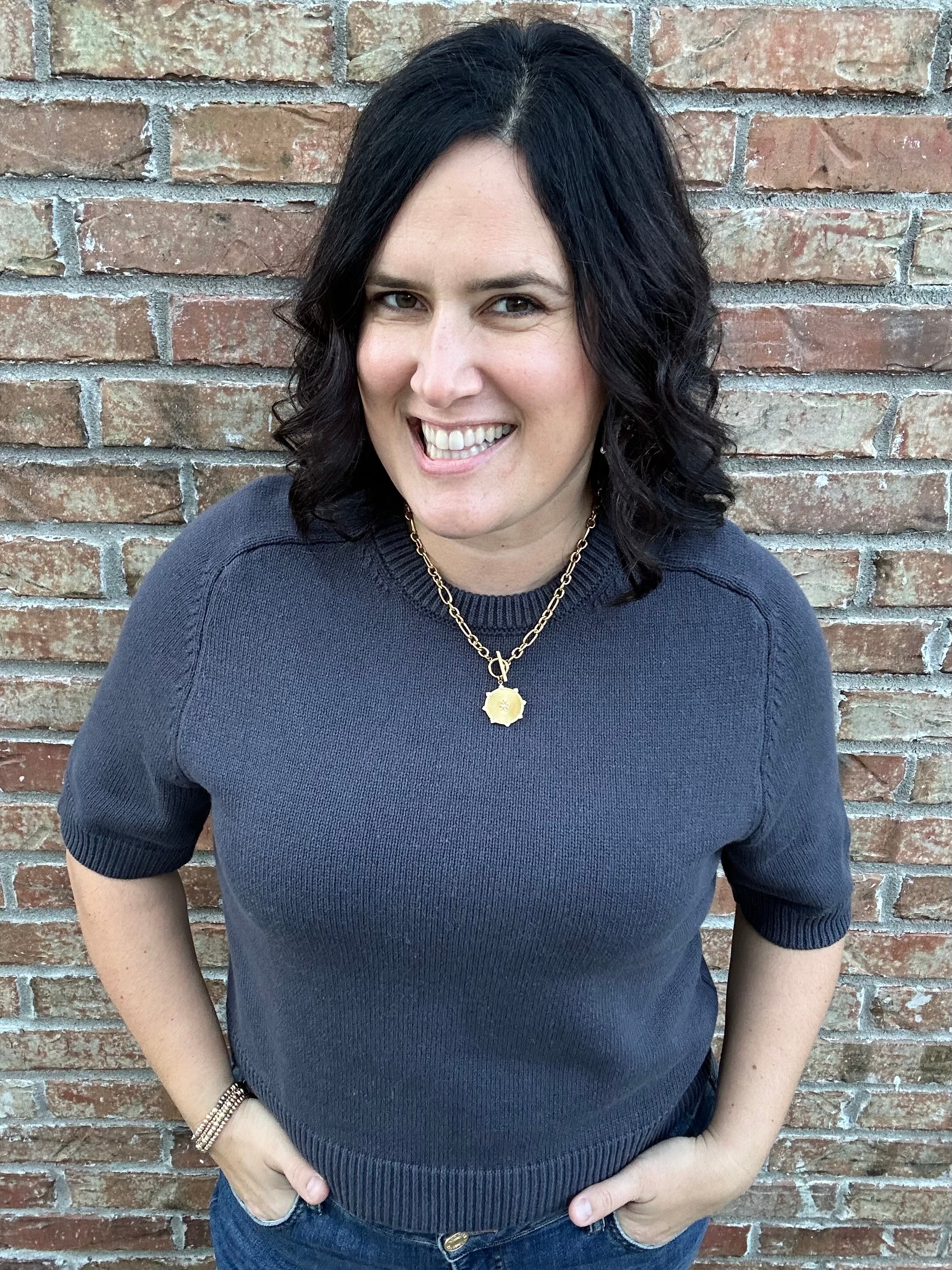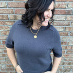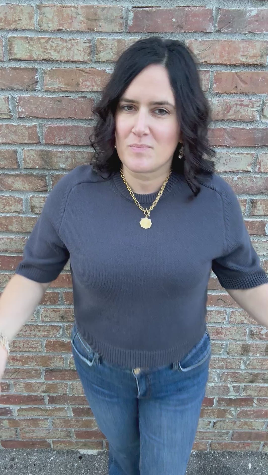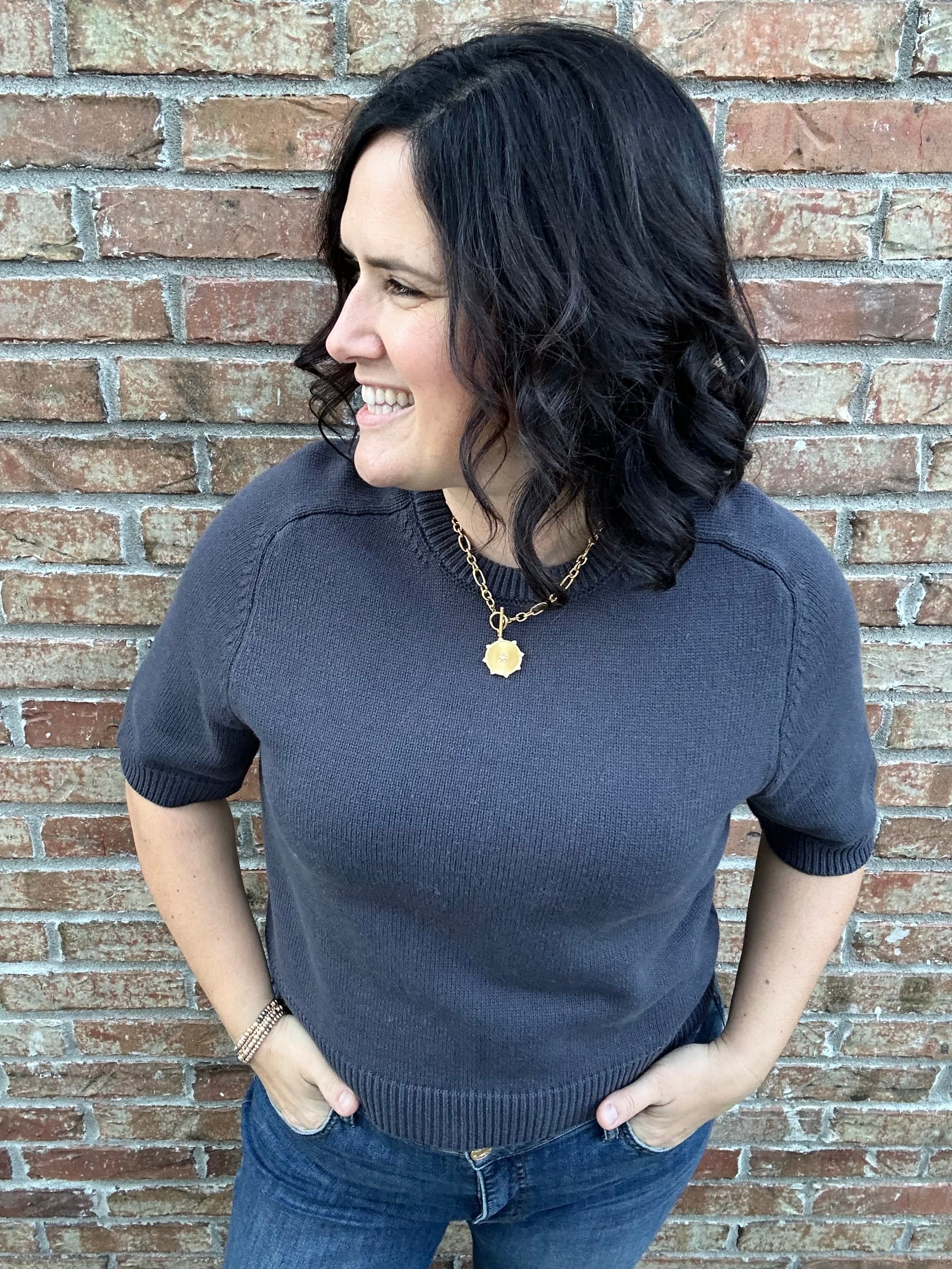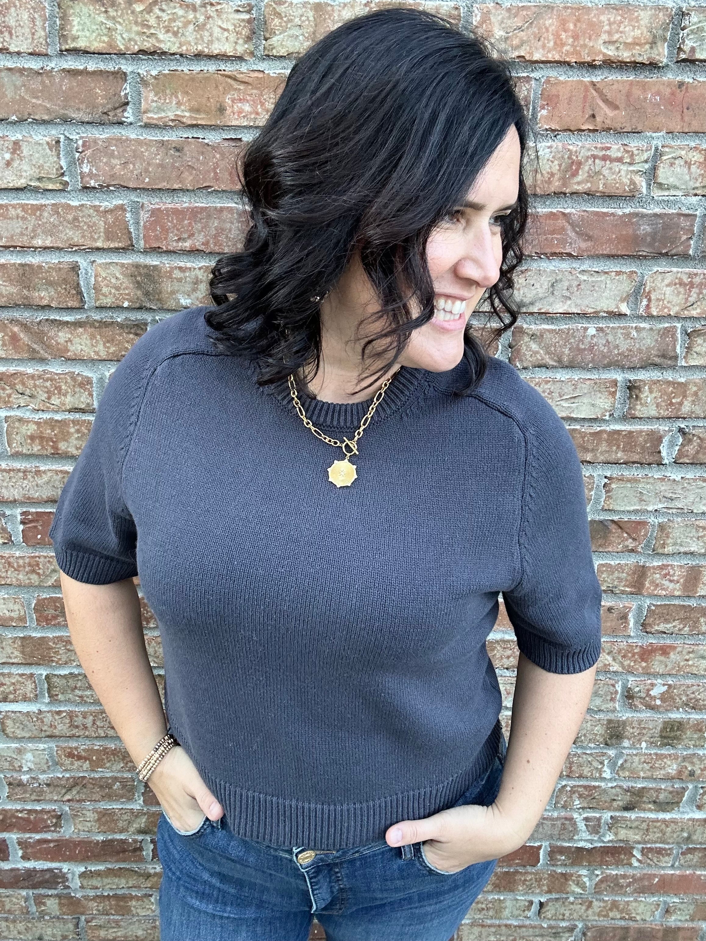 Simple, soft, and effortlessly chic — the Charcoal Short Sleeve Sweater Top by Star Drop is the elevated basic your wardrobe’s been waiting for. Designed with a cozy sweater knit and a modern boxy silhouette, it brings comfort and polish to your everyday rotation.