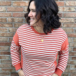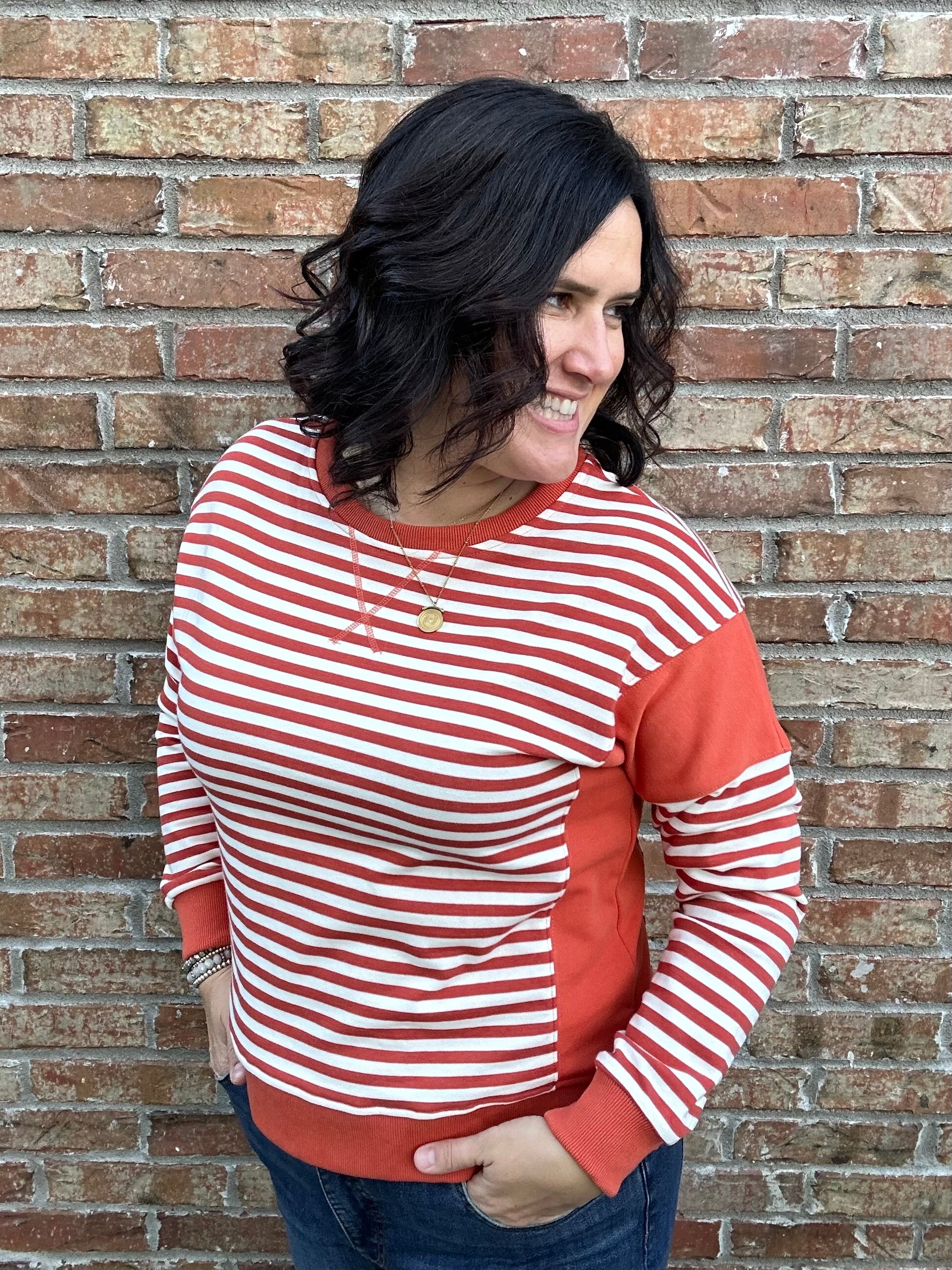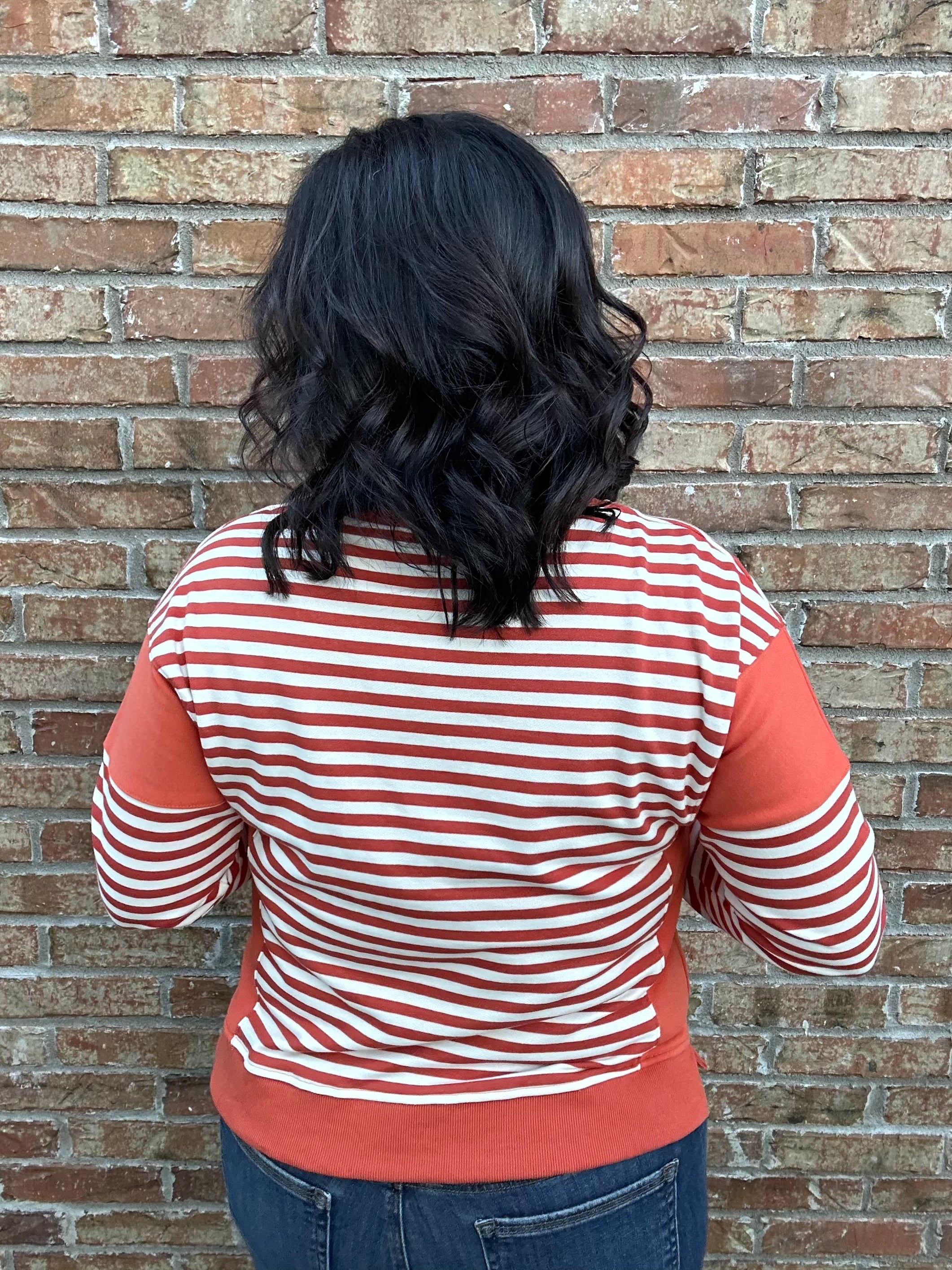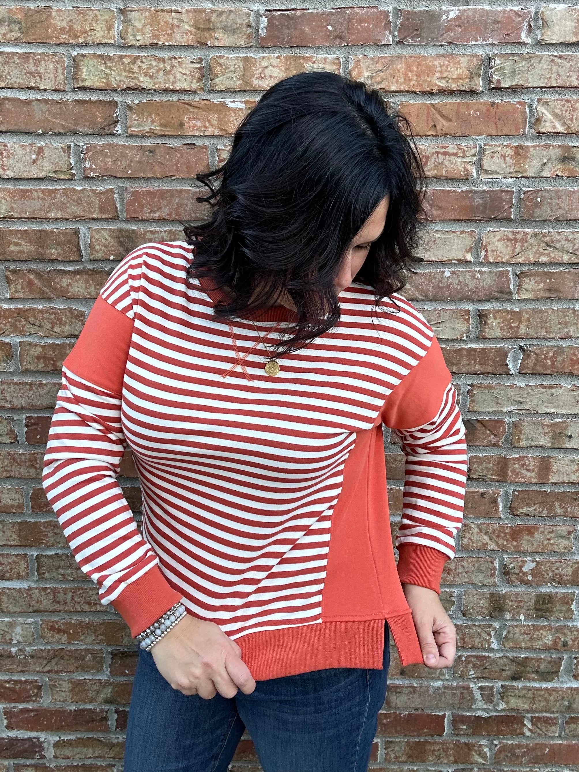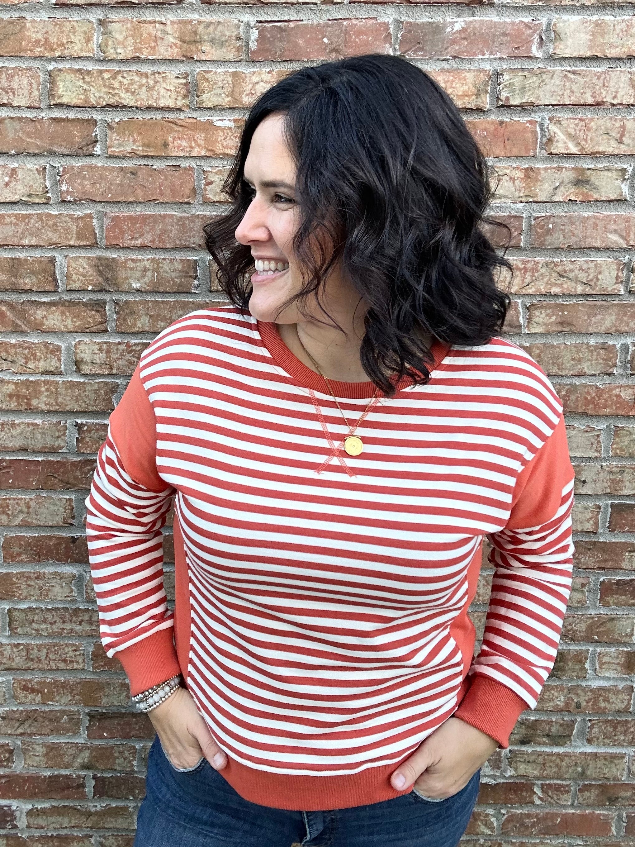 Brighten your wardrobe with the Tangerine Striped Sweatshirt, a playful yet polished take on everyday comfort. With its soft French terry fabric and cheerful tangerine-and-ivory stripes, this sweatshirt adds a fresh pop of color to your casual lineup.