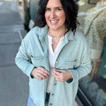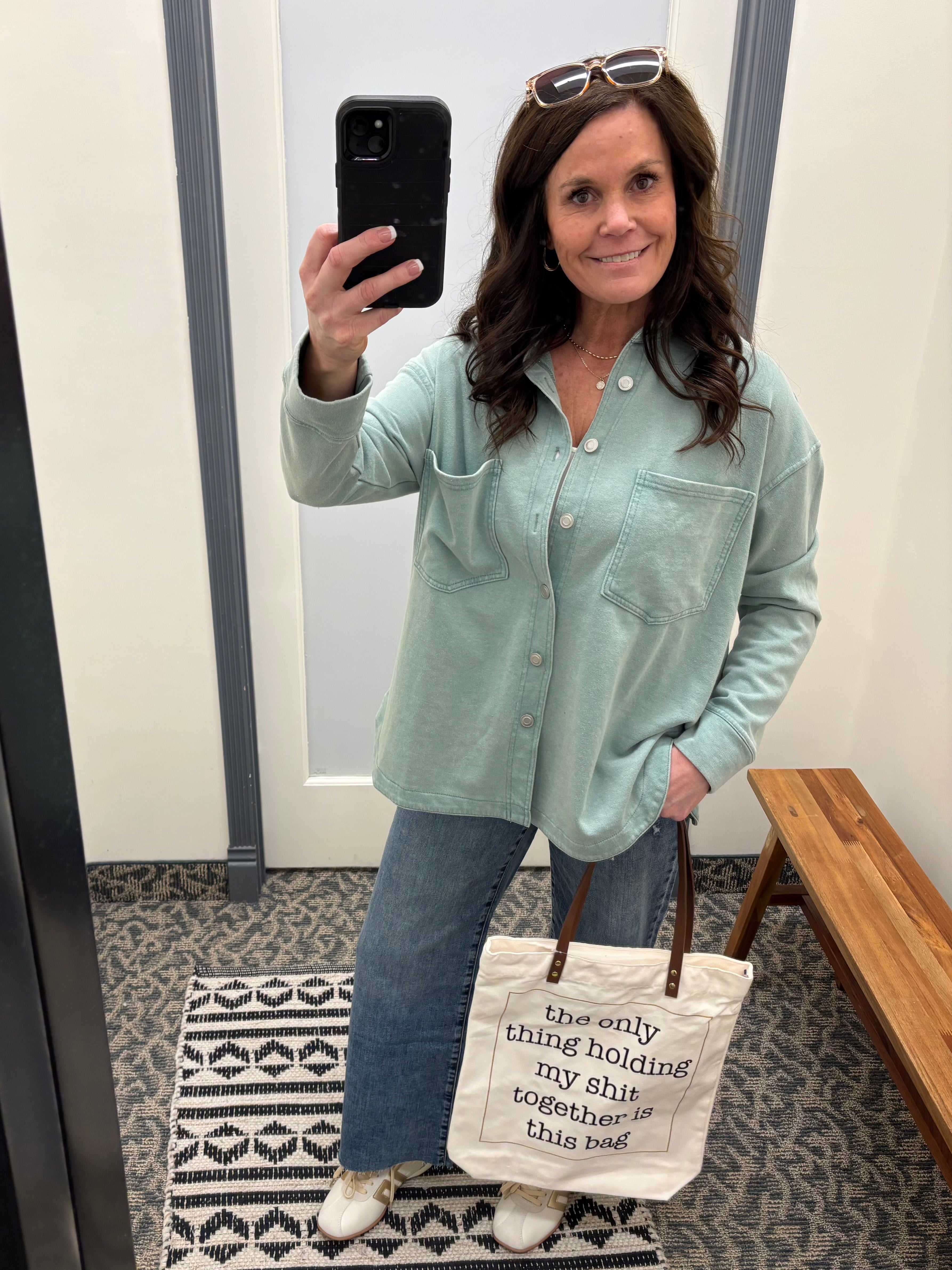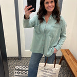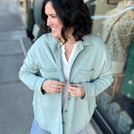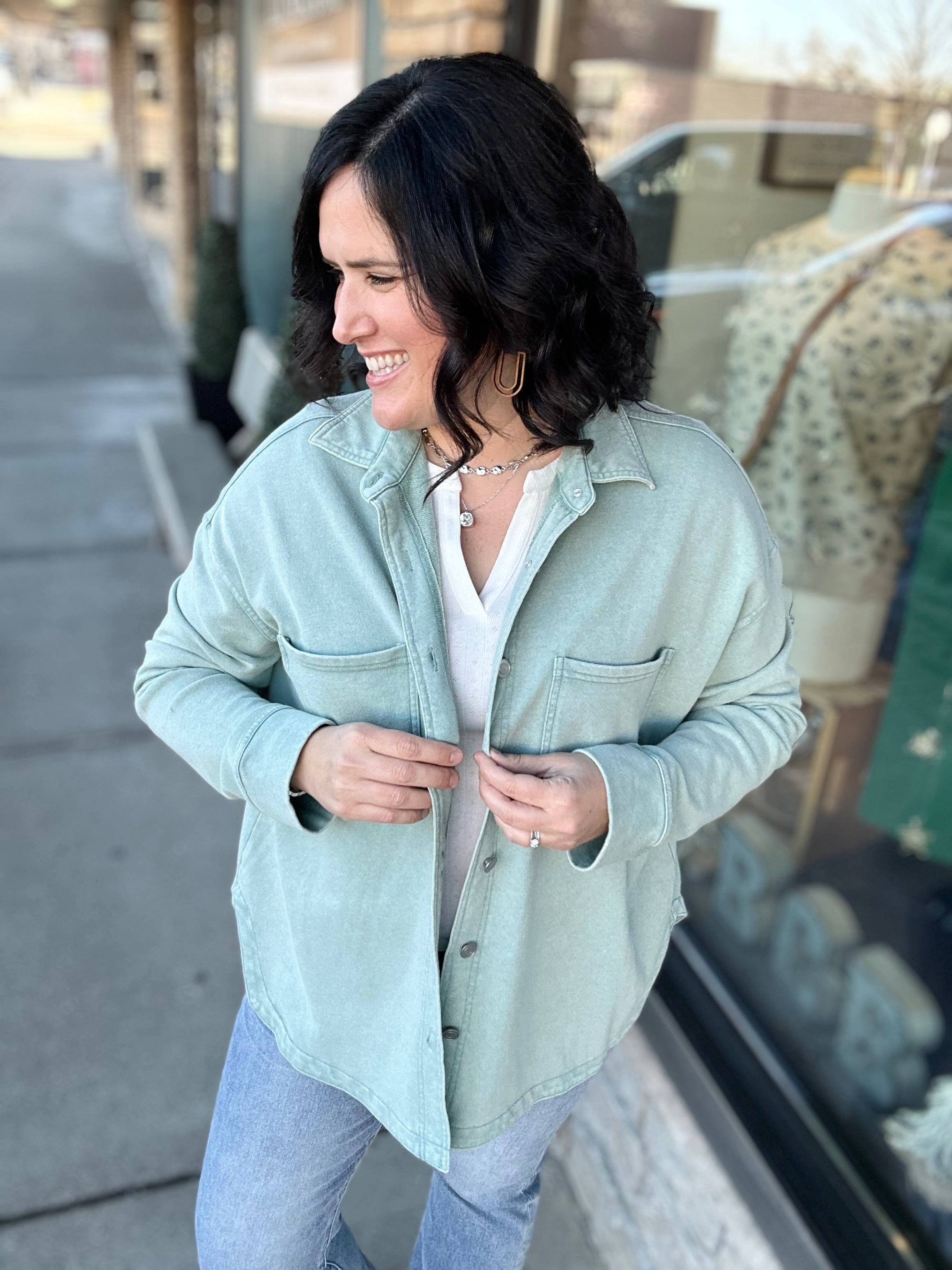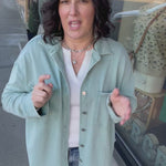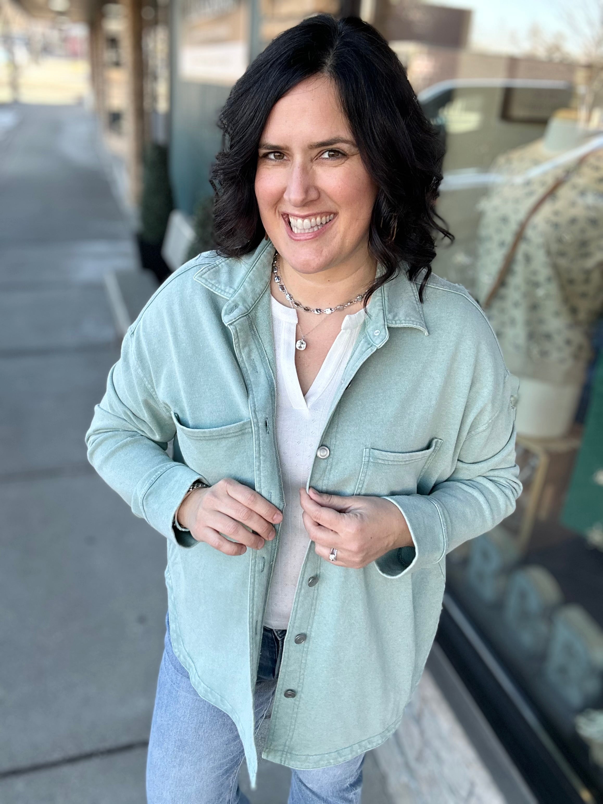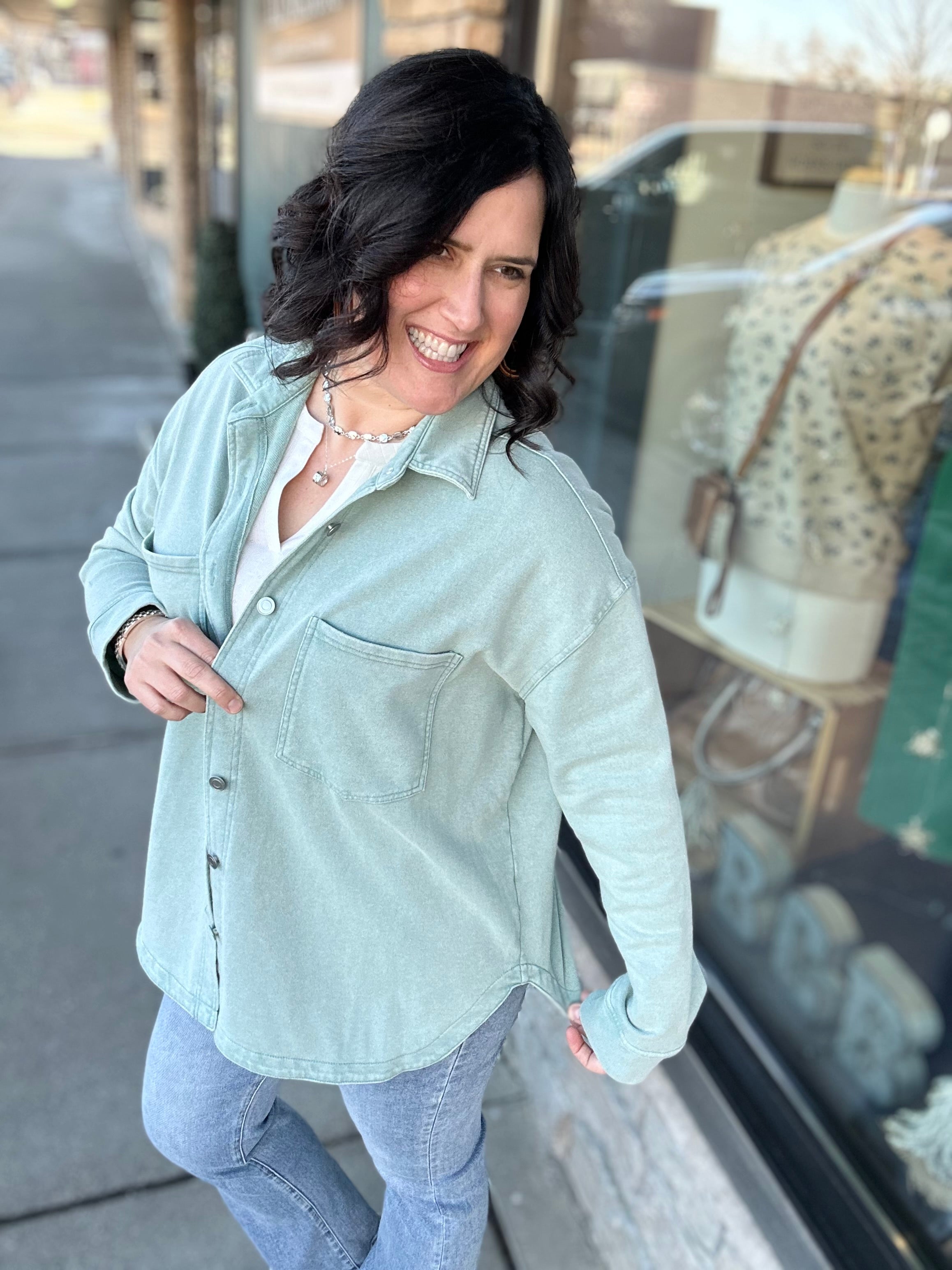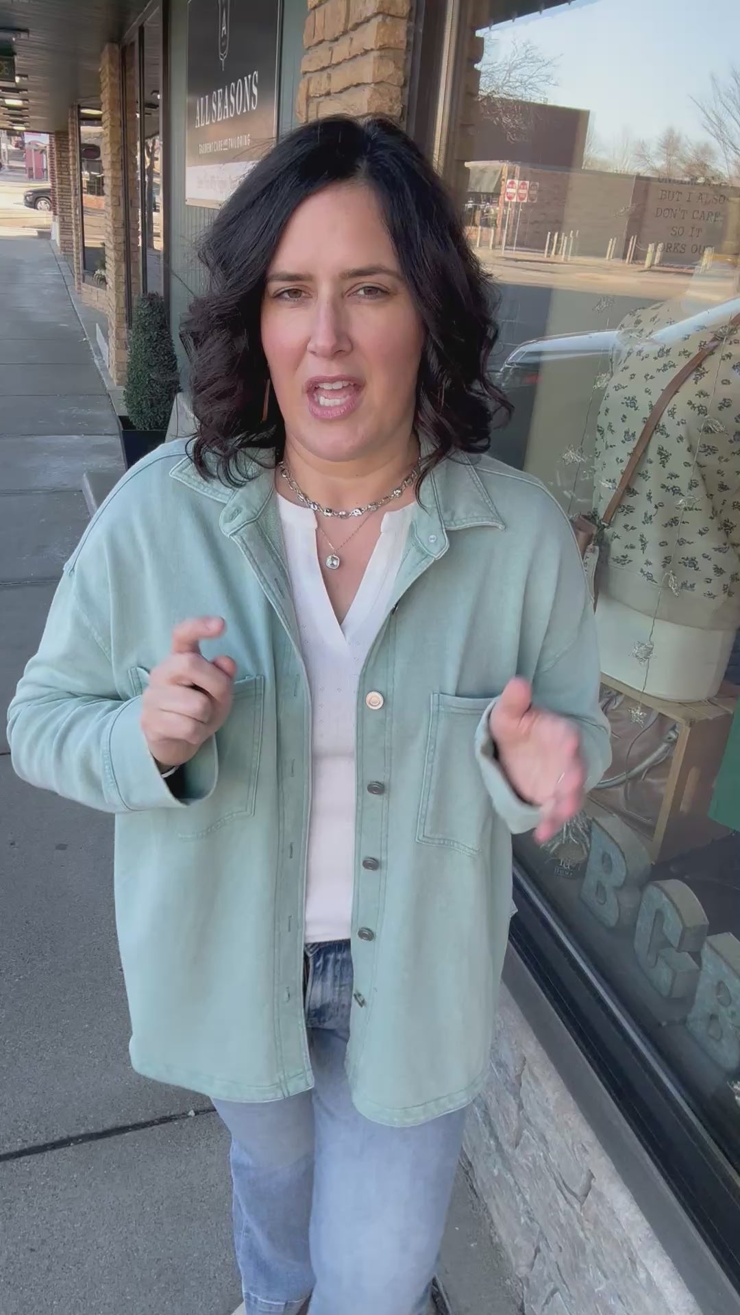 This is the definition of easy, throw-on-and-go style. Our Dusty Mint Washed Button-Up Top features a relaxed, slightly oversized fit with a soft washed sweatshirt feel that’s lightweight and incredibly comfortable. Finished with silver buttons and dual chest pockets, it gives you that casual, lived-in look while still feeling polished and put together.