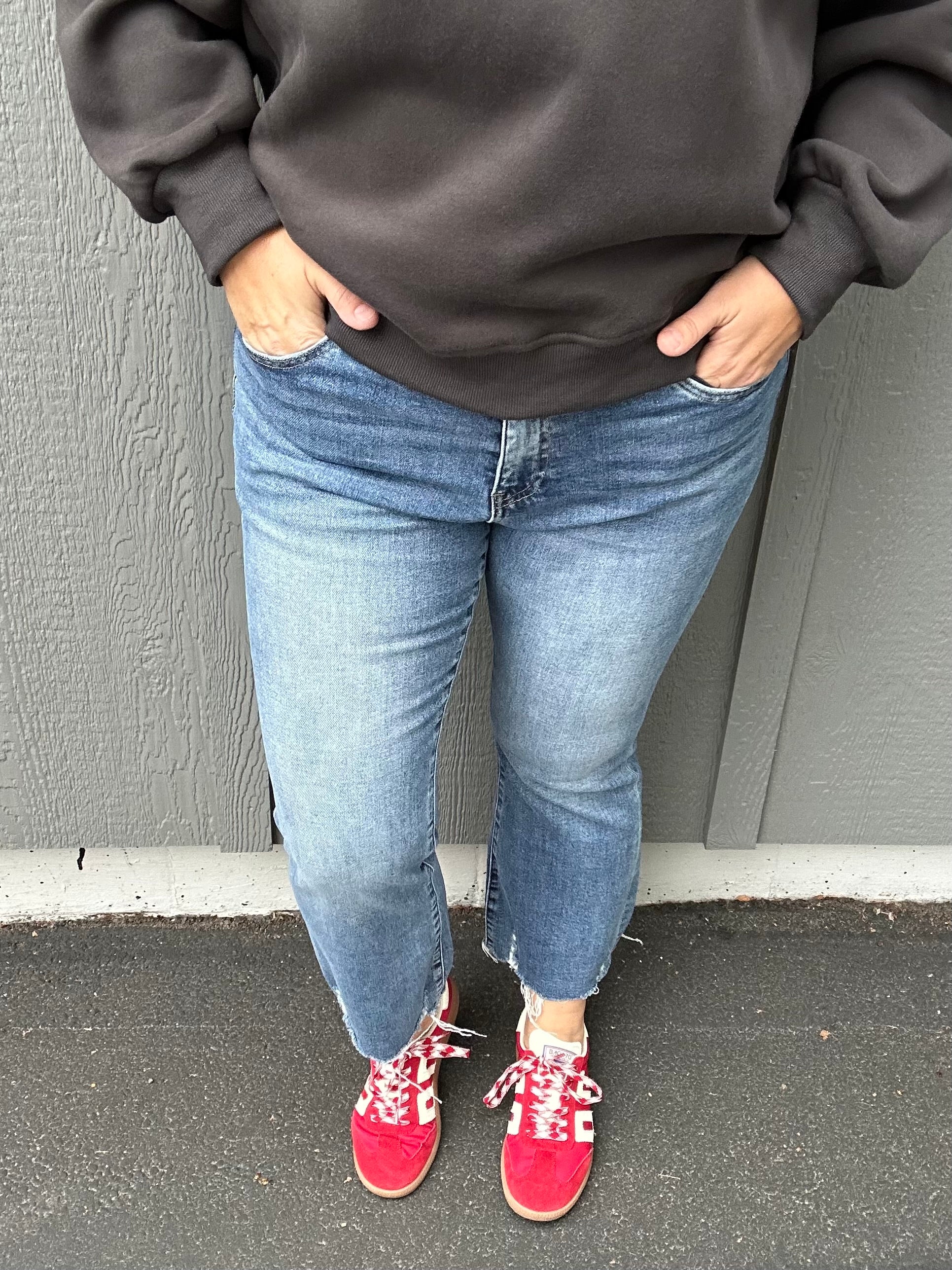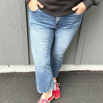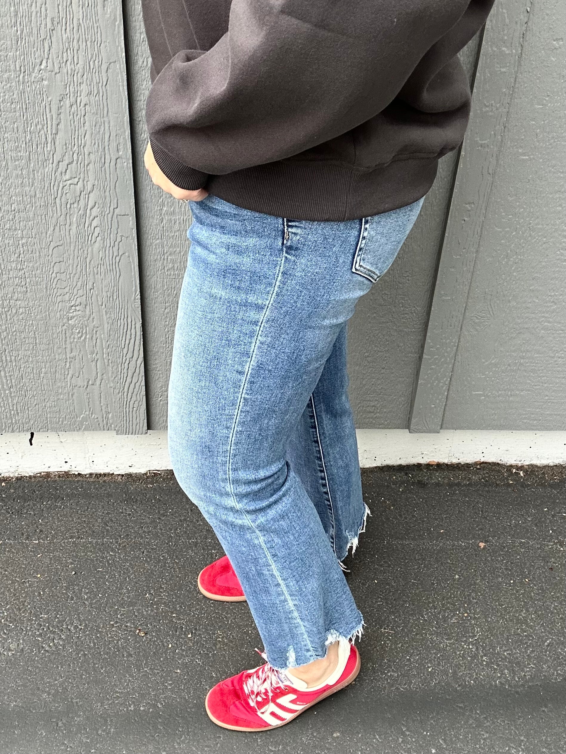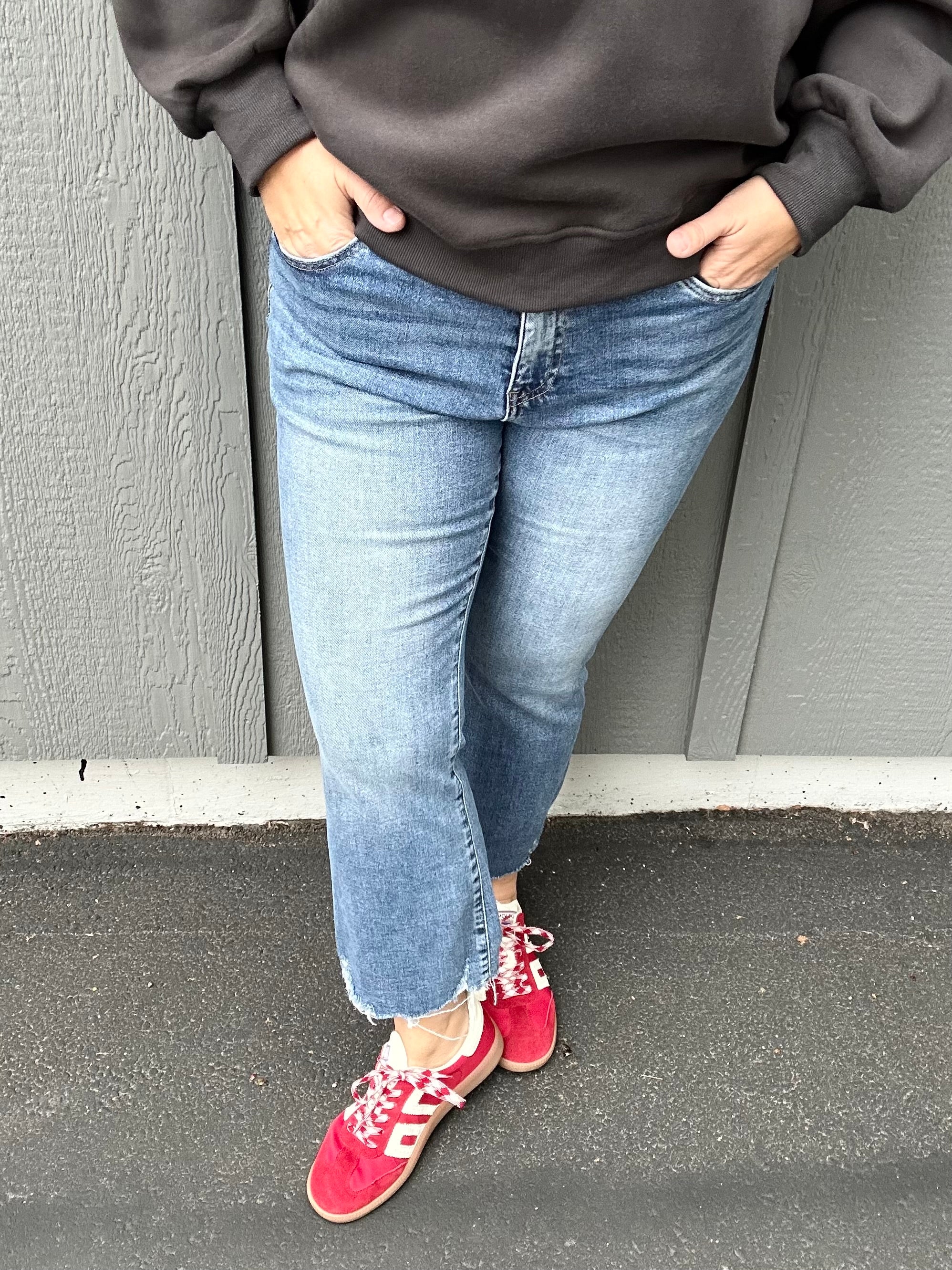 Meet your new everyday favorite — the Venice Blue Raw Hem Ankle Flare Jeans by Mica. These jeans combine modern edge with classic comfort, designed to flatter your shape while keeping you effortlessly stylish. The medium wash, raw hem, and just-right stretch make them the ultimate denim for dressing up or keeping it casual.