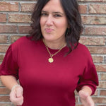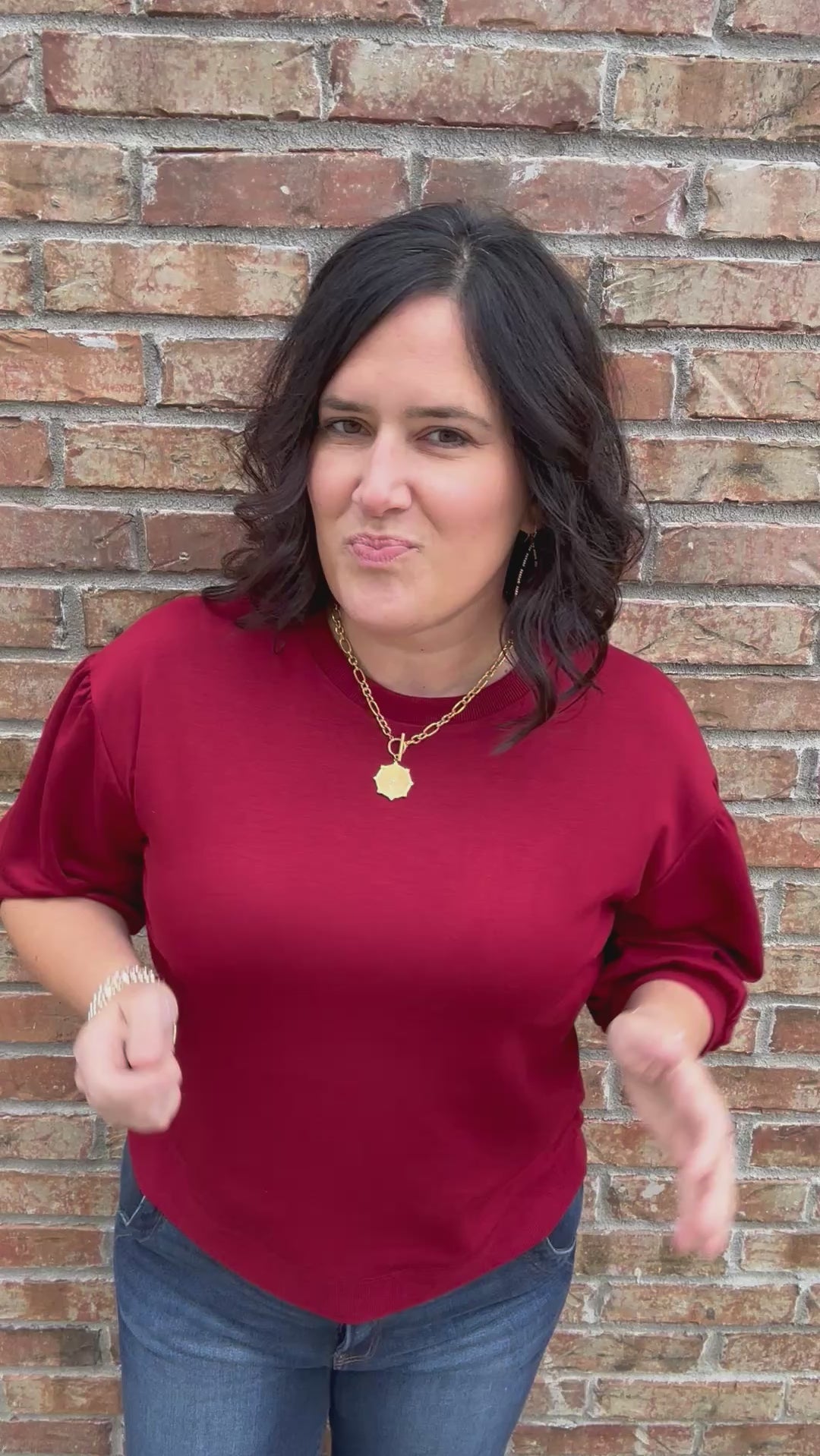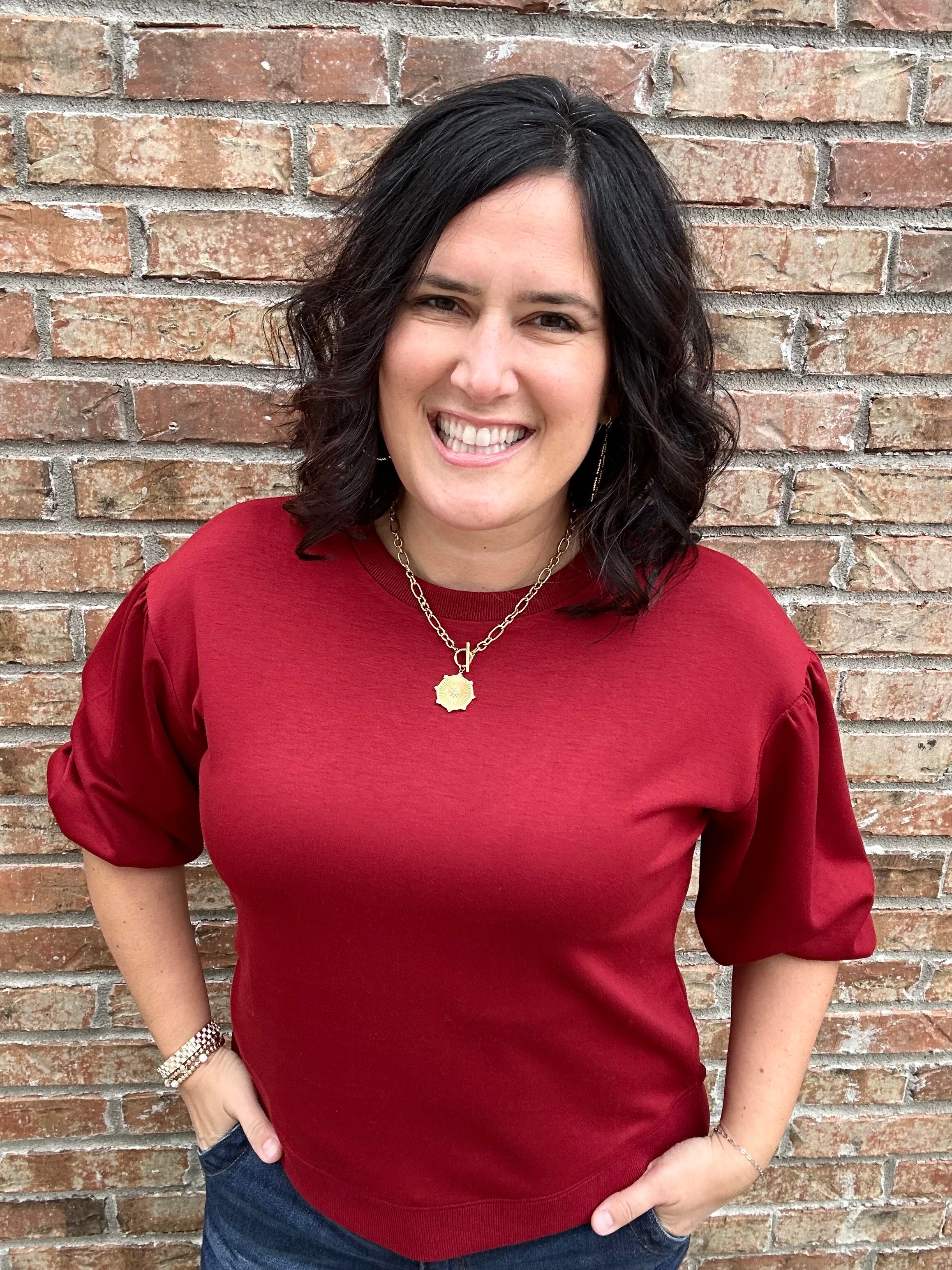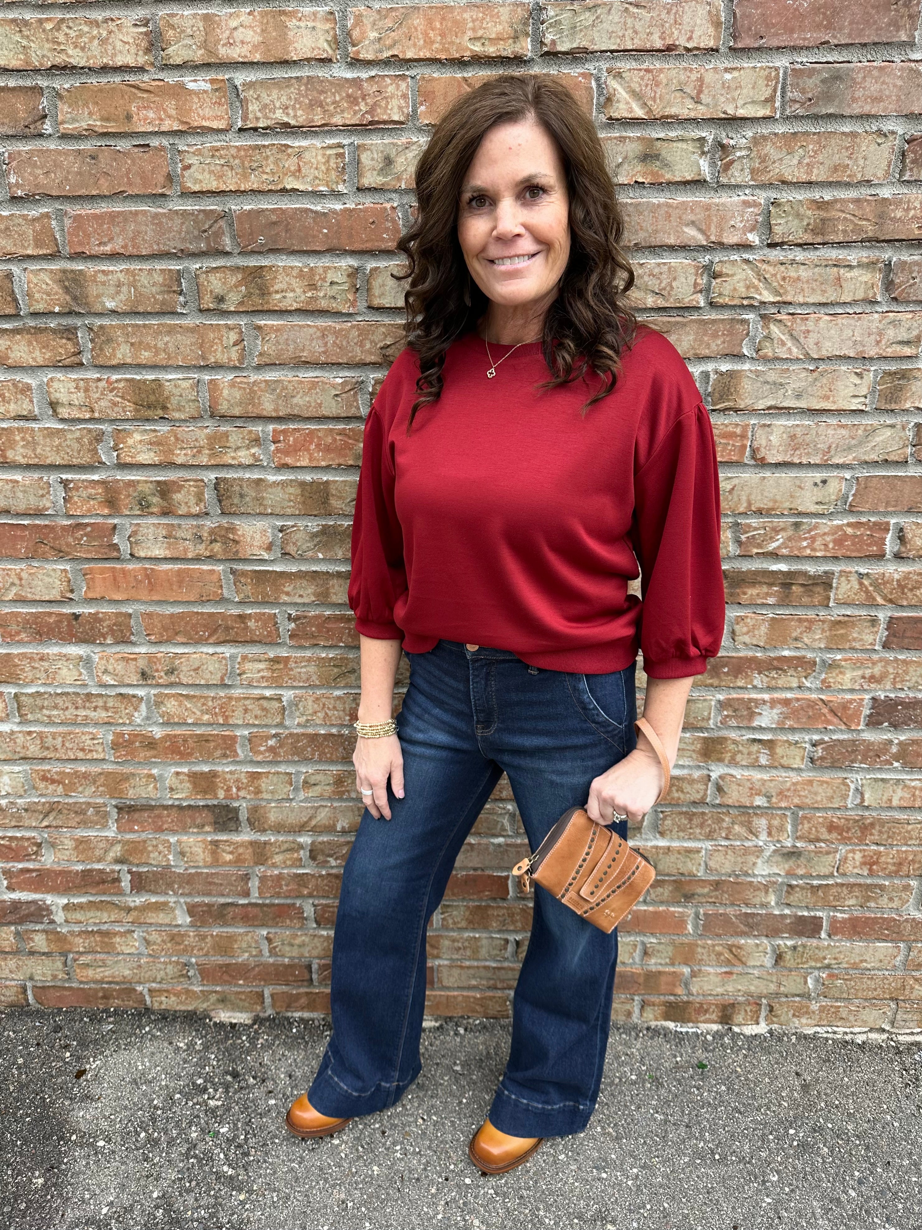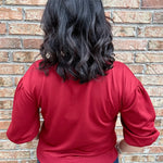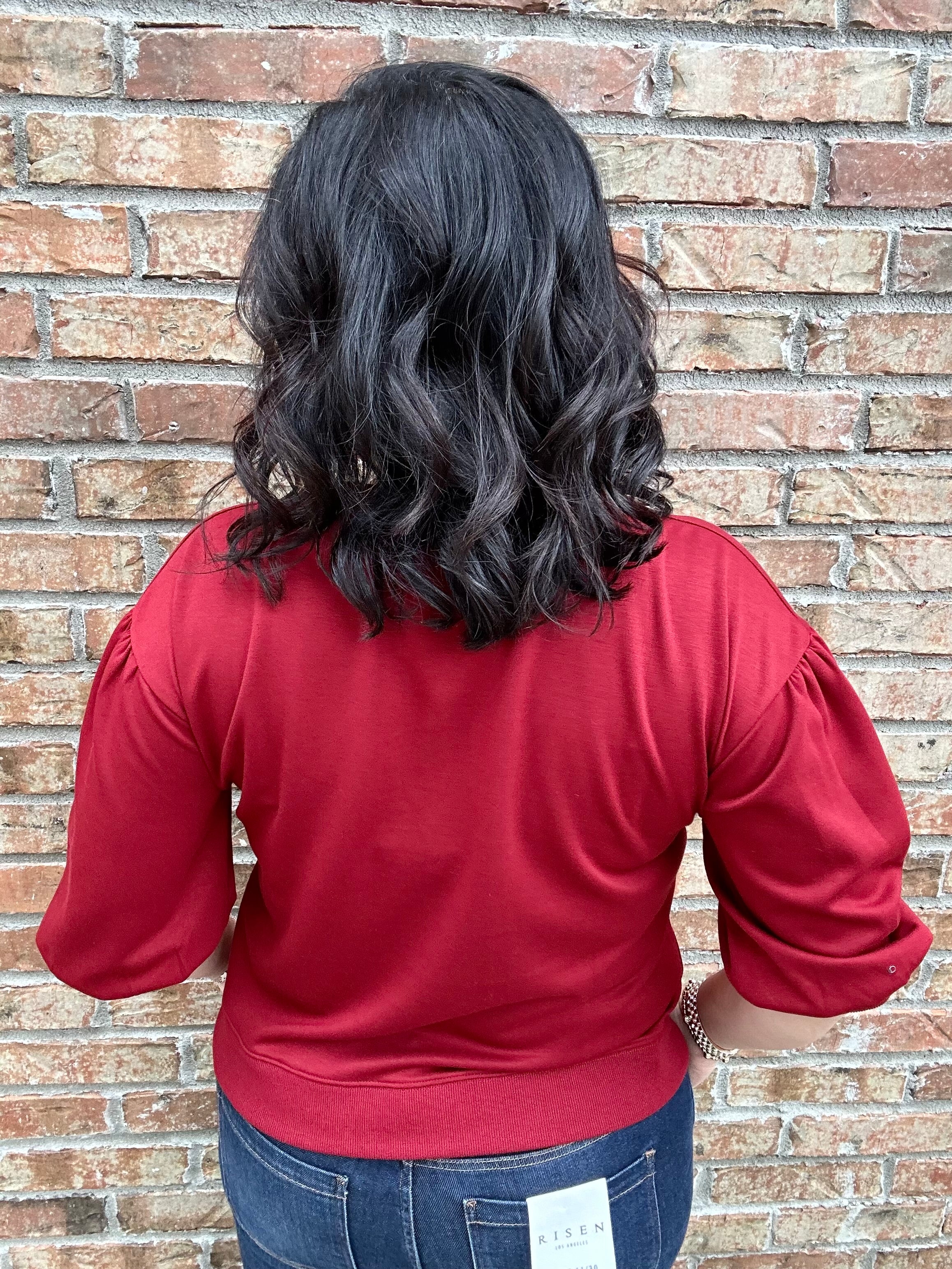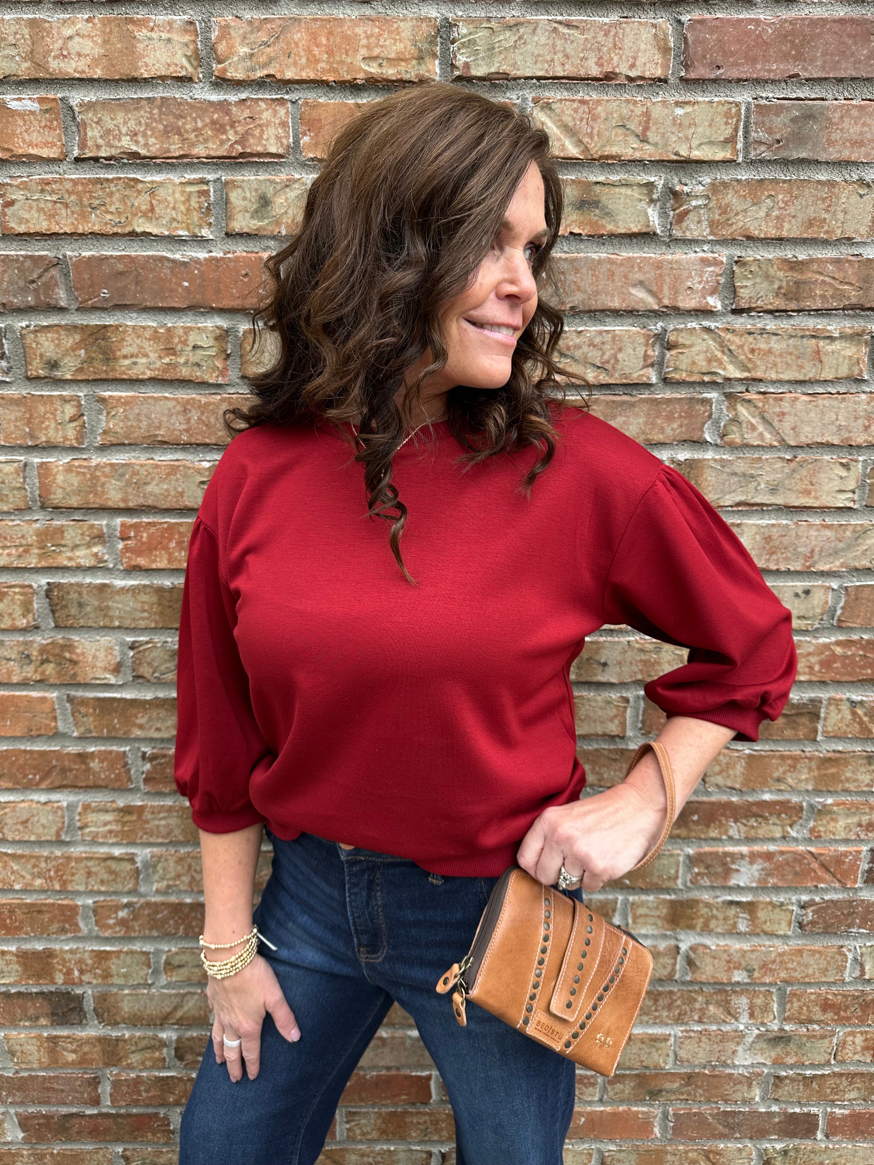 Rich burgundy color with feminine 3/4 puff sleeve accent