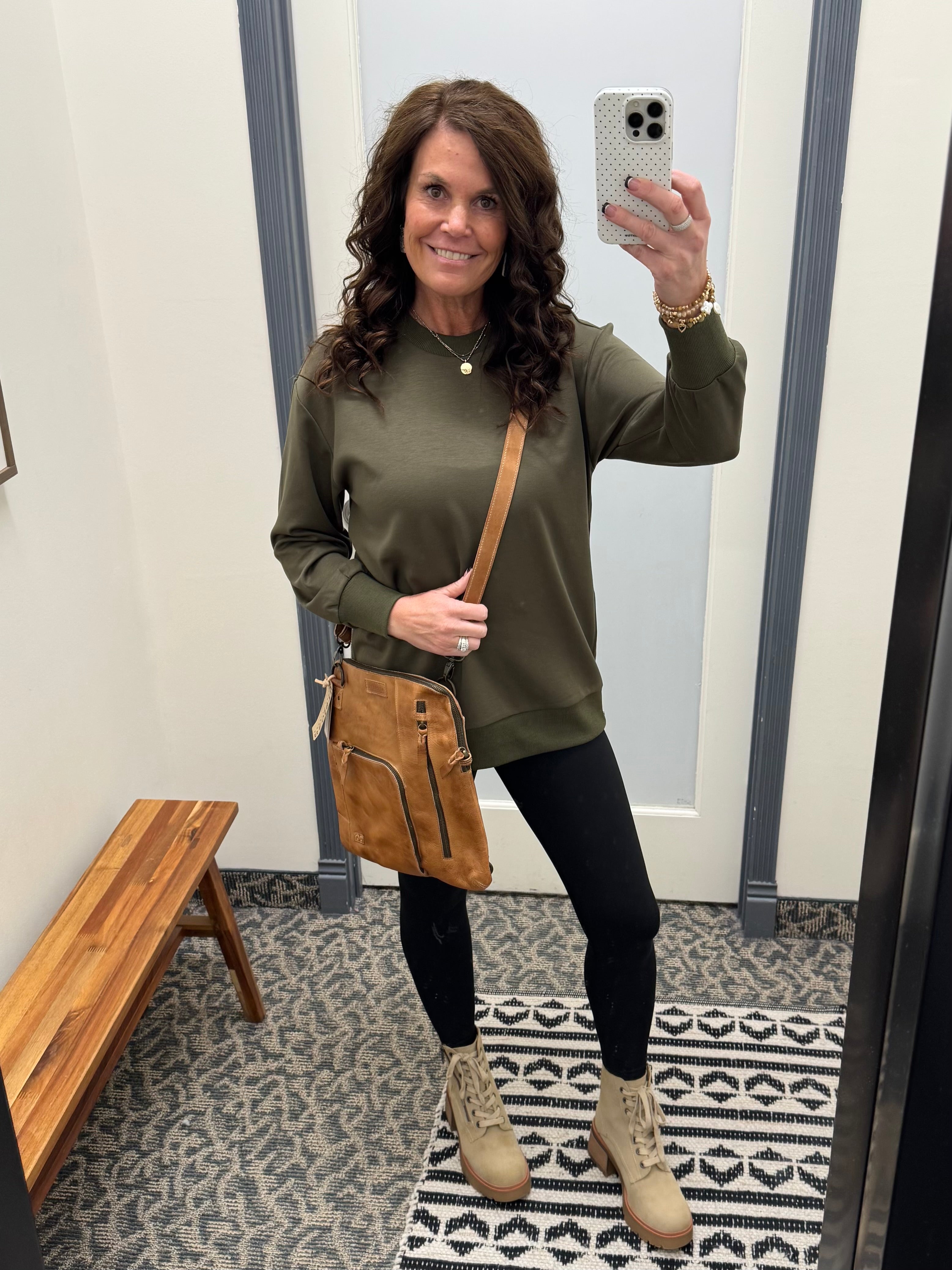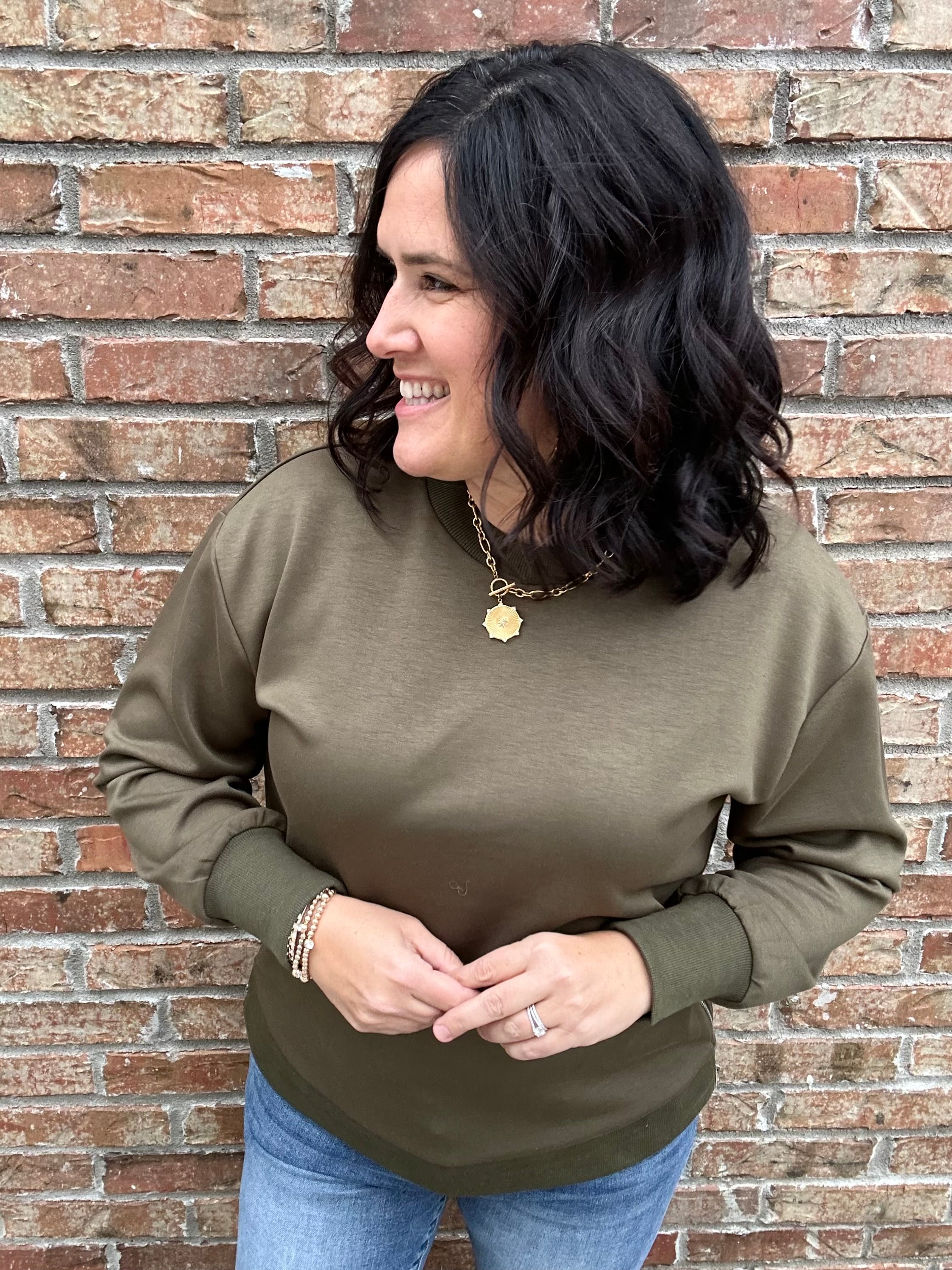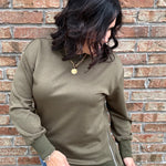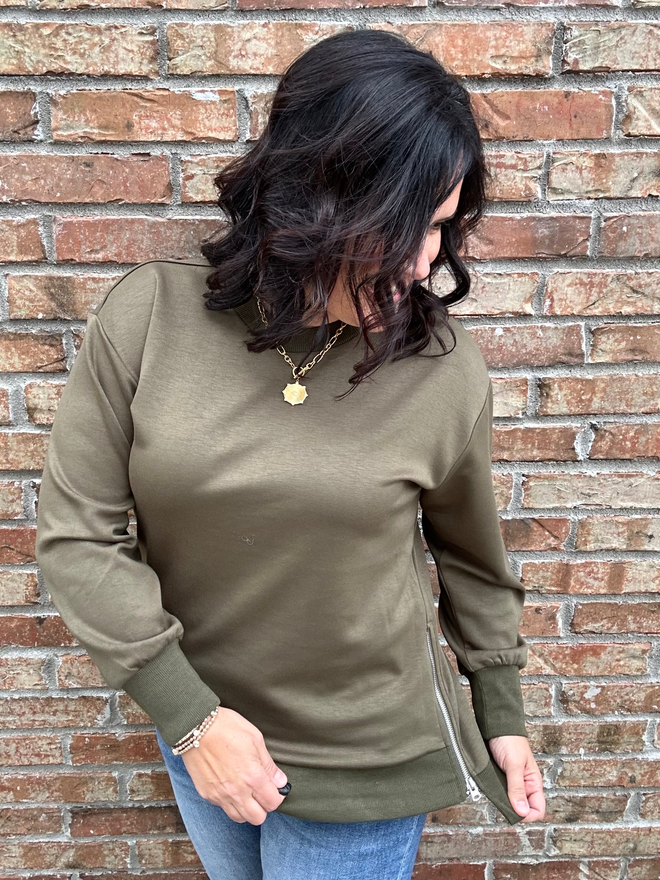 The Eliana Top is where casual comfort meets elevated detail. Designed in a rich pesto hue, this tunic-length sweatshirt feels luxuriously soft while keeping things effortlessly chic. With a classic crew neckline and standout silver side zipper accents, it’s a versatile piece that adds just the right amount of edge to your everyday style.