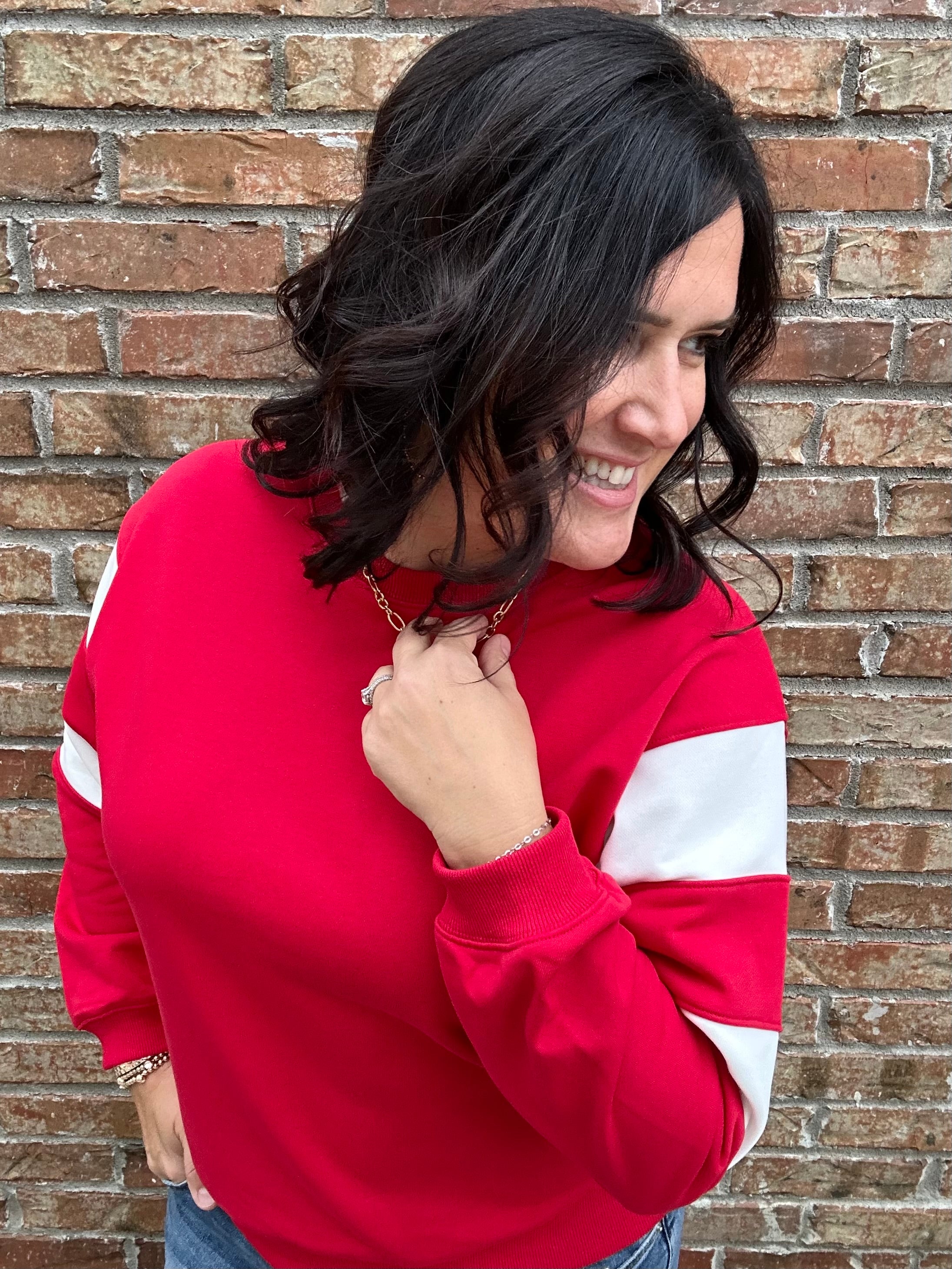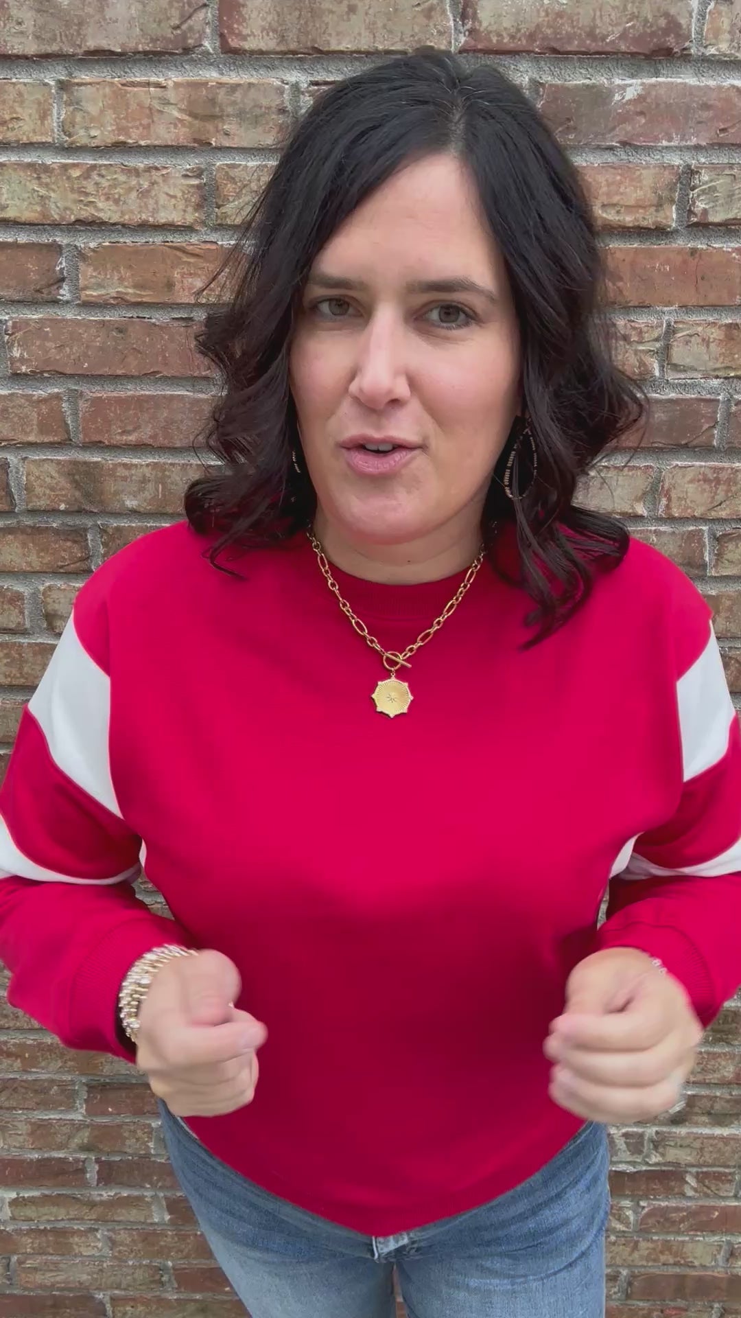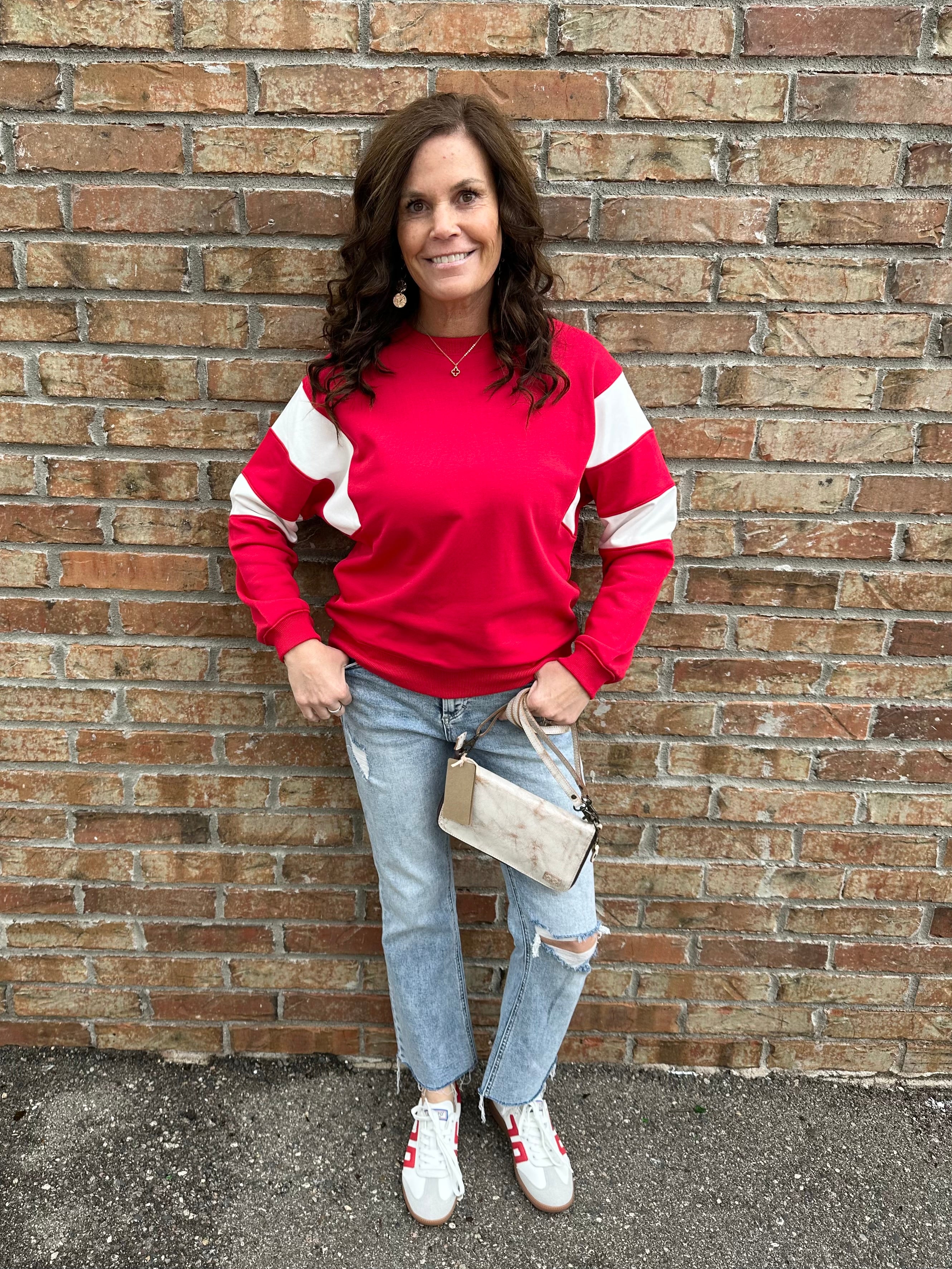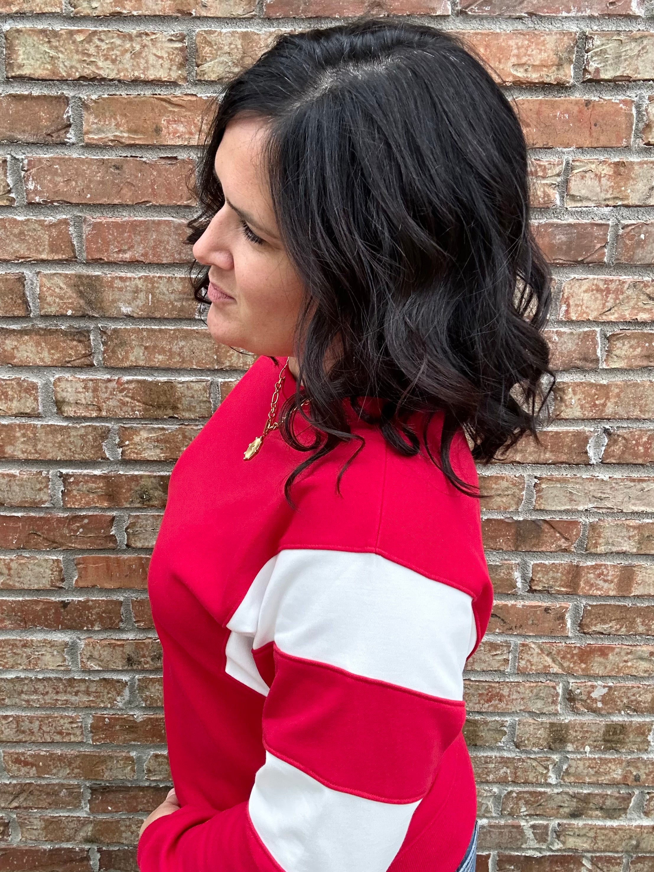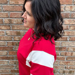 You’ll feel bright, cheerful, and effortlessly laid-back—the kind of cozy confidence that makes every casual day feel a little more fun. The lightweight terry fabric keeps you comfortable while the bold red and white color block adds a modern, sporty twist.