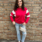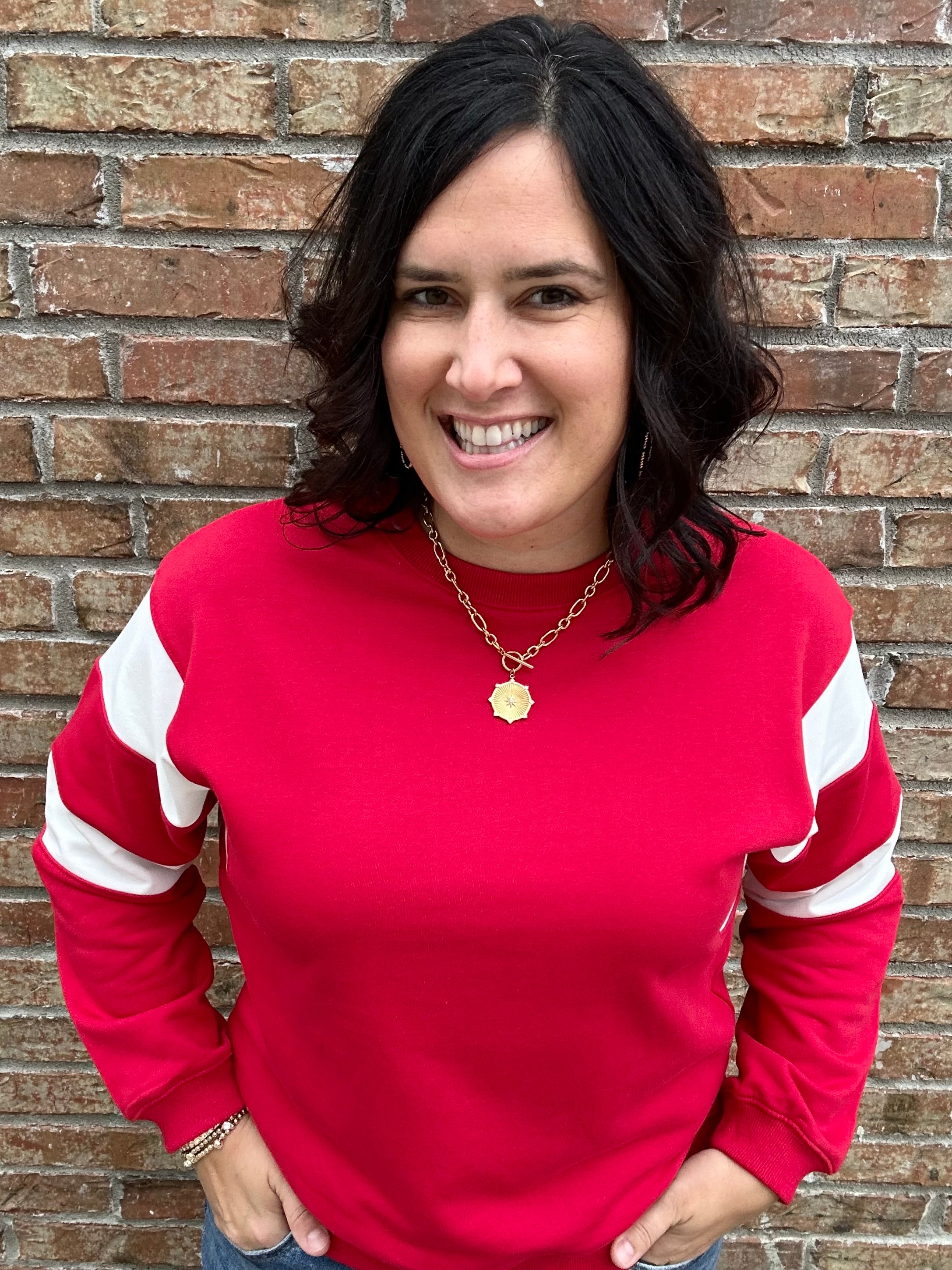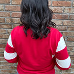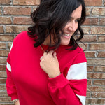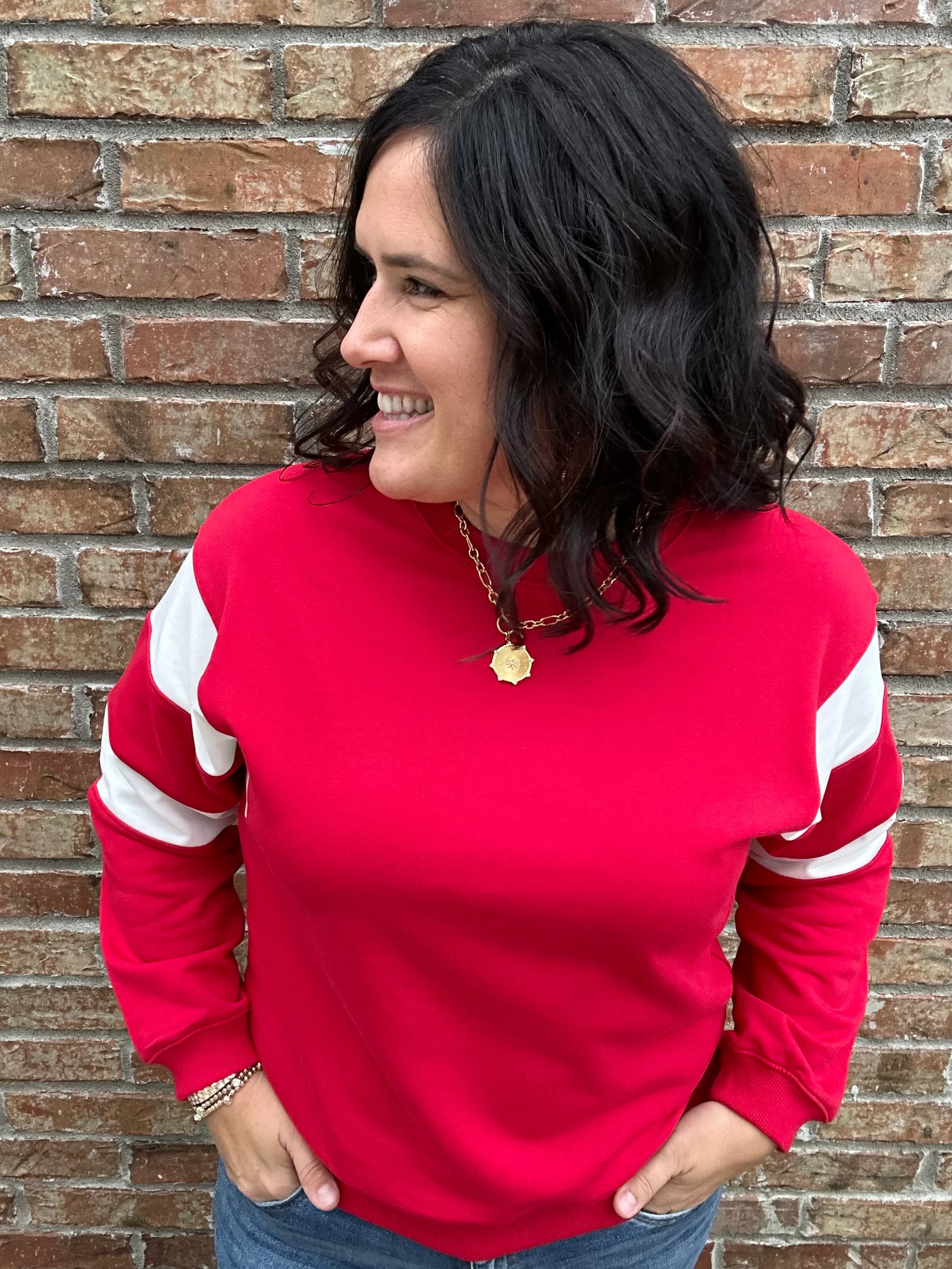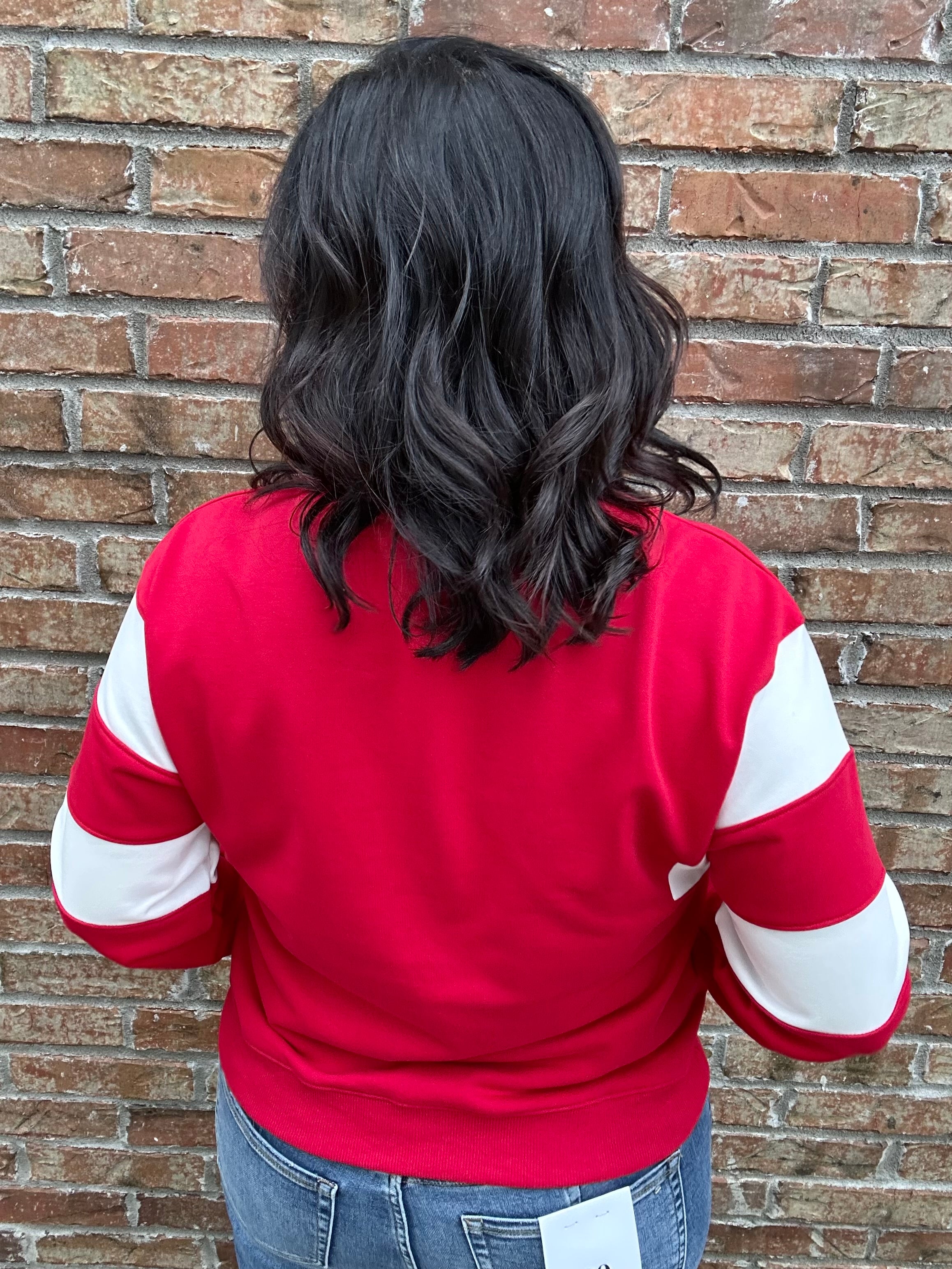 You’ll feel bright, cheerful, and effortlessly laid-back—the kind of cozy confidence that makes every casual day feel a little more fun. The lightweight terry fabric keeps you comfortable while the bold red and white color block adds a modern, sporty twist.