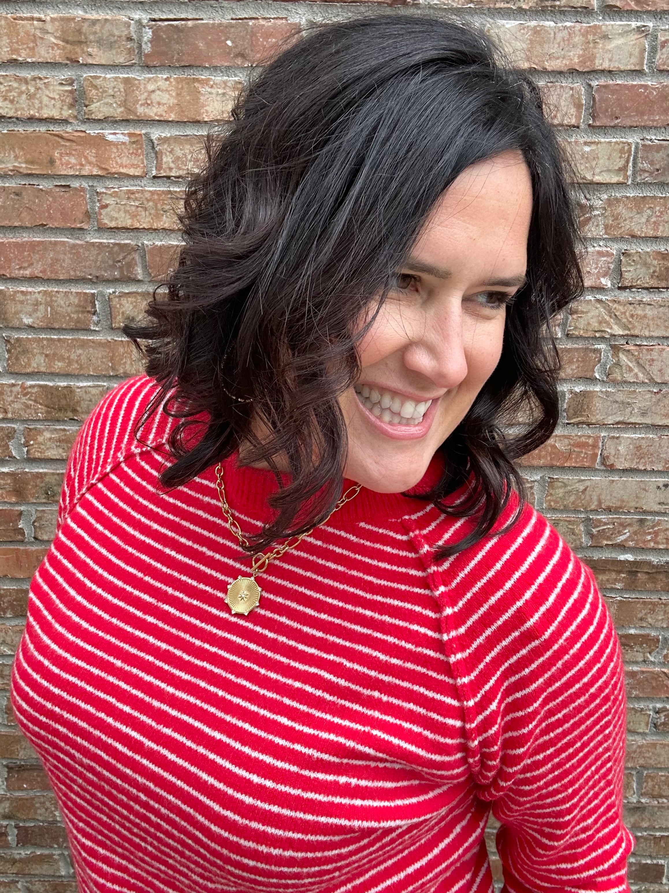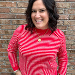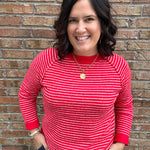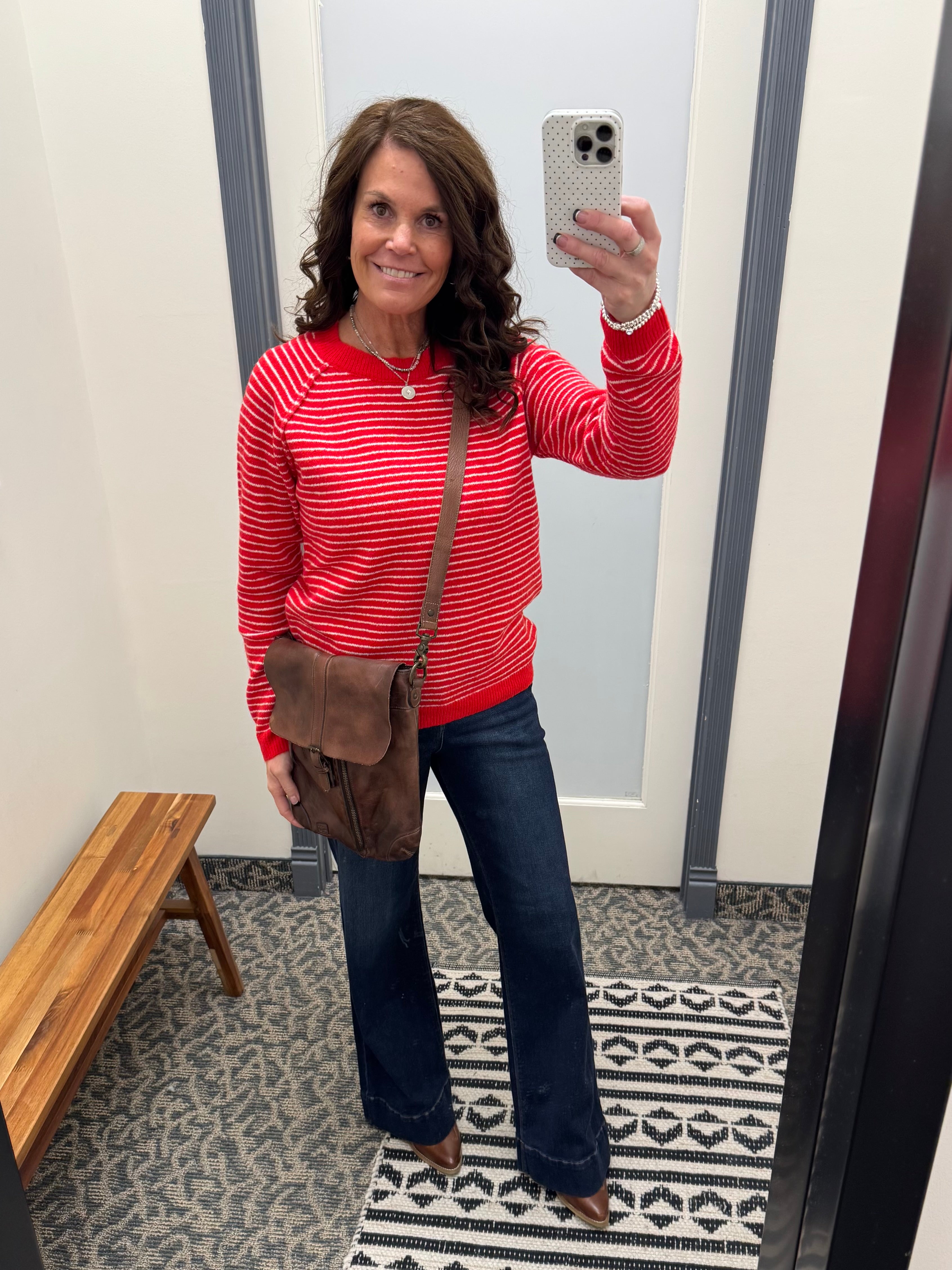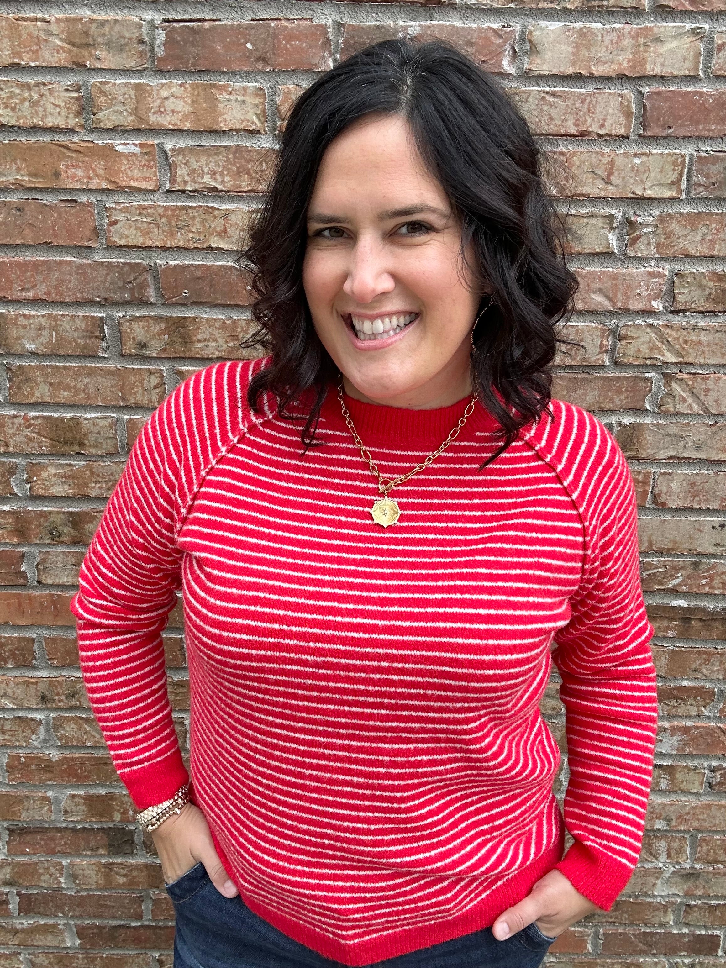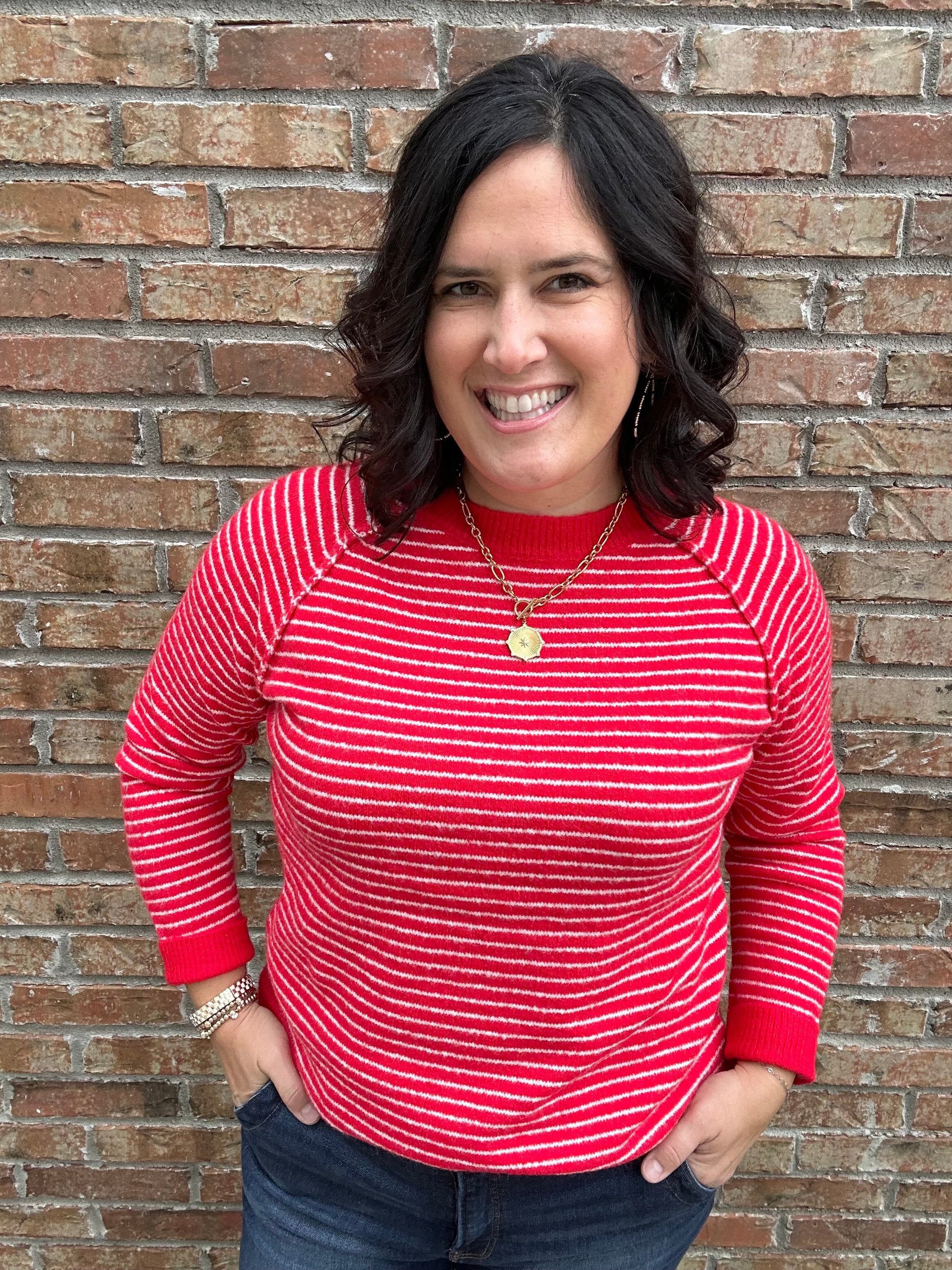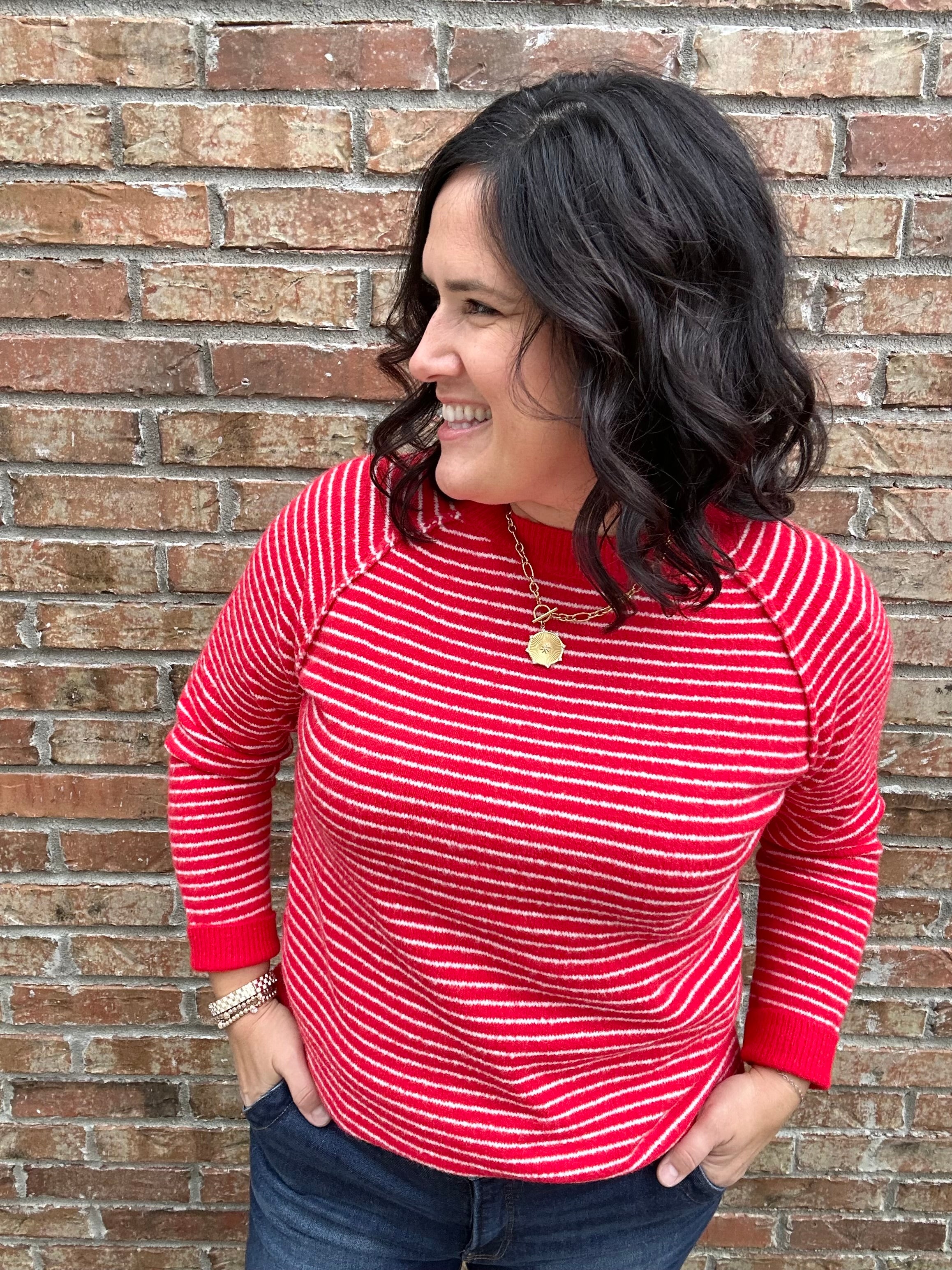 Add a cheerful pop of color to your cozy-weather lineup with the Red Striped Raglan Sweater from Staccato. Designed for comfort and everyday style, this soft knit sweater features a classic red and white stripe pattern and a relaxed, easy-to-wear fit.