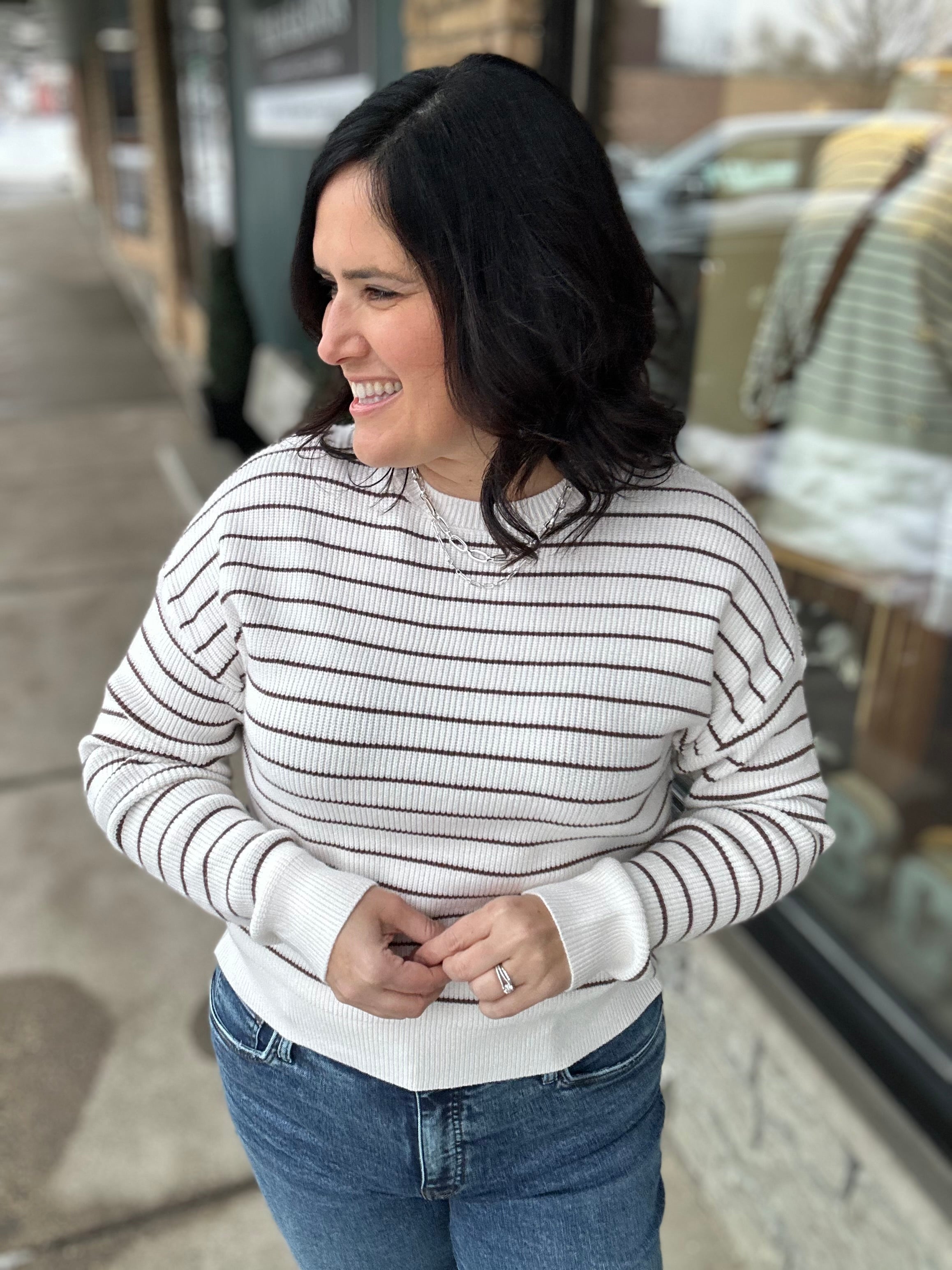 Meet the sweater you’ll still be reaching for years from now. The Ely Sweater from Thread & Supply is the definition of timeless comfort—an ivory base with rich chocolate brown stripes, wrapped in the dreamiest, cloud-like knit that feels soft, squishy, and oh-so-cozy.