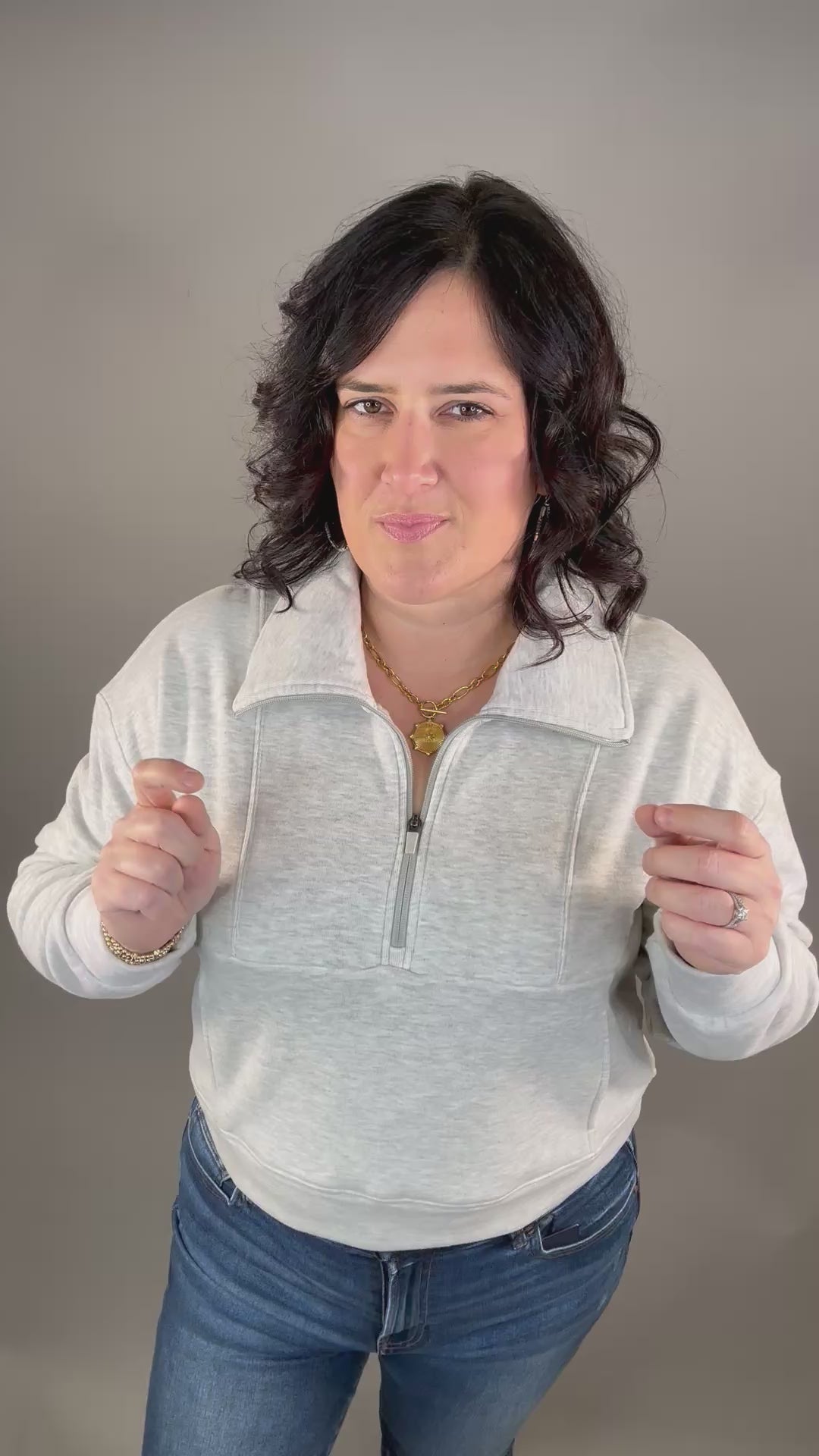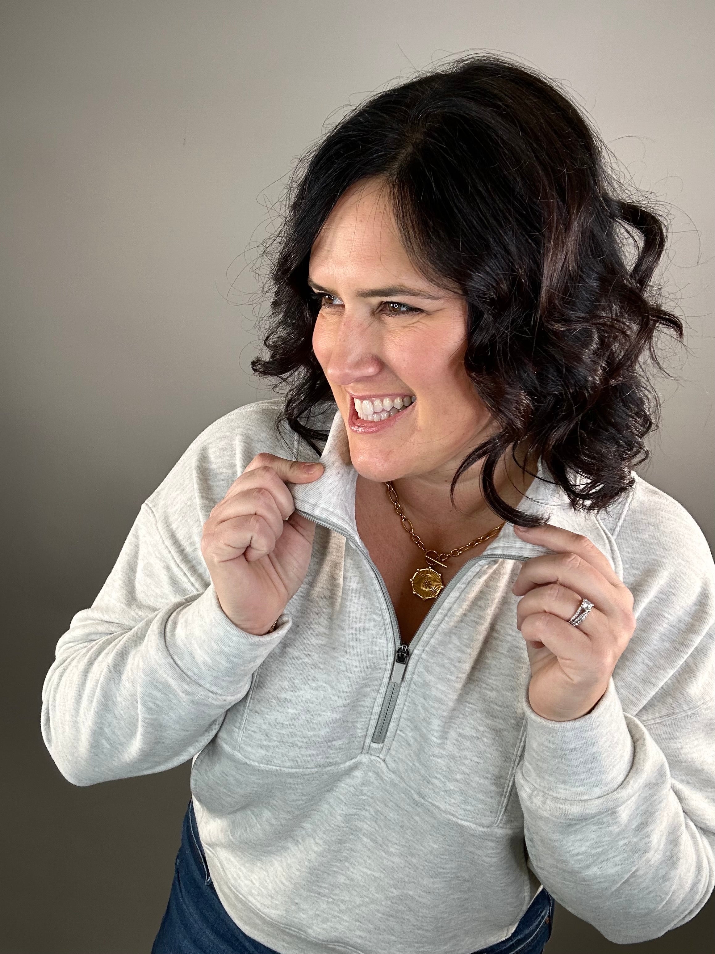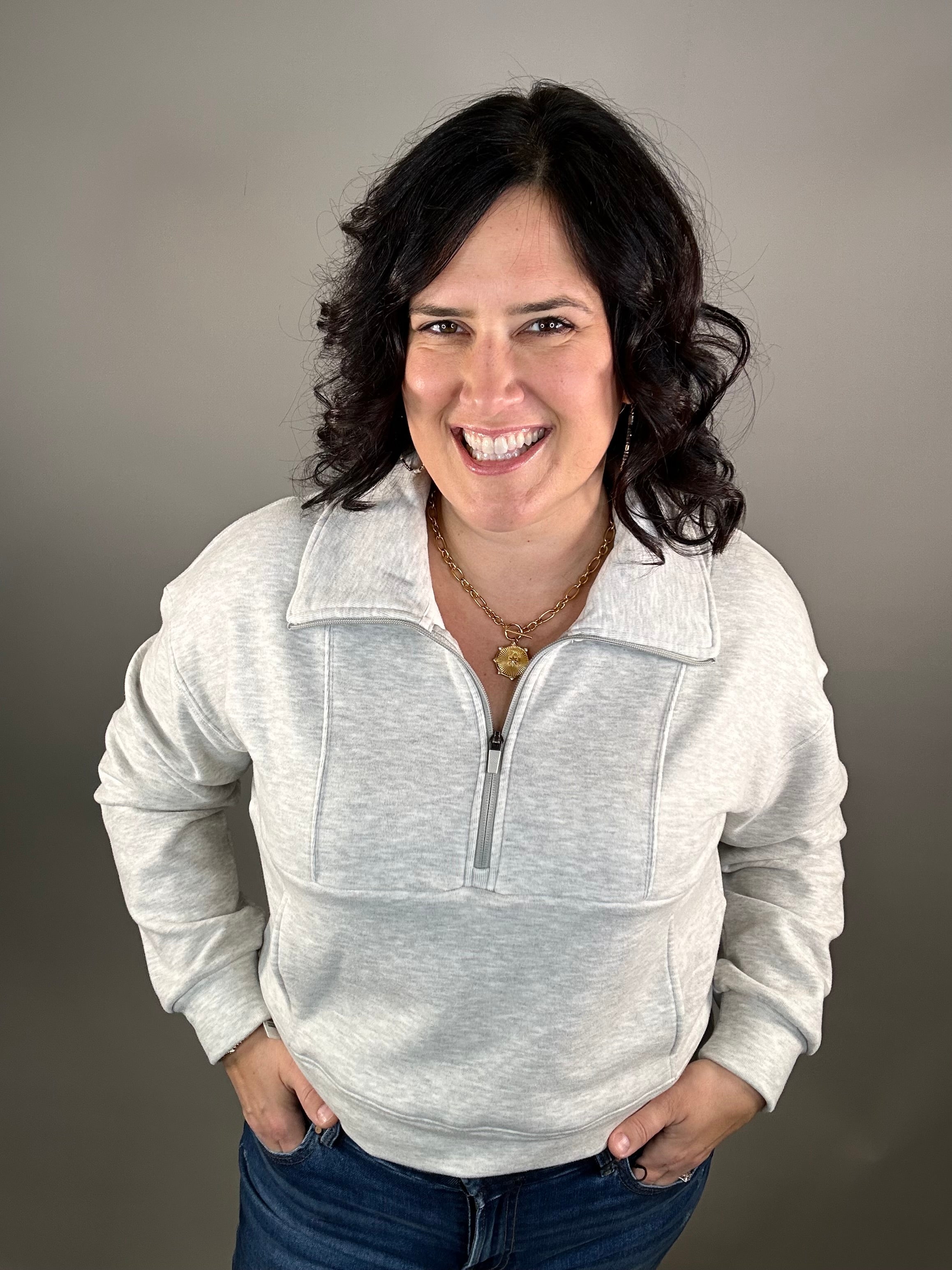 You’ll feel toasty, relaxed, and effortlessly put-together. The buttery texture and easy fit wrap you in comfort, while the mock neck and zip detail add a touch of everyday sophistication.