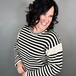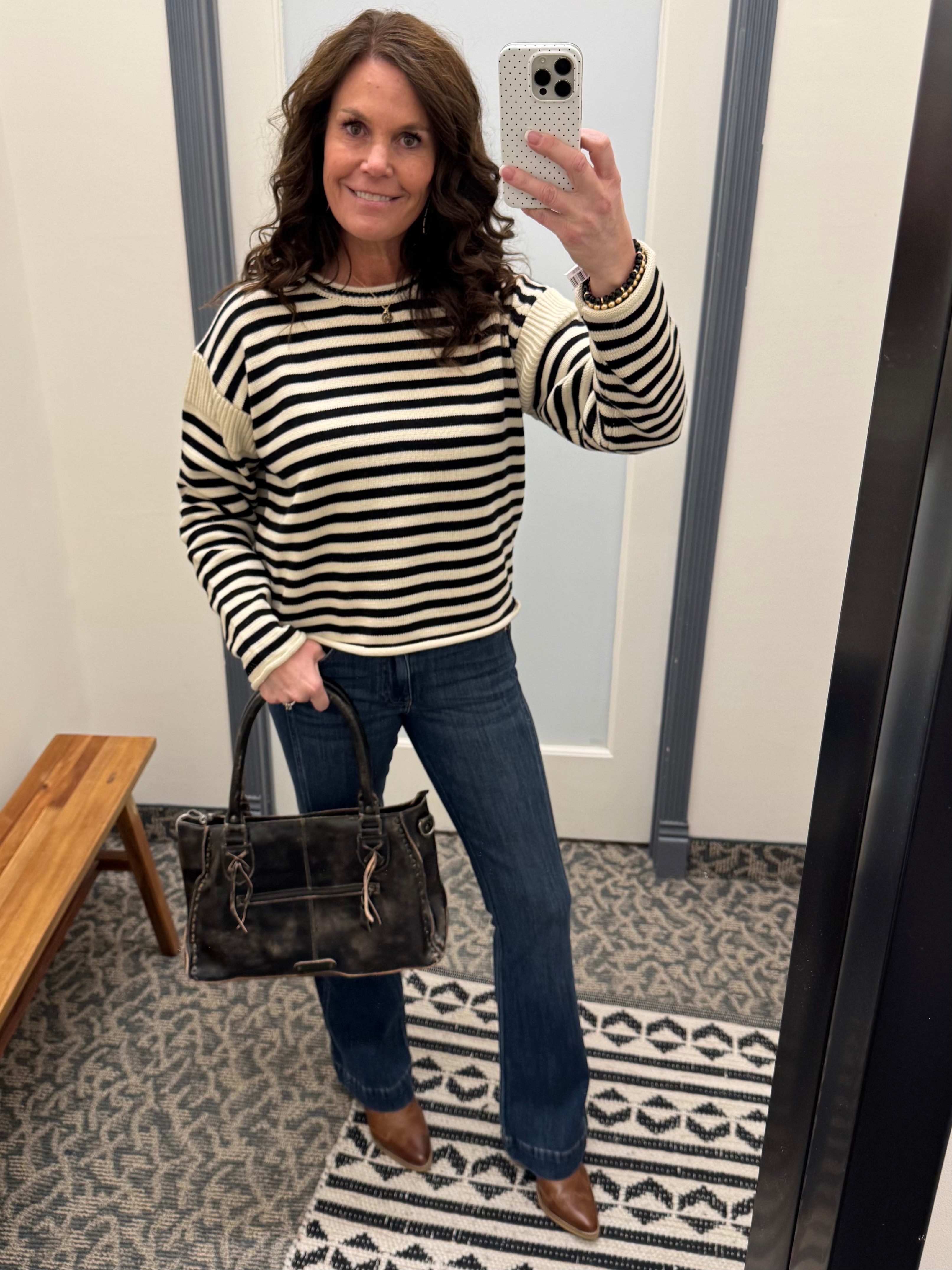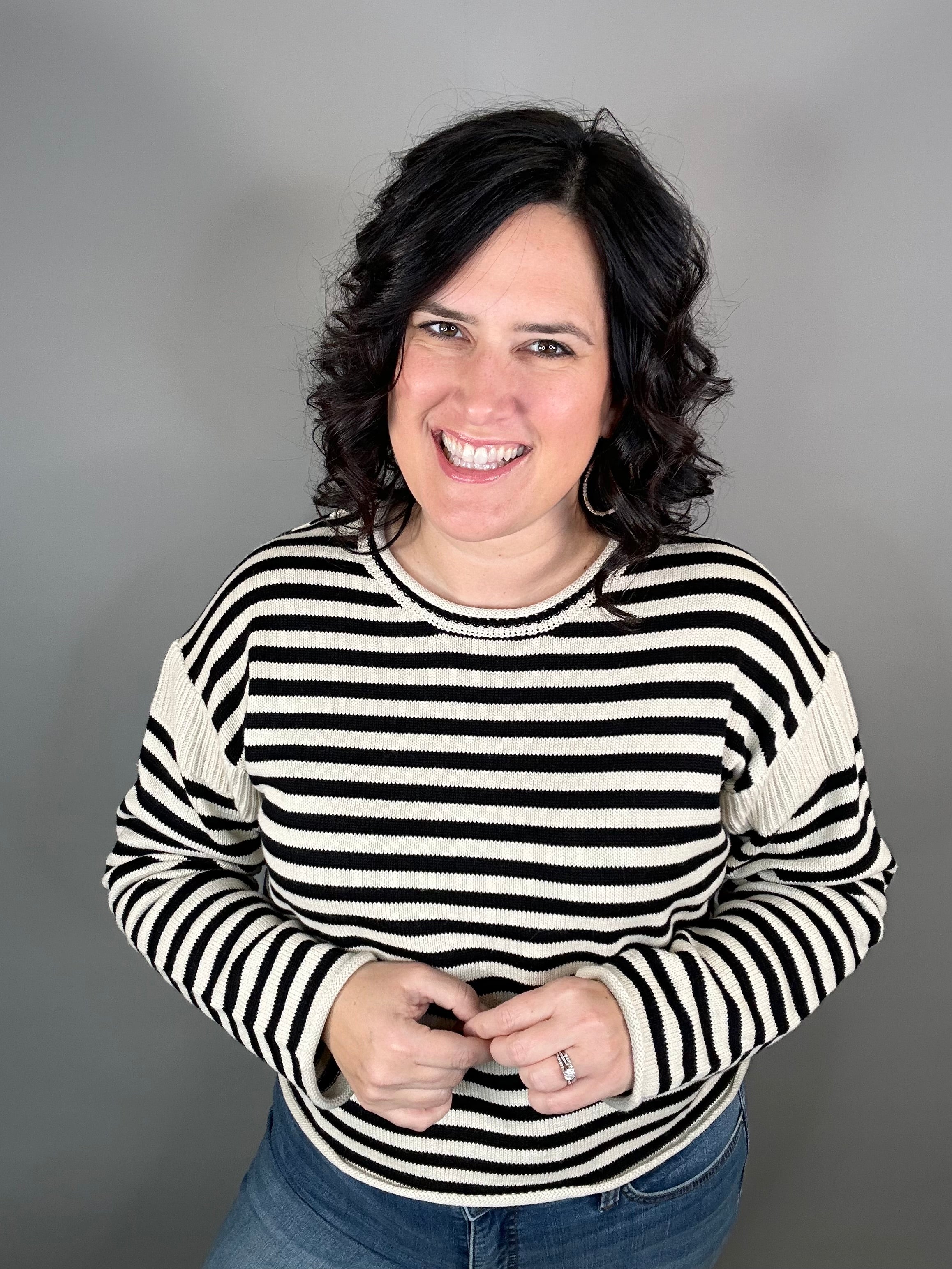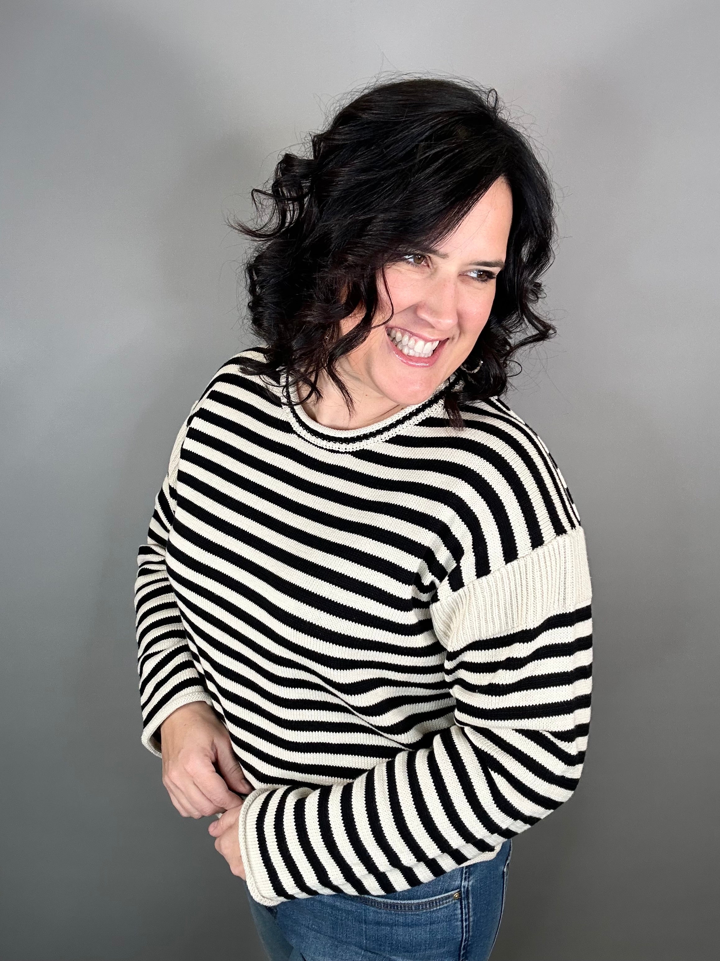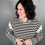 ✨ Classic stripes meet cozy sophistication — the Black/Taupe Striped Knit Sweater from Wishlist makes every day feel stylishly effortless.