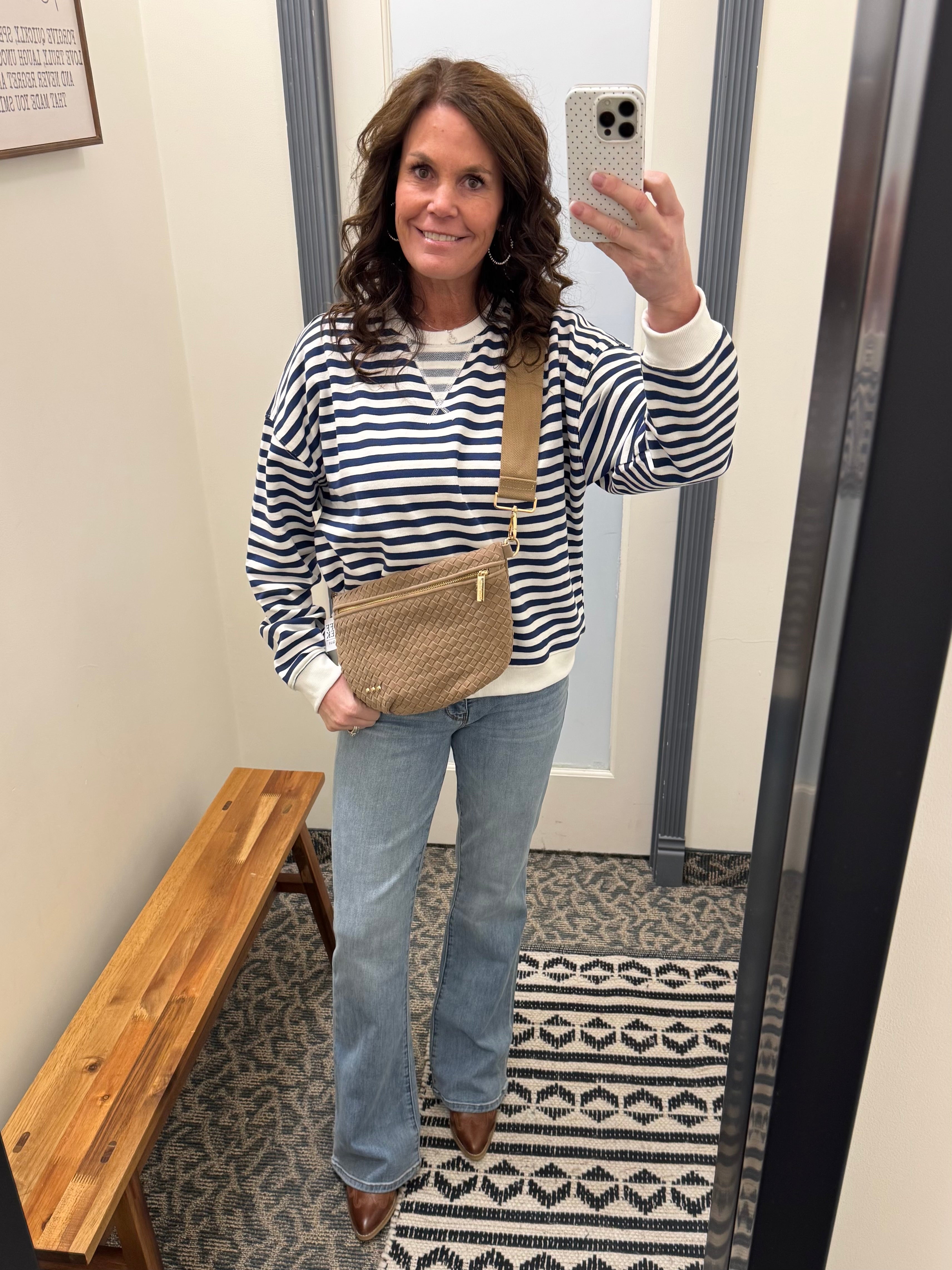 Layer it under a vest or denim jacket when temps drop — the stripes peek through perfectly.