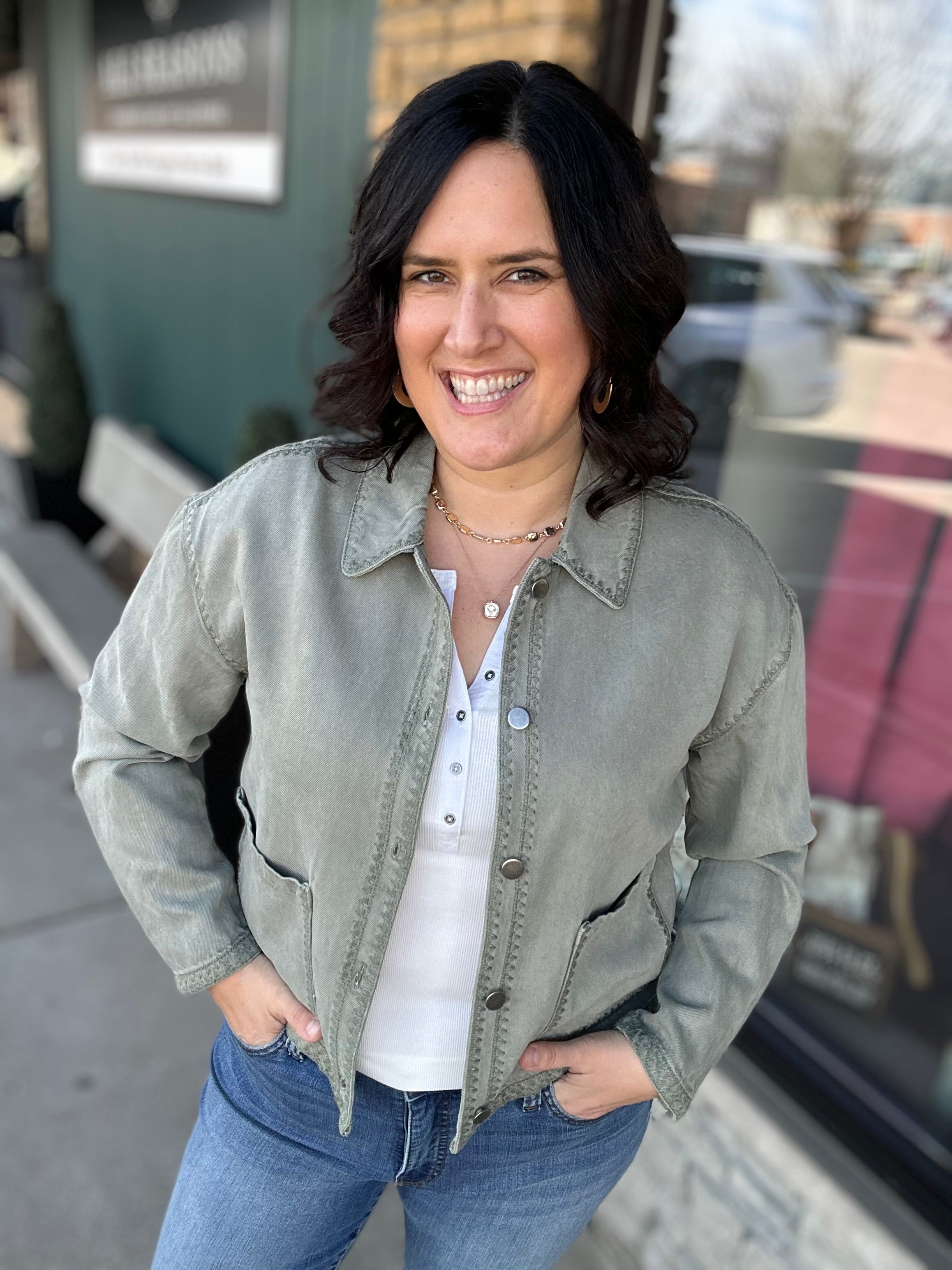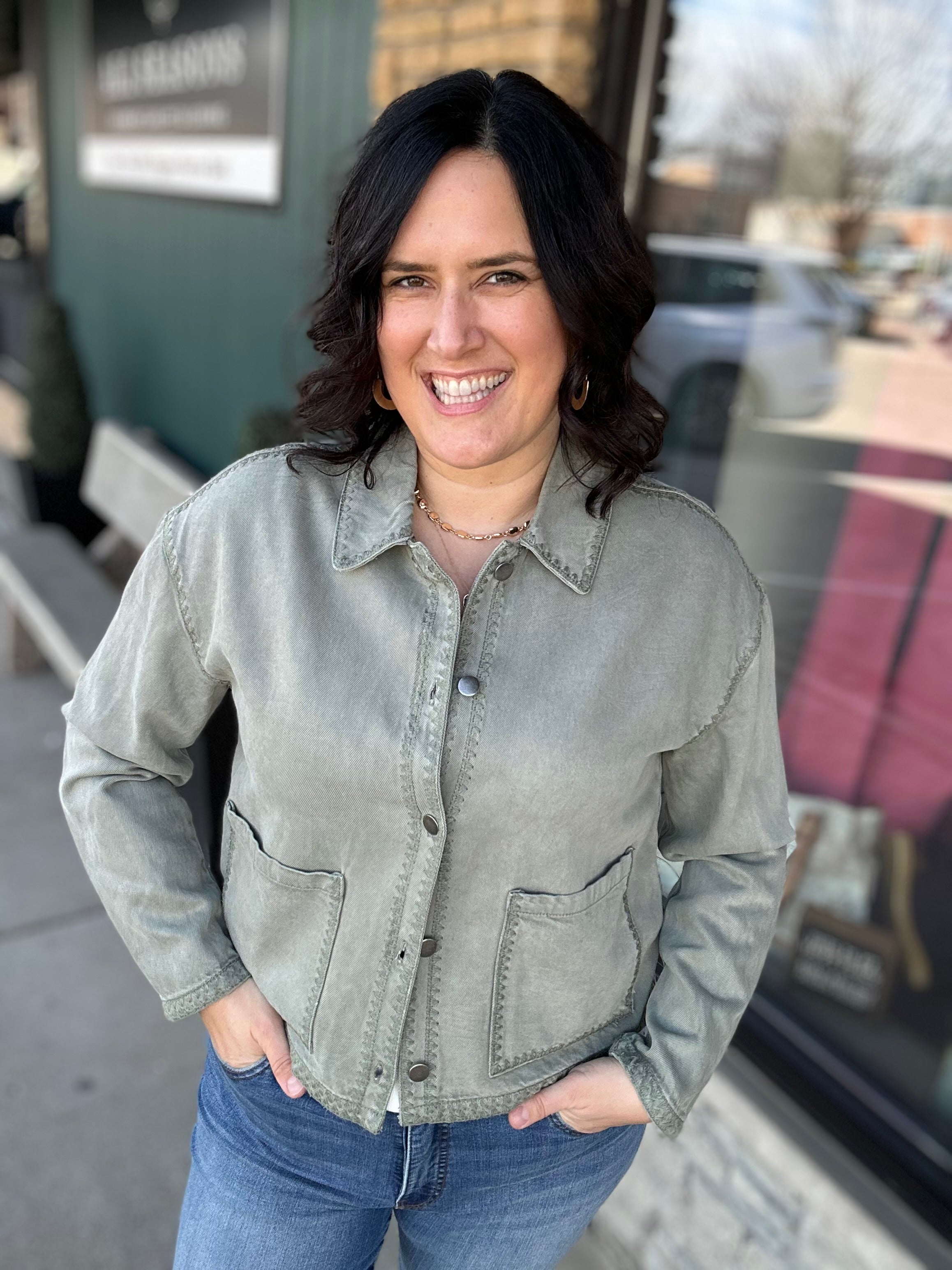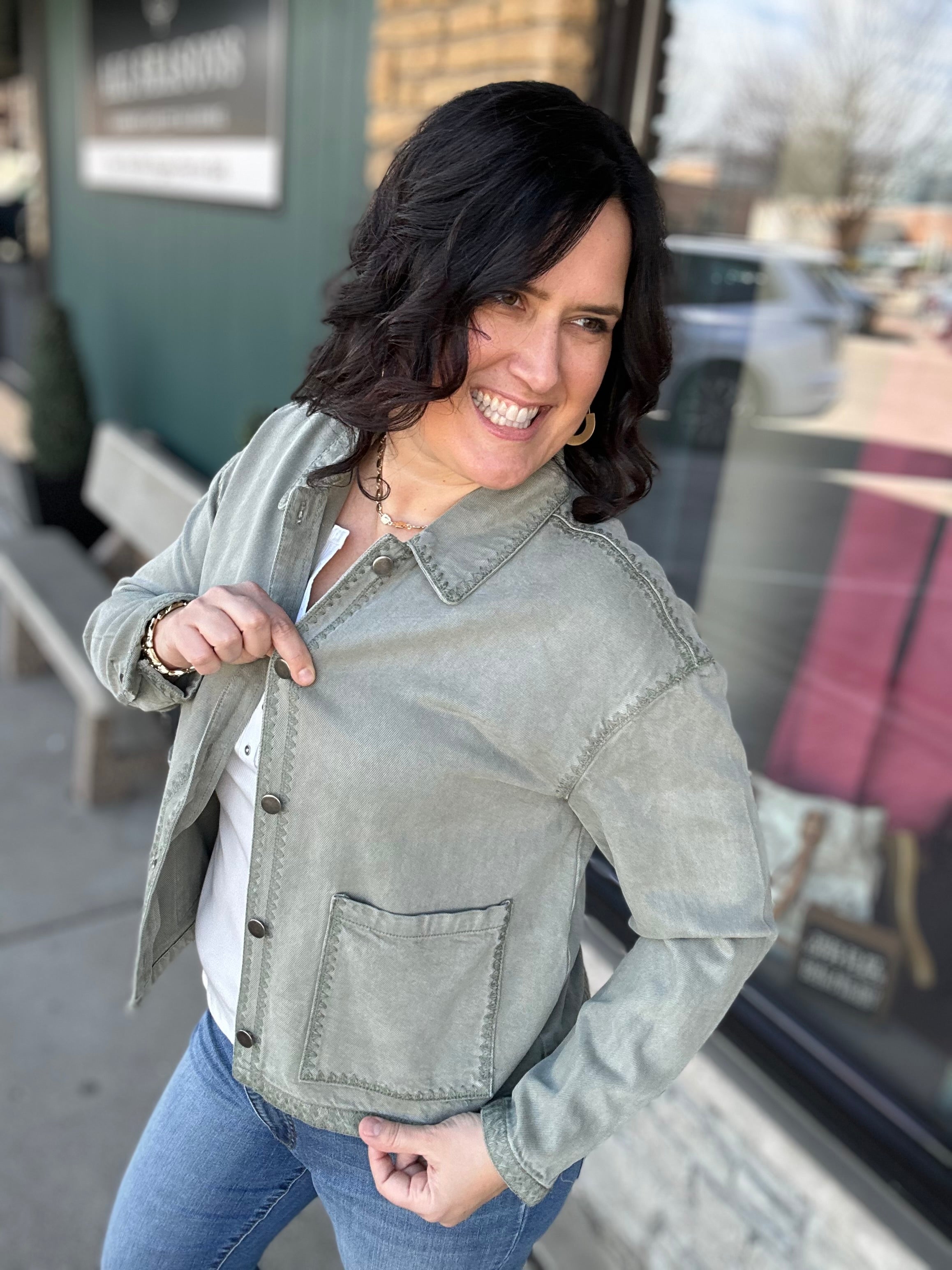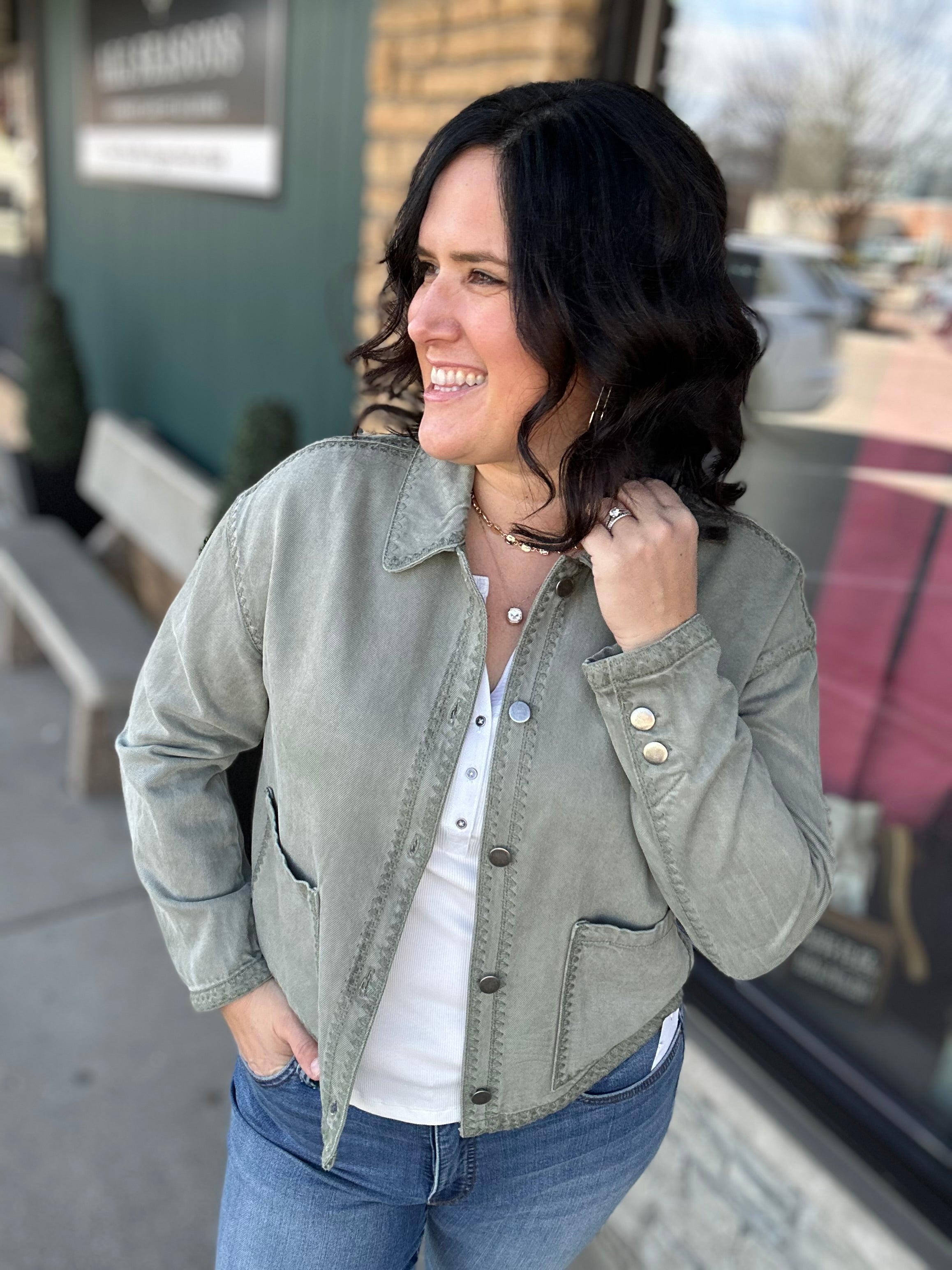 Meet your new go-to layering piece. The Seagrass Justice Jacket from Thread & Supply is the perfect mix of effortless style and everyday function. Designed with a lightweight cotton-lyocell blend, this utility-inspired jacket feels soft, breathable, and easy to wear while still giving you that cool, structured look. The relaxed silhouette, drop shoulders, and subtle whipstitch detailing add just the right amount of style, making this jacket a standout layering piece you’ll reach for again and again.
