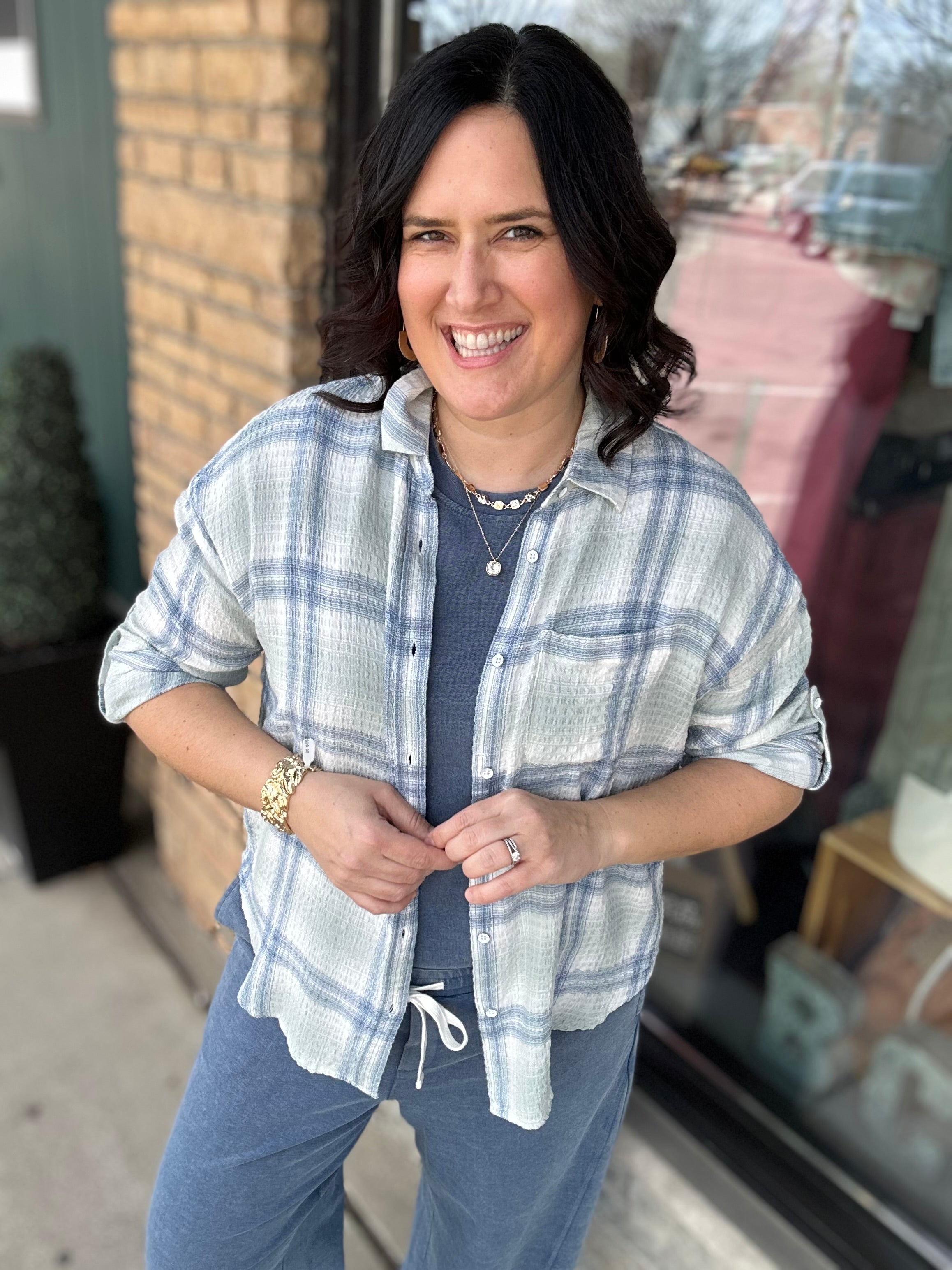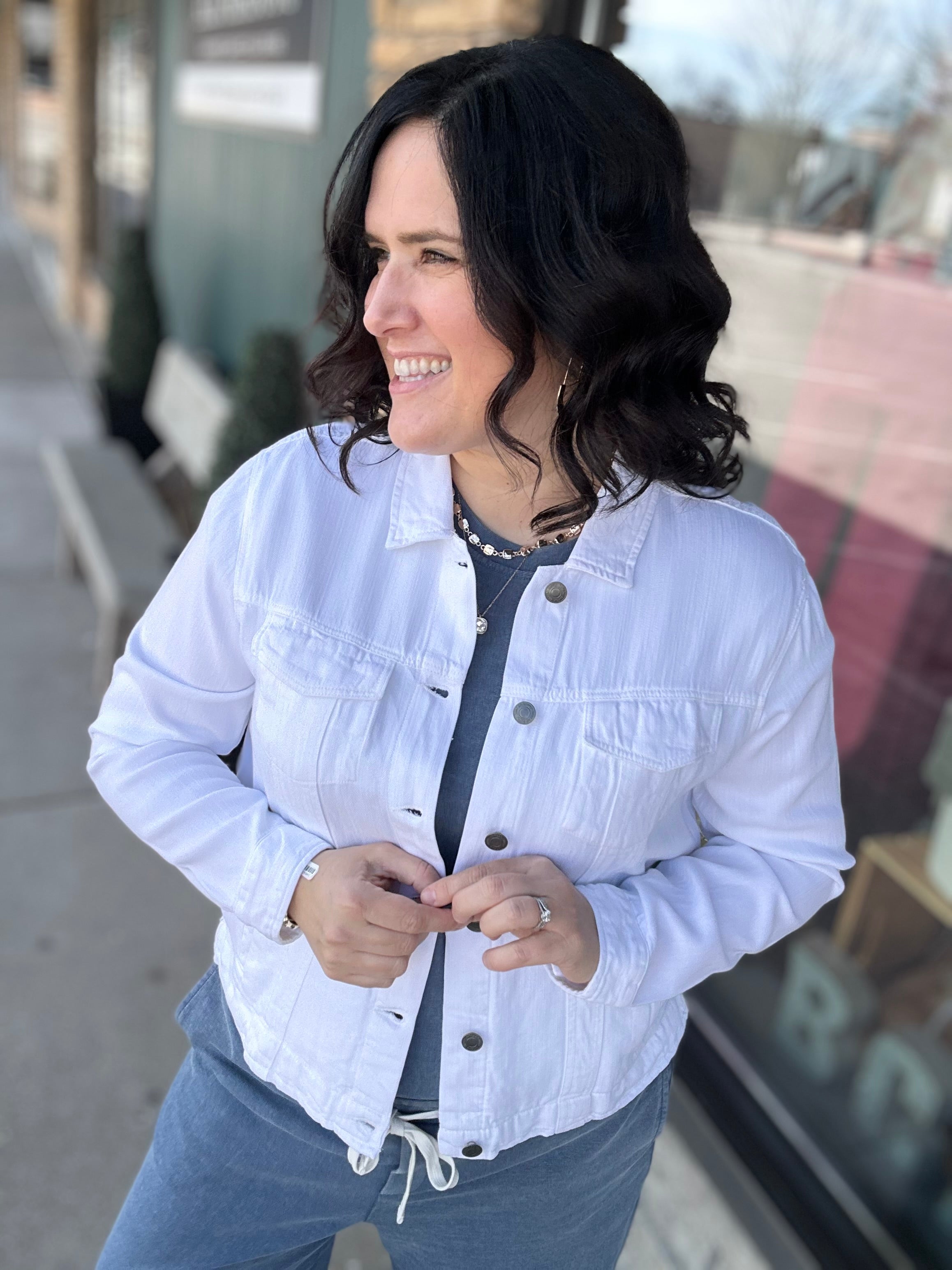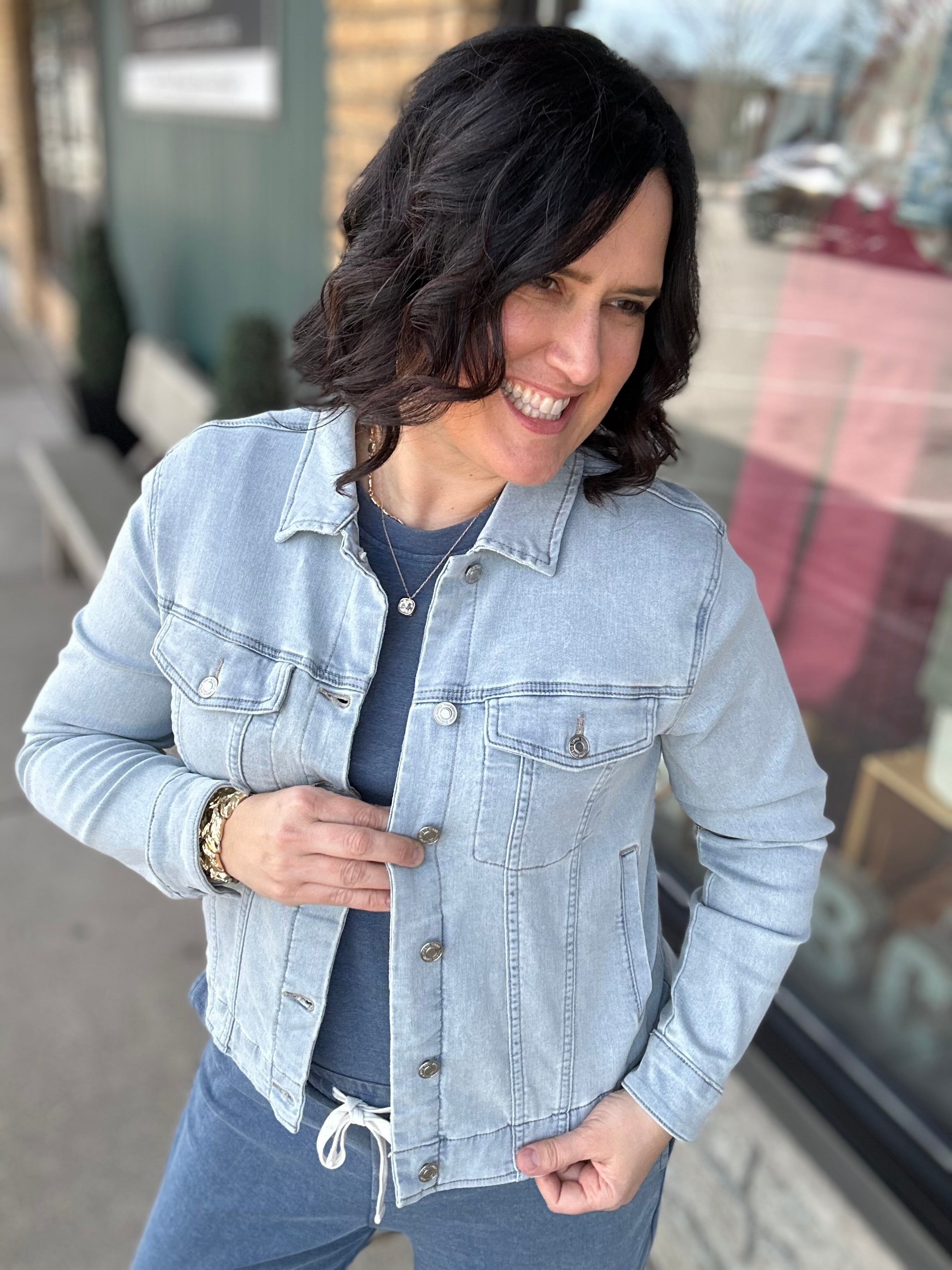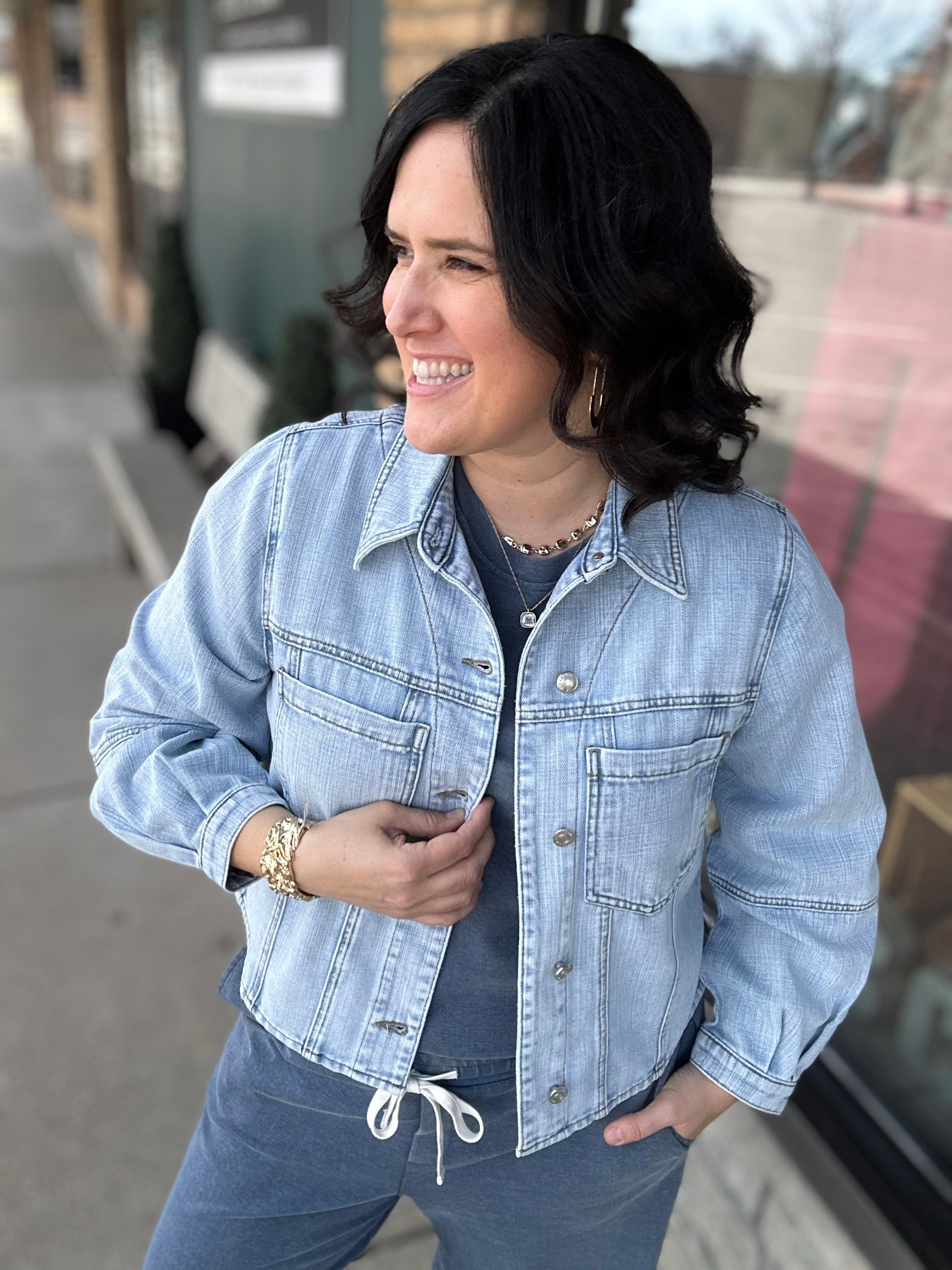 Layered look: Throw on a denim jacket, cardigan, or shacket when temperatures drop.