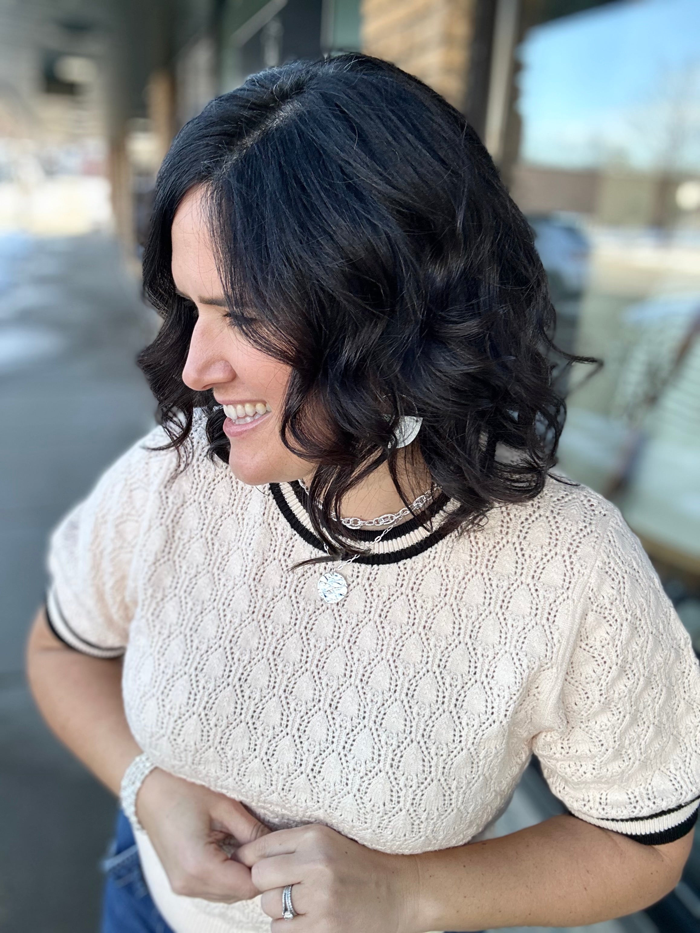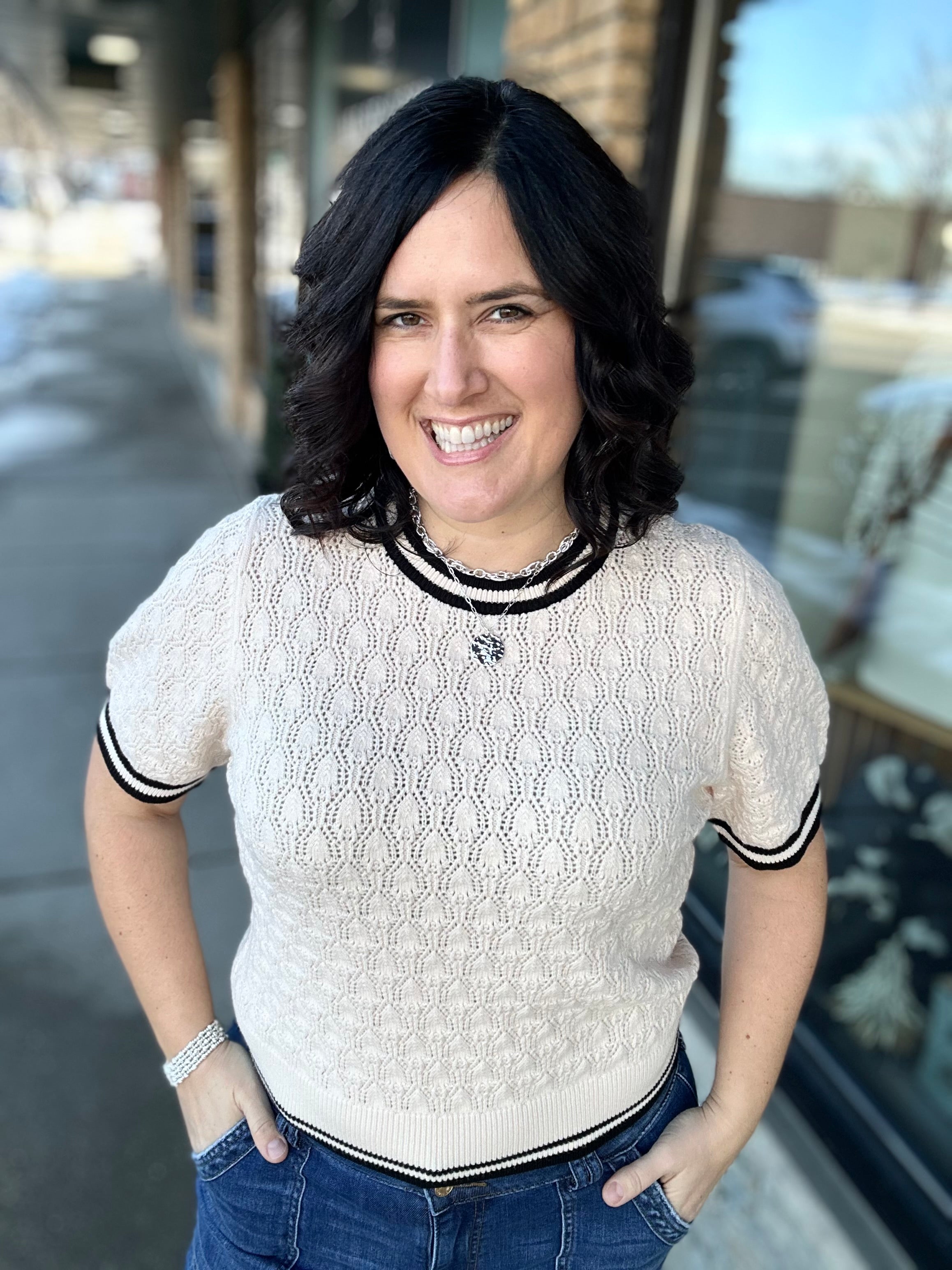 Effortless, elevated, and endlessly wearable — the Cream Short Sleeve Knit Top from THML is the kind of piece you’ll reach for again and again. With its soft knit feel and subtle black stripe accents, it blends classic style with a modern, polished twist.