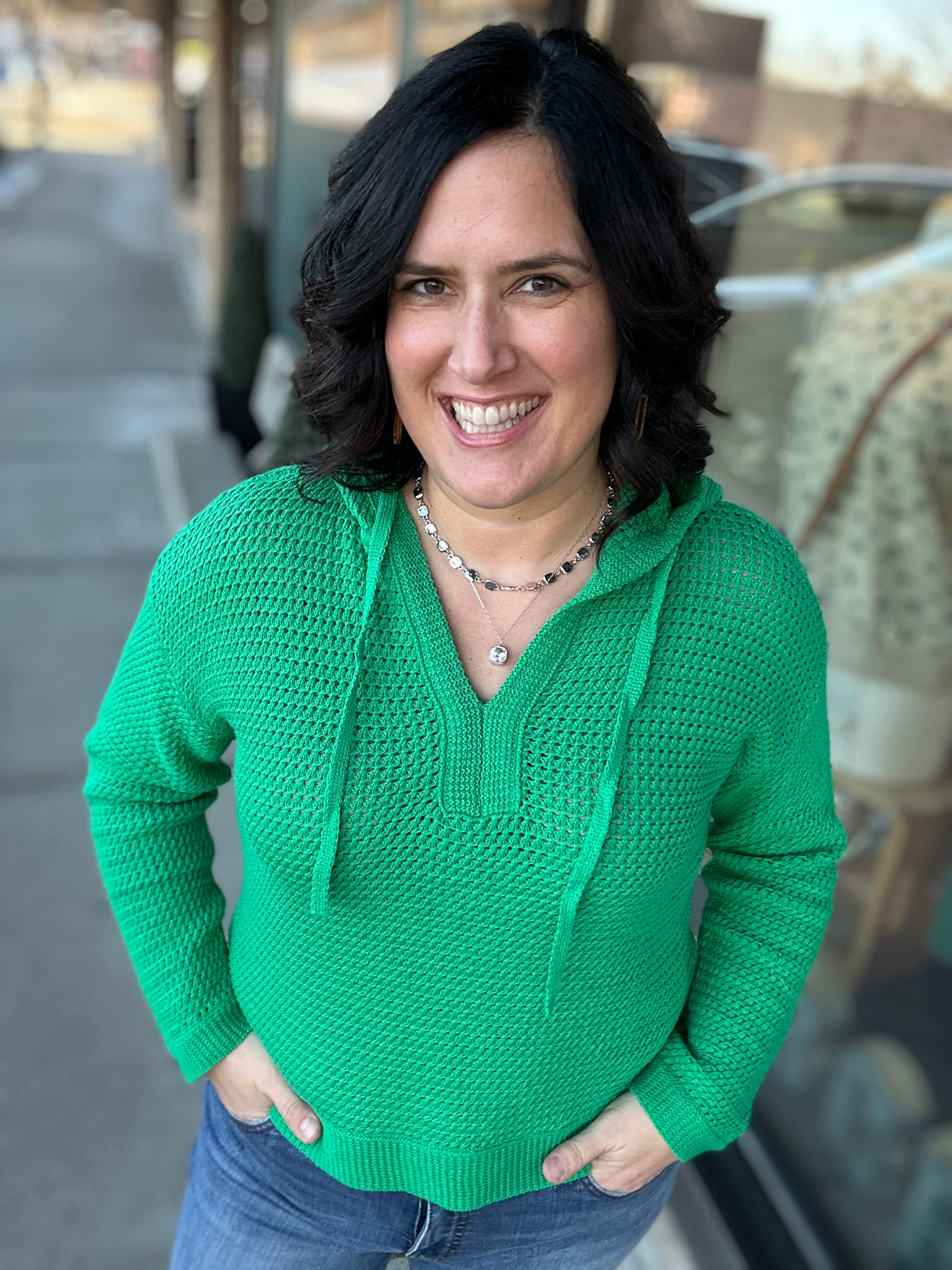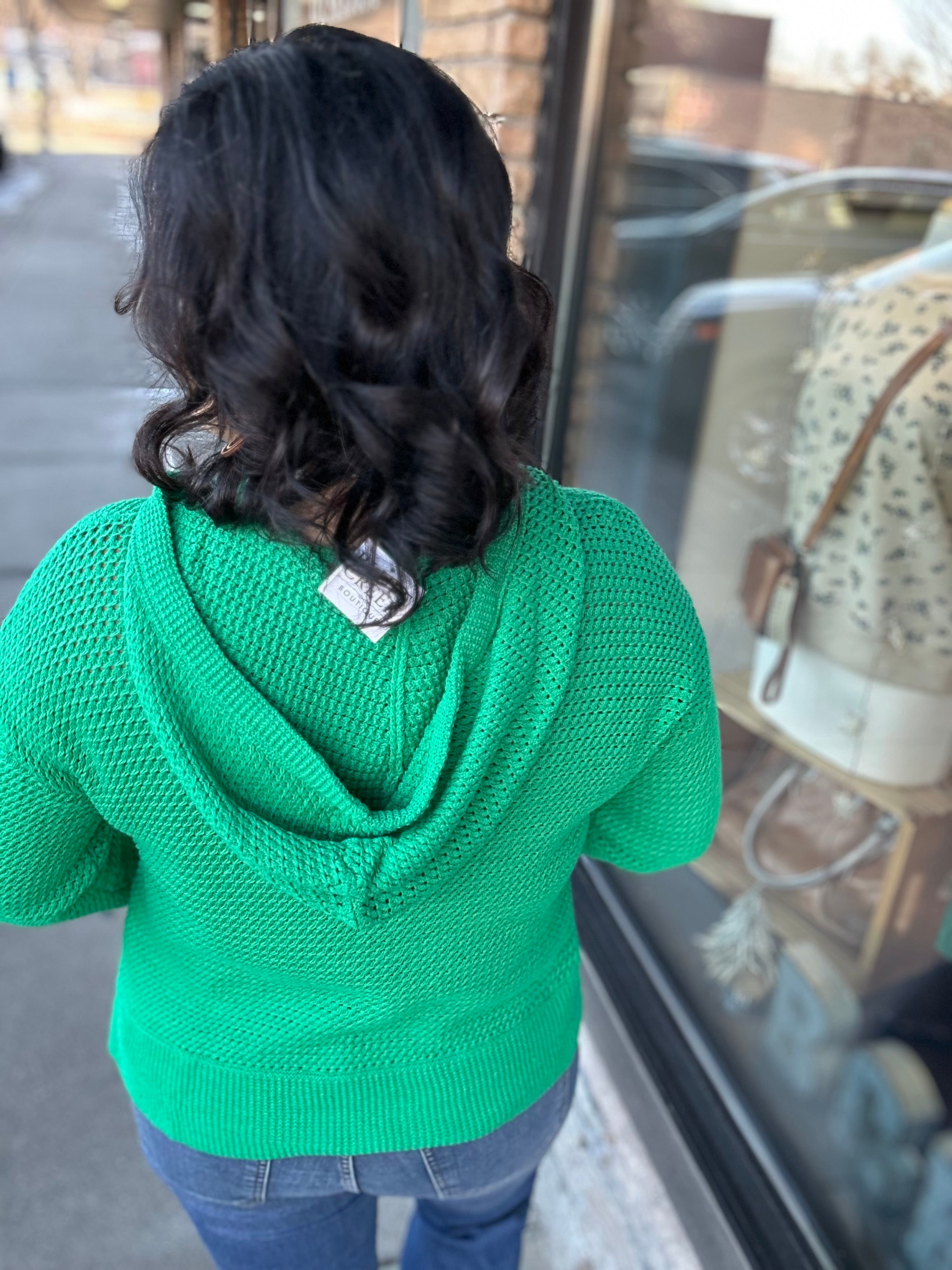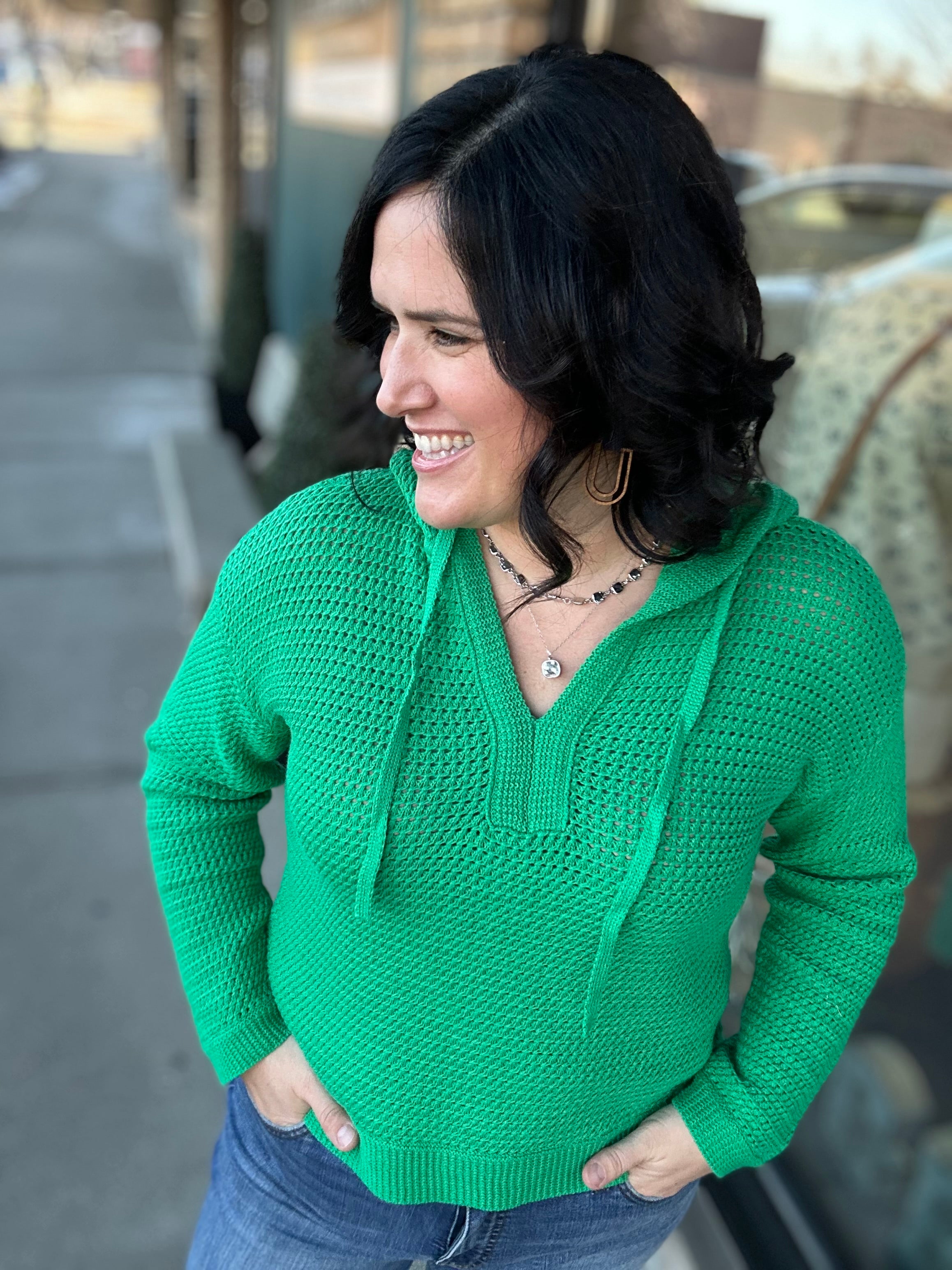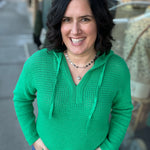 Fresh, fun, and perfectly on trend for spring — this green drawstring knit sweater is one of those pieces that instantly brightens your wardrobe. Designed with a flattering V-neckline and adjustable drawstrings, it blends casual comfort with elevated detail. The beautiful knit texture throughout gives it that special, eye-catching finish while still keeping it easy and wearable.