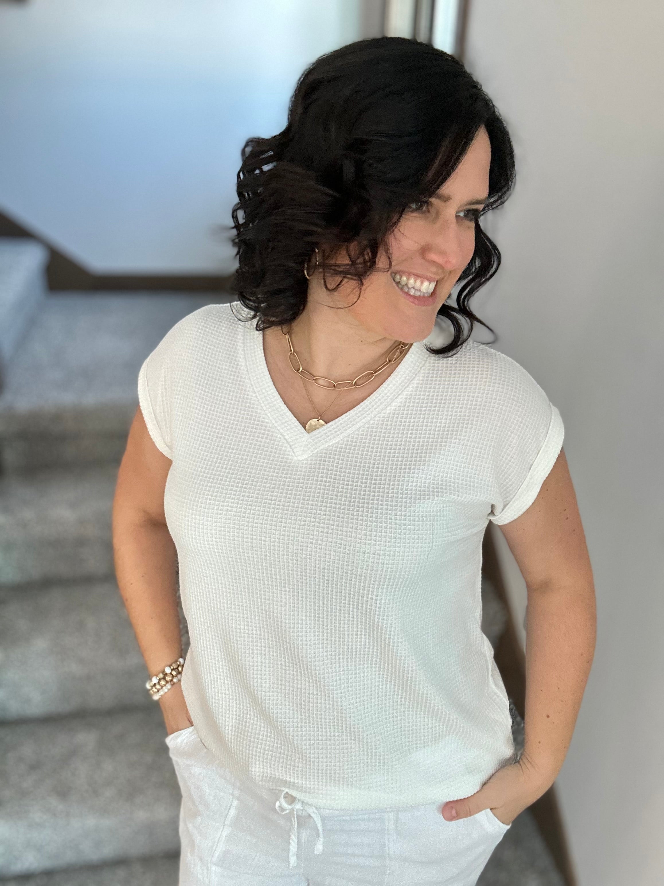 ✨ An easy, everyday essential that feels just as good as it looks — the Andree Waffle Knit V-Neck Top is a must-have for effortless style.