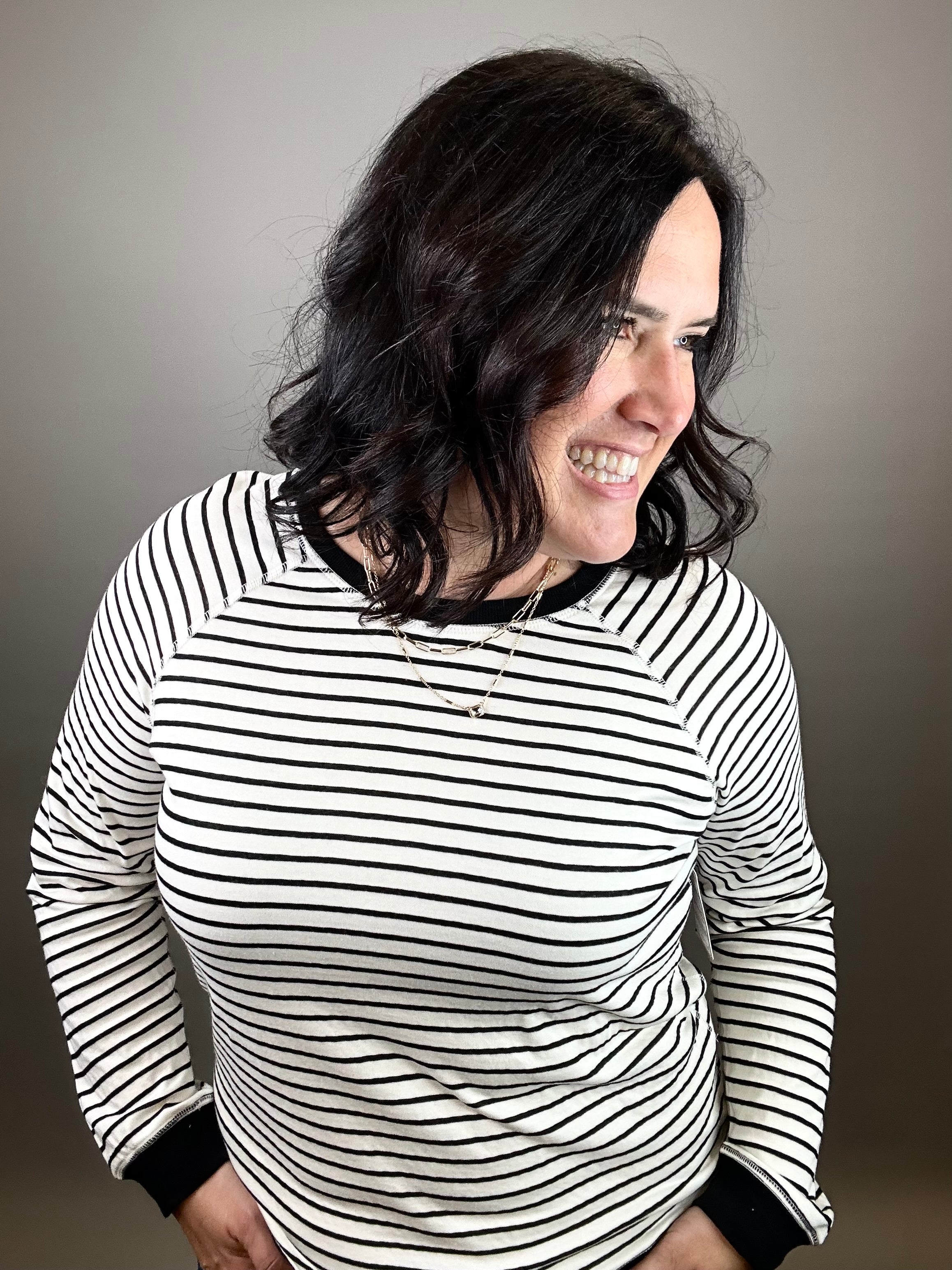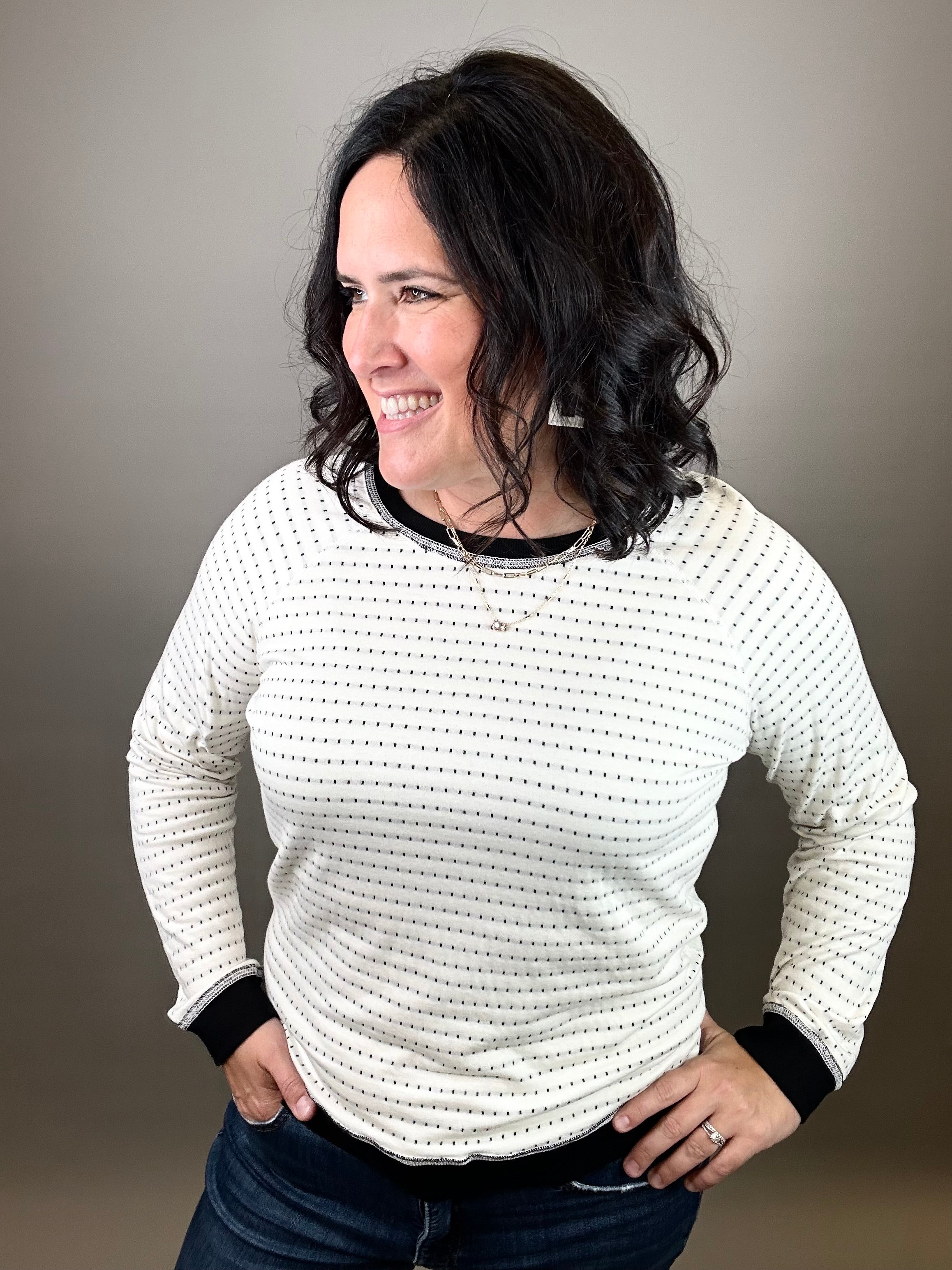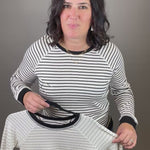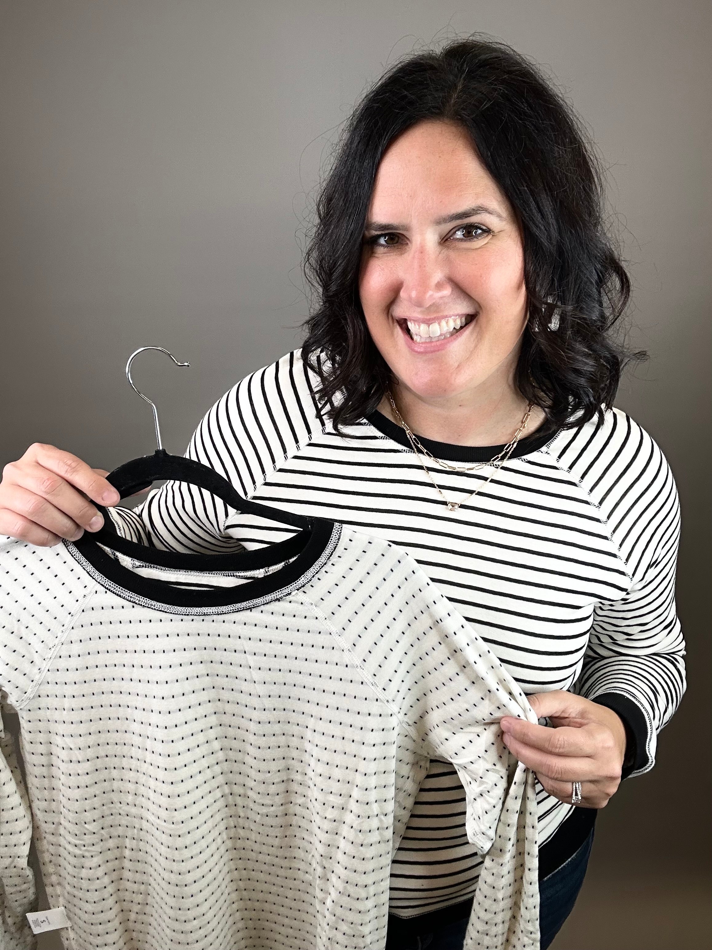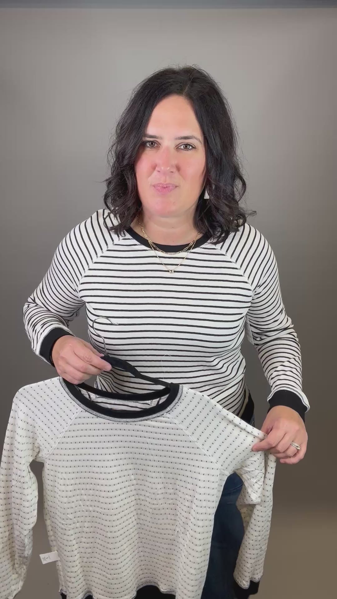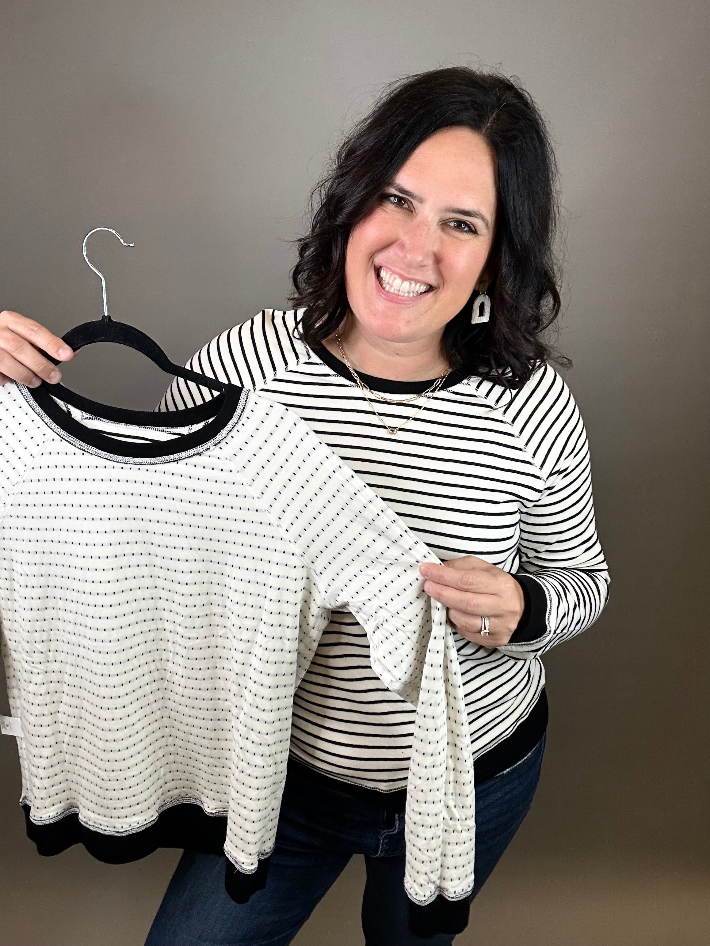 Twice the style, one cozy favorite. The Frannie Top from Flag and Anthem is the ultimate in versatility — a reversible long-sleeve top that gives you two looks in one. One side features classic black stripes on a white base, while the reverse offers a charming white backdrop with tiny black polka dots. Crafted from a soft rayon-cotton blend, it’s breathable, cozy, and perfect for every season.