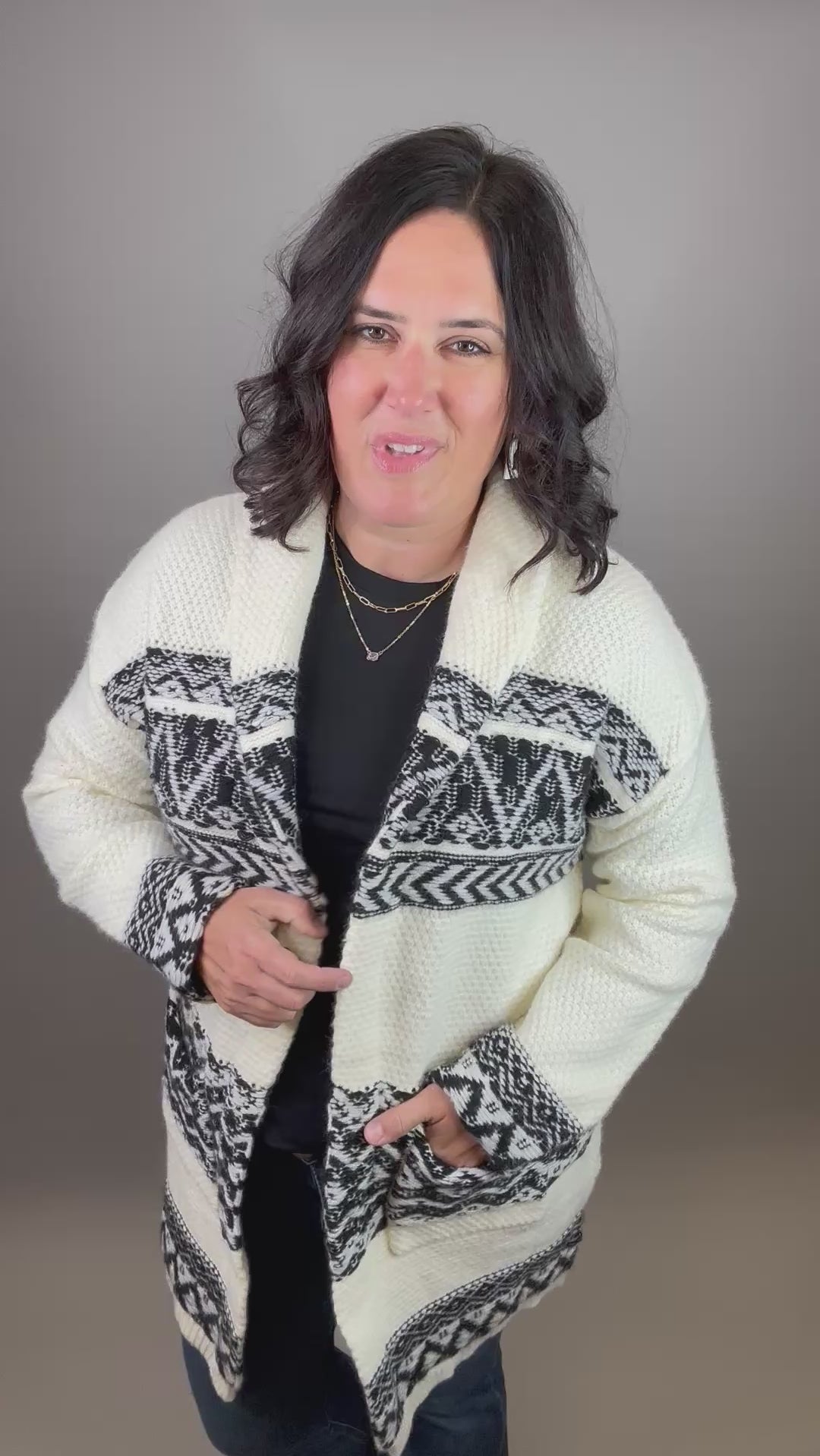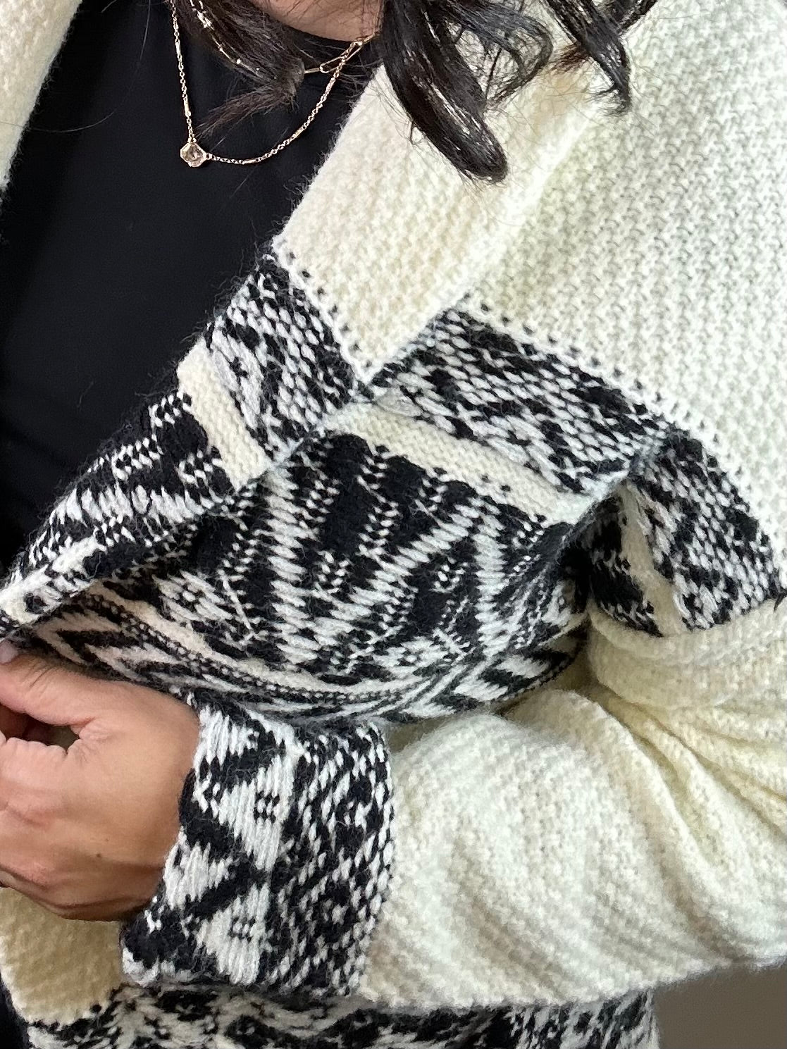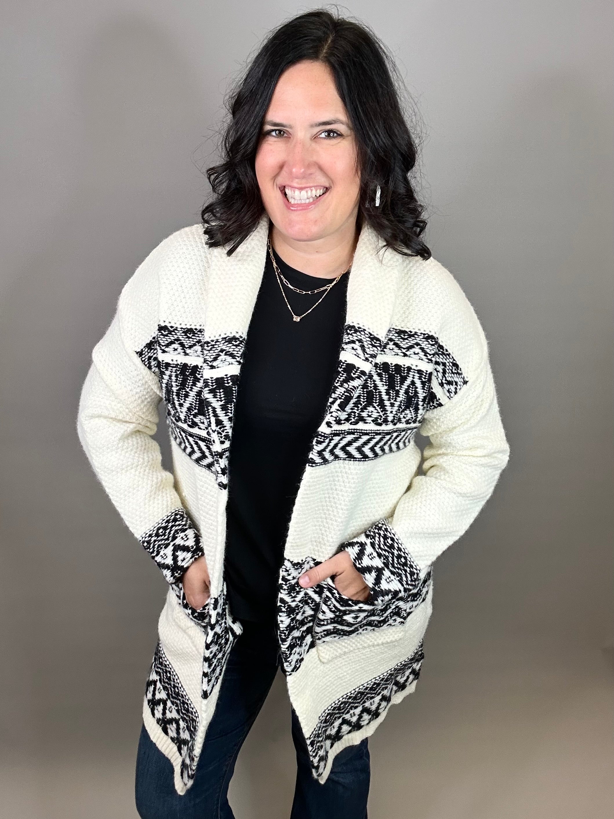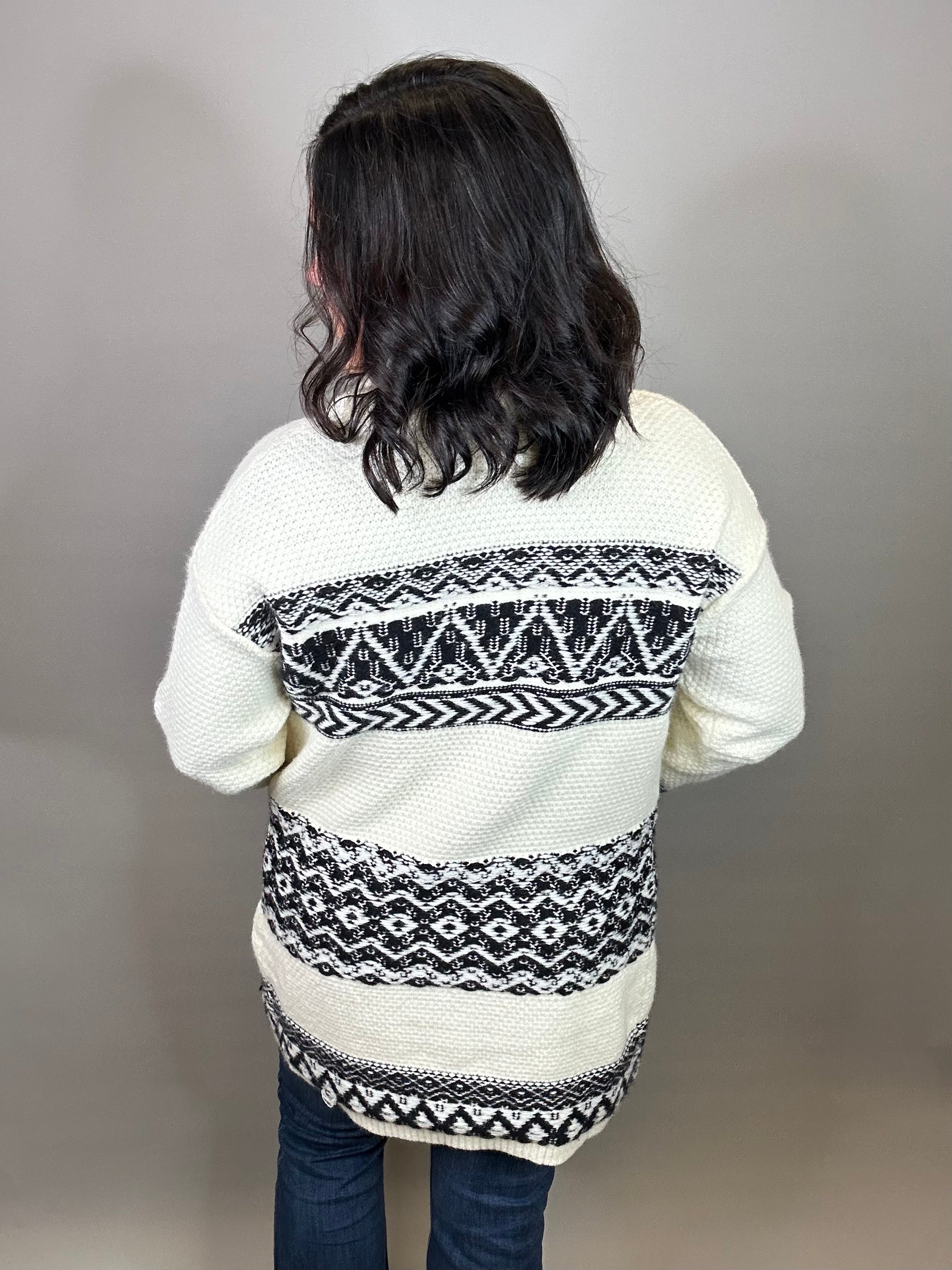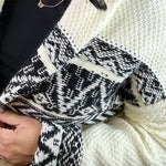 The Ivory/Black Ethnic Motif Coatigan is your ultimate statement layer—where cozy comfort meets bold design. With its shawl collar and heavy-weight knit, this piece wraps you in warmth while giving you that effortlessly chic oversized look. The striking ethnic motif pattern adds a touch of artistry, making it more than just a sweater—it’s a conversation starter.