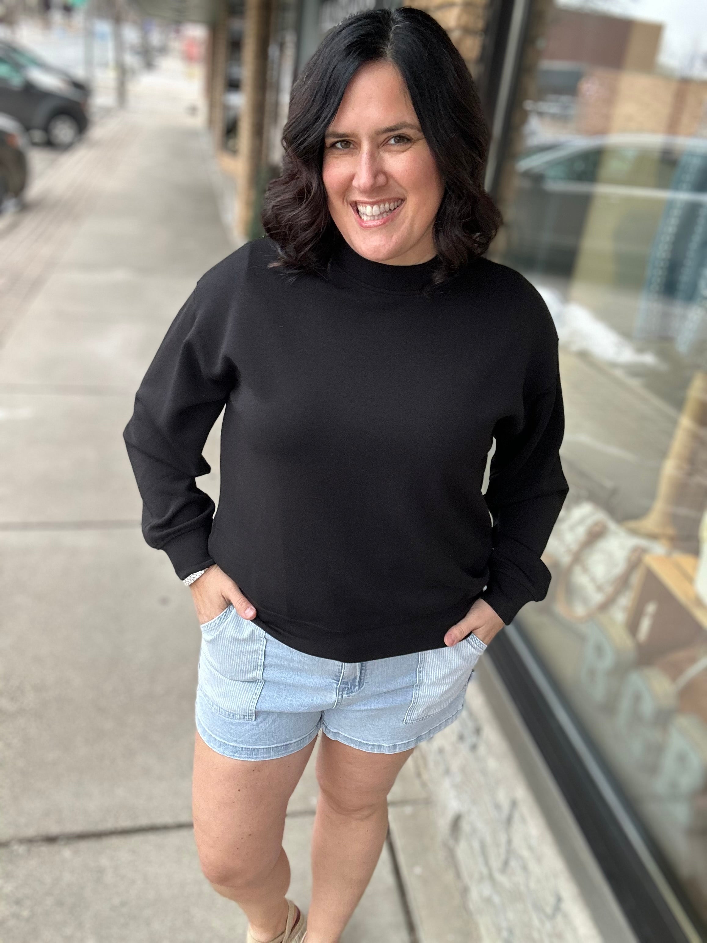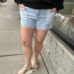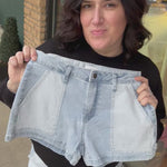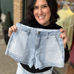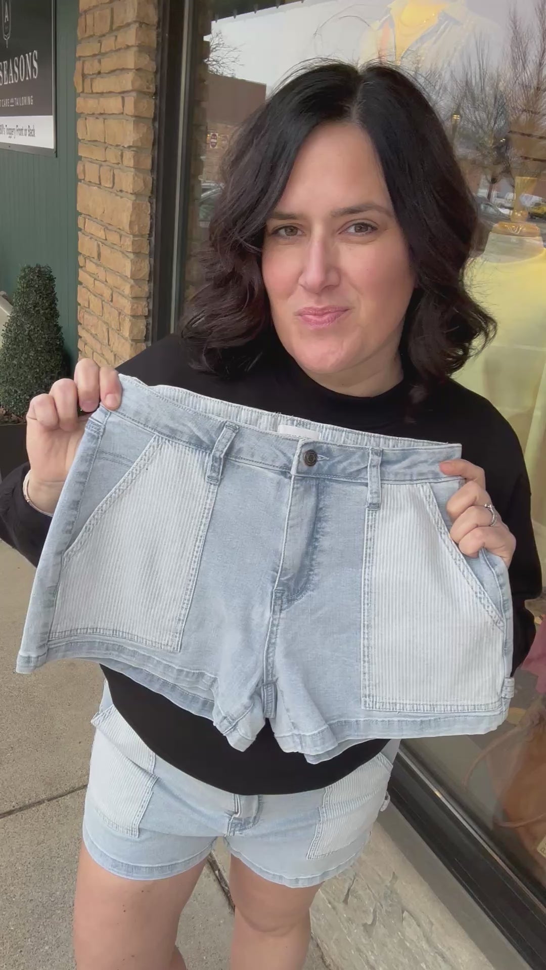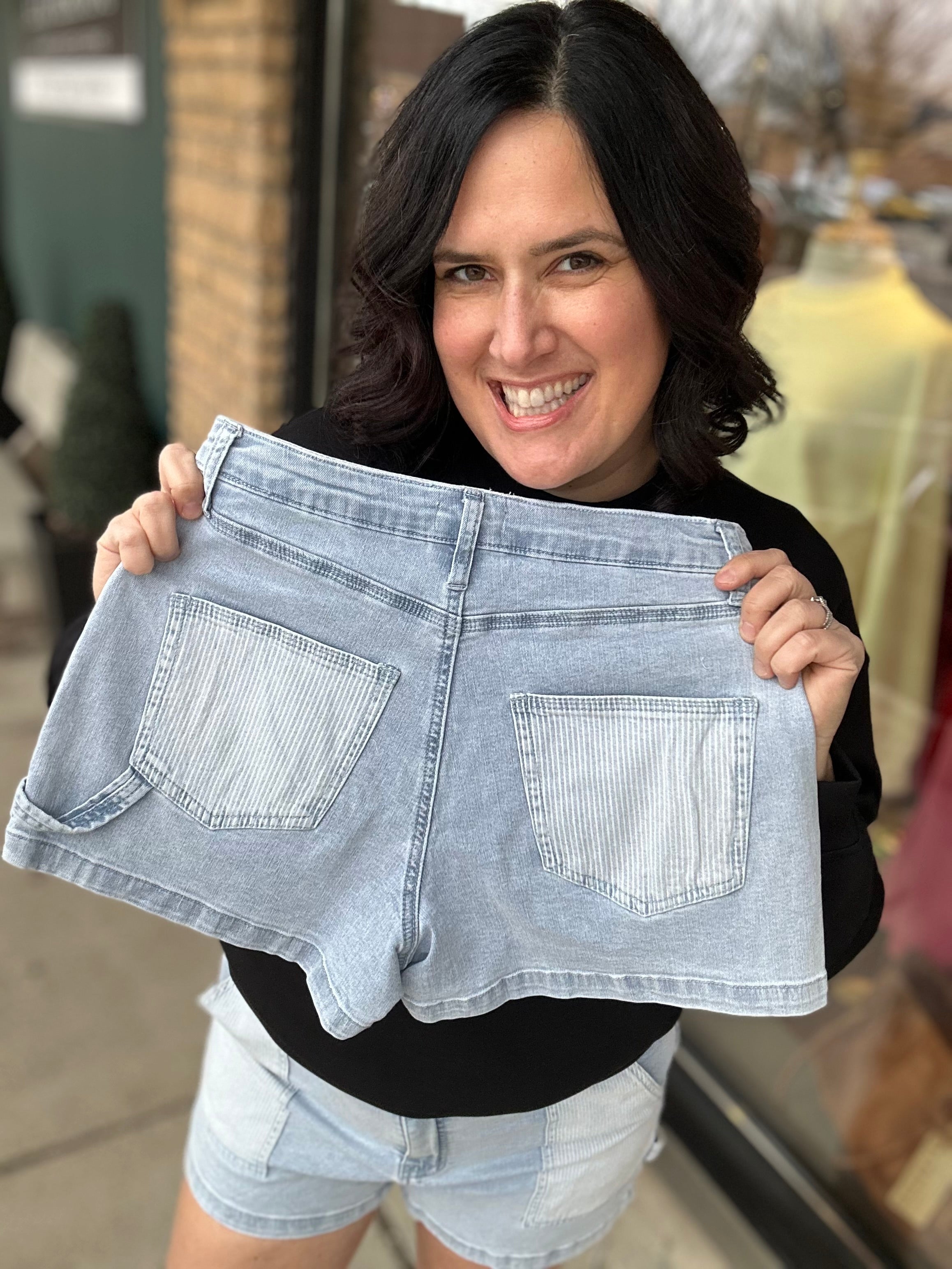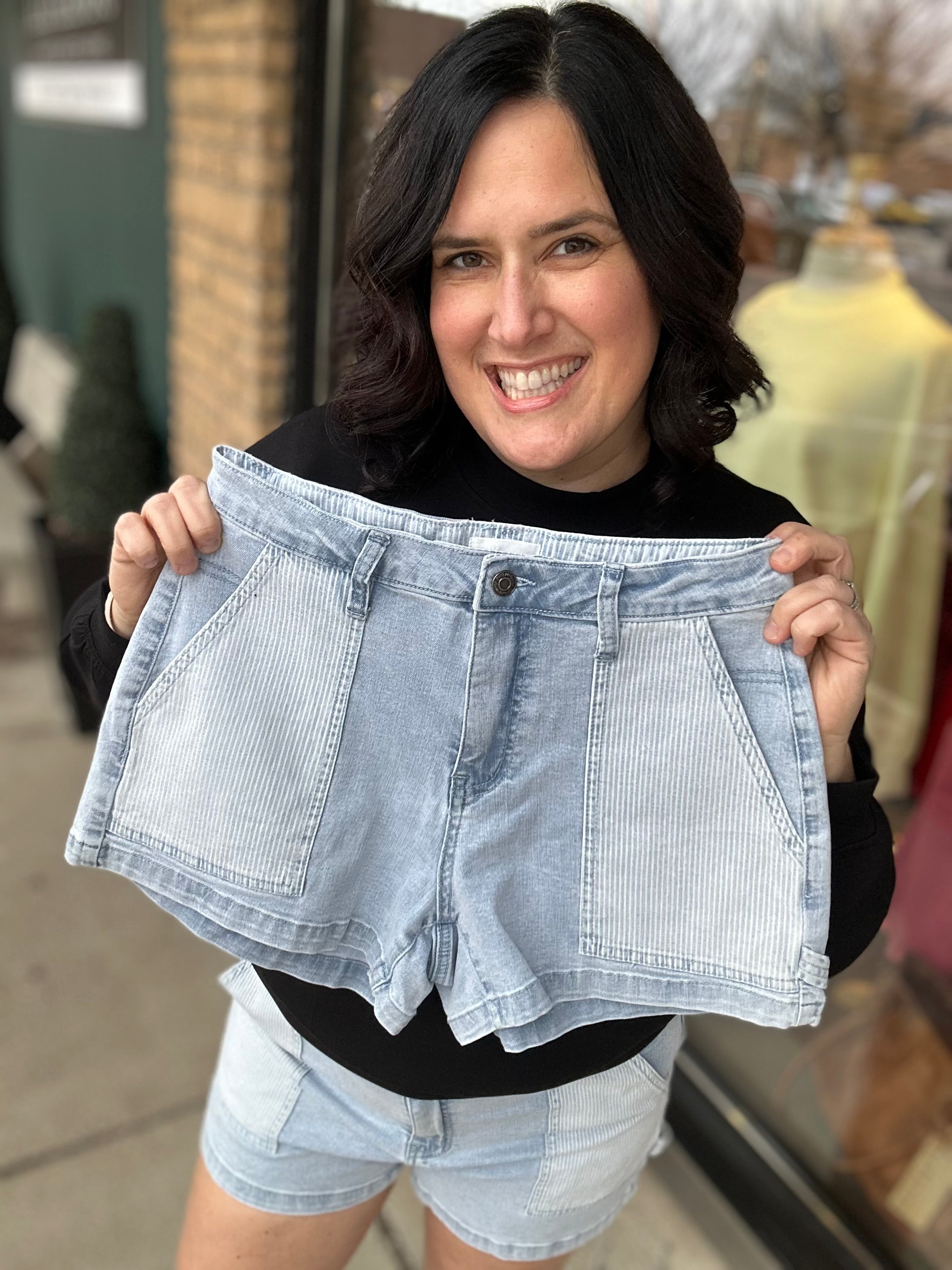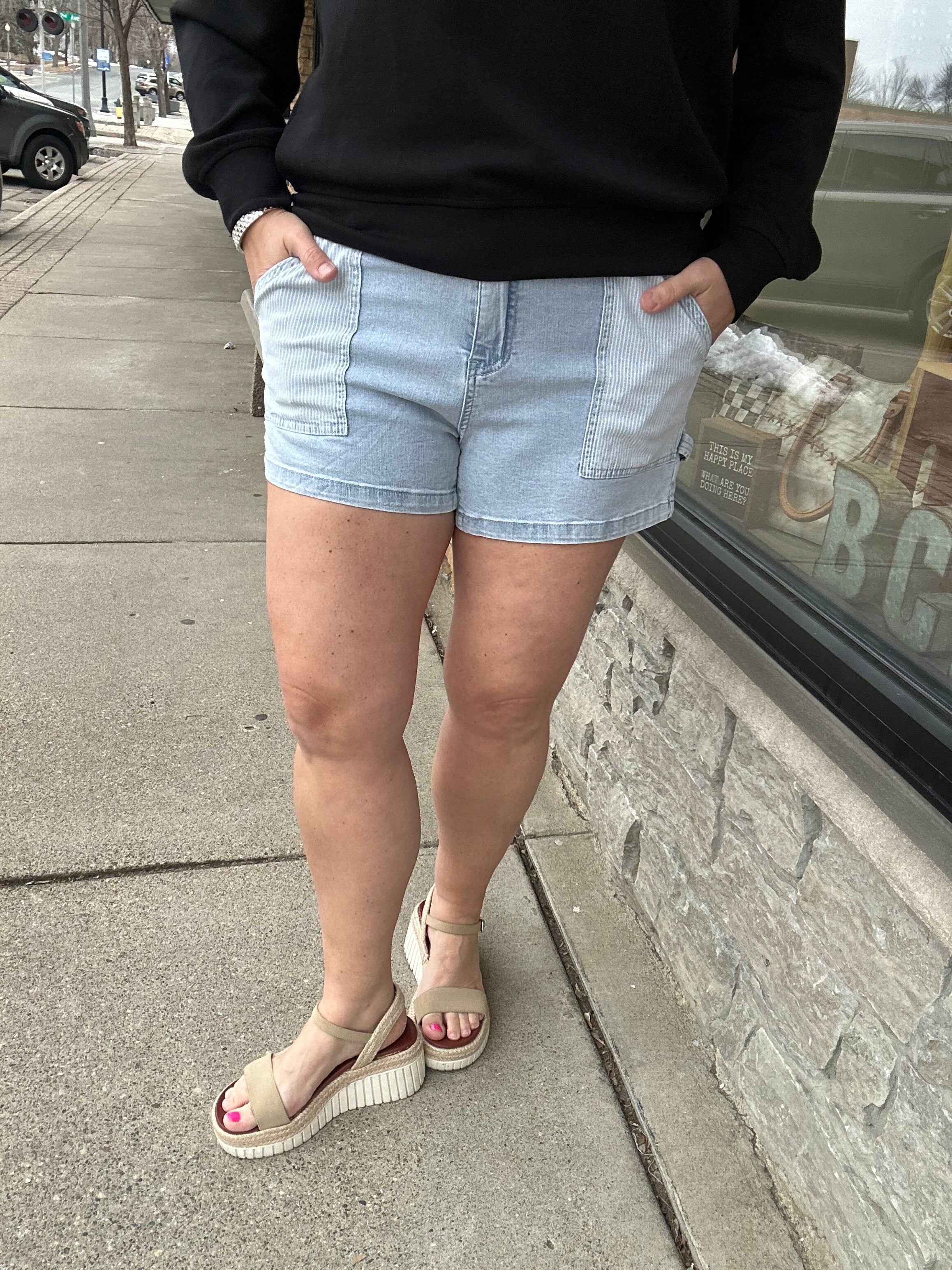 Designed in a flattering mid-rise (high-waisted feel) silhouette, these relaxed denim shorts feature square pocket detailing for that lived-in, effortless vibe. The subtle blue and white stripe adds a fresh coastal touch, while the soft stretch denim (98% cotton, 2% spandex) gives you comfort and movement all day long.