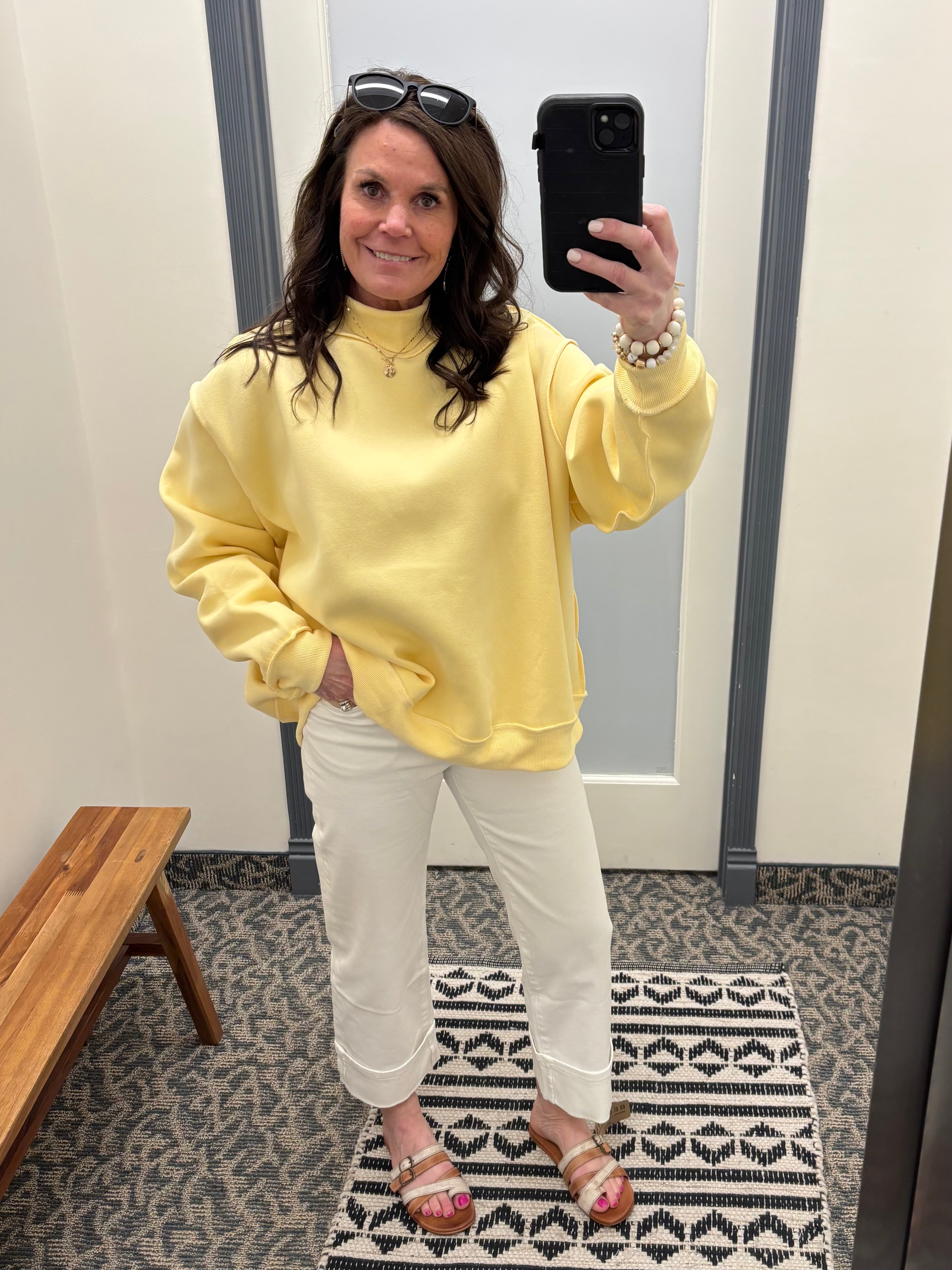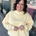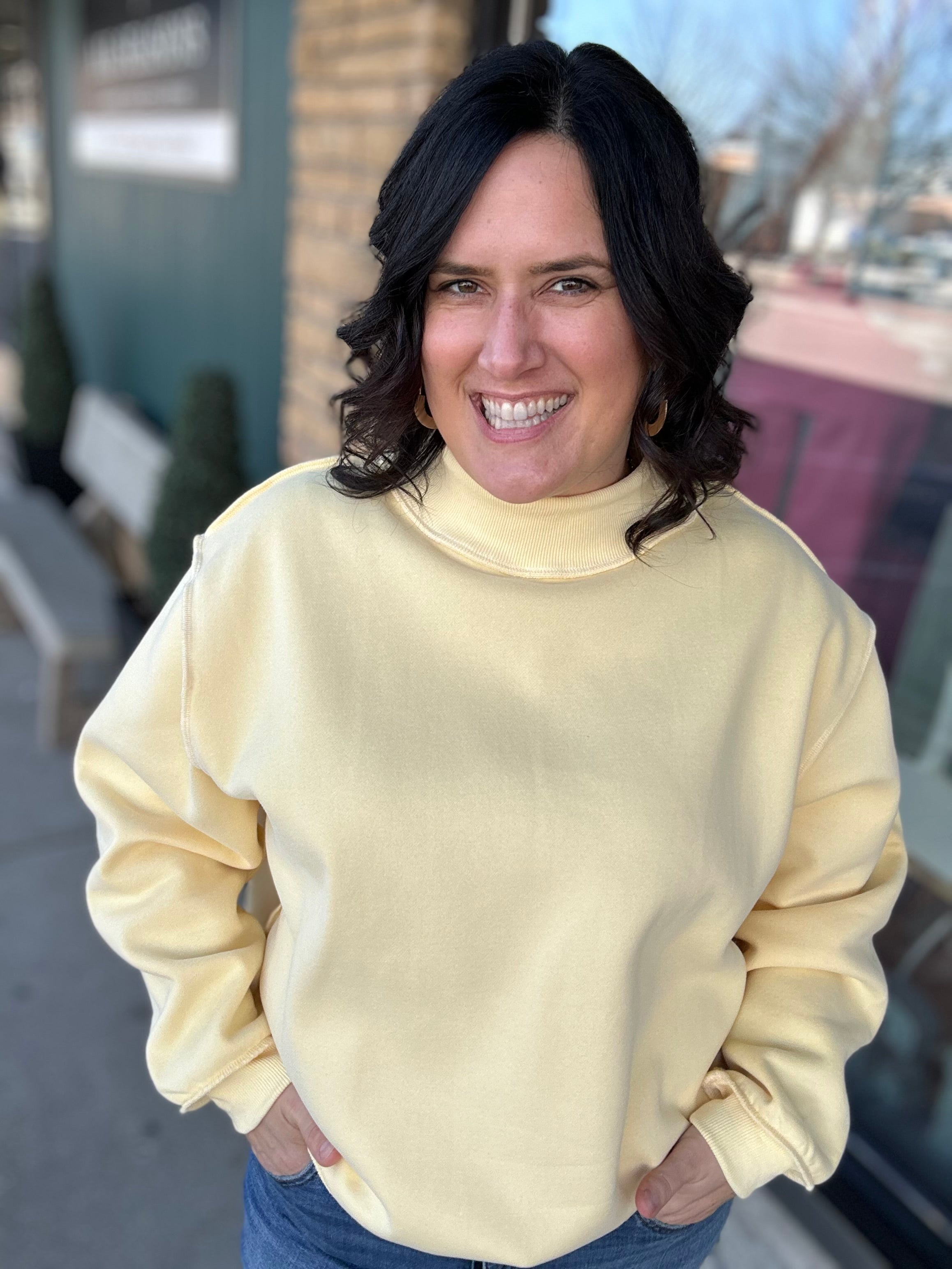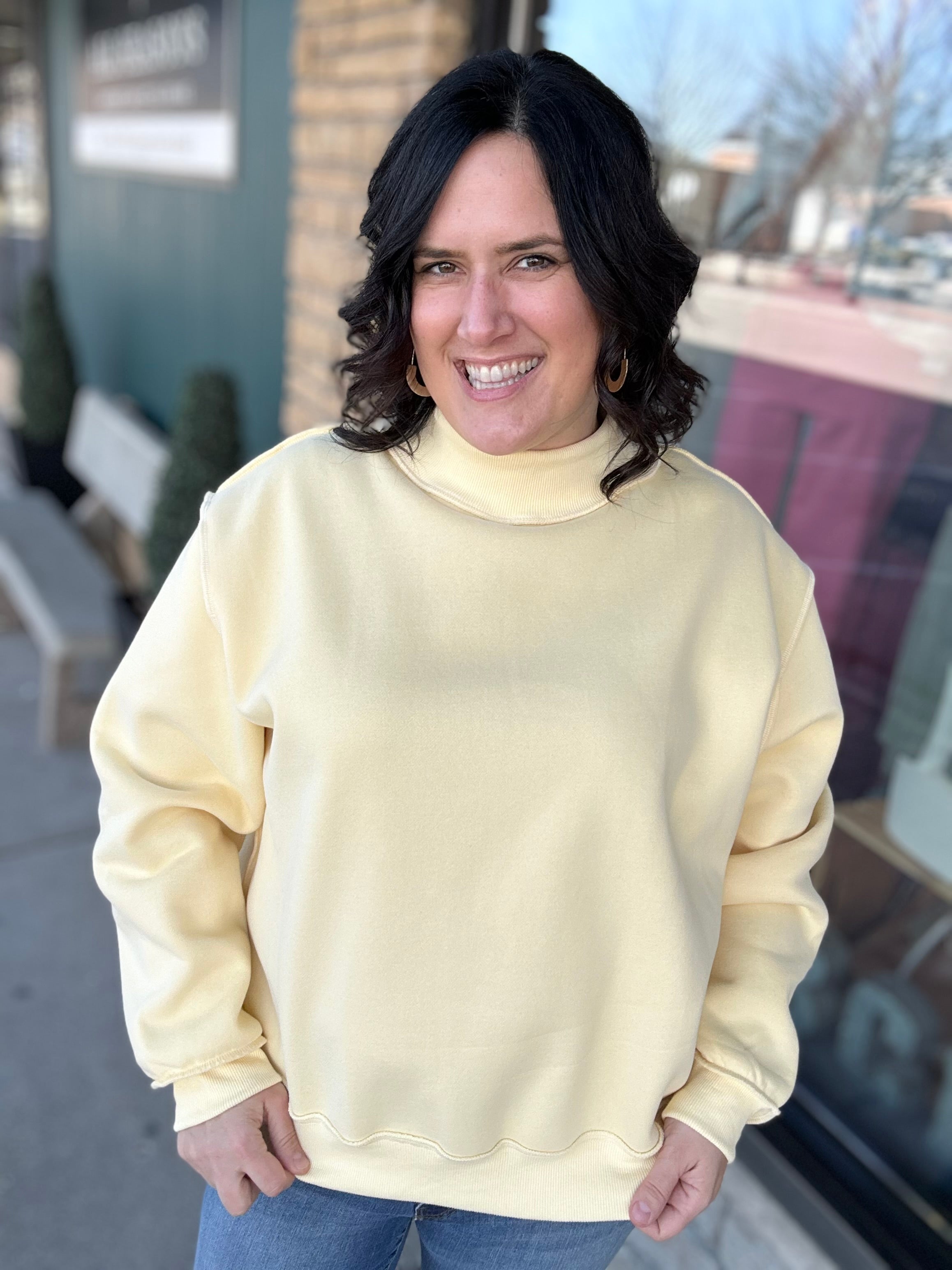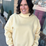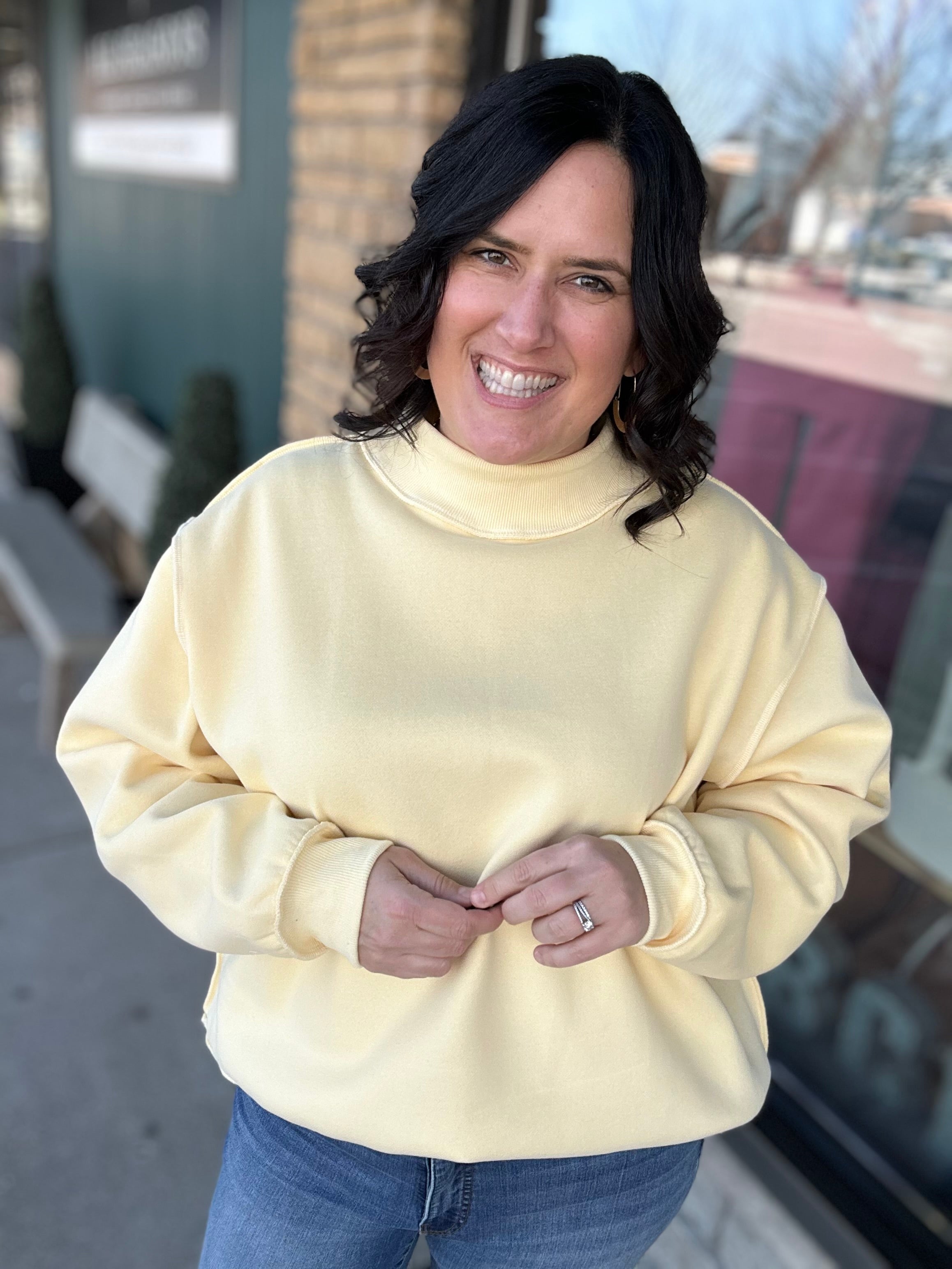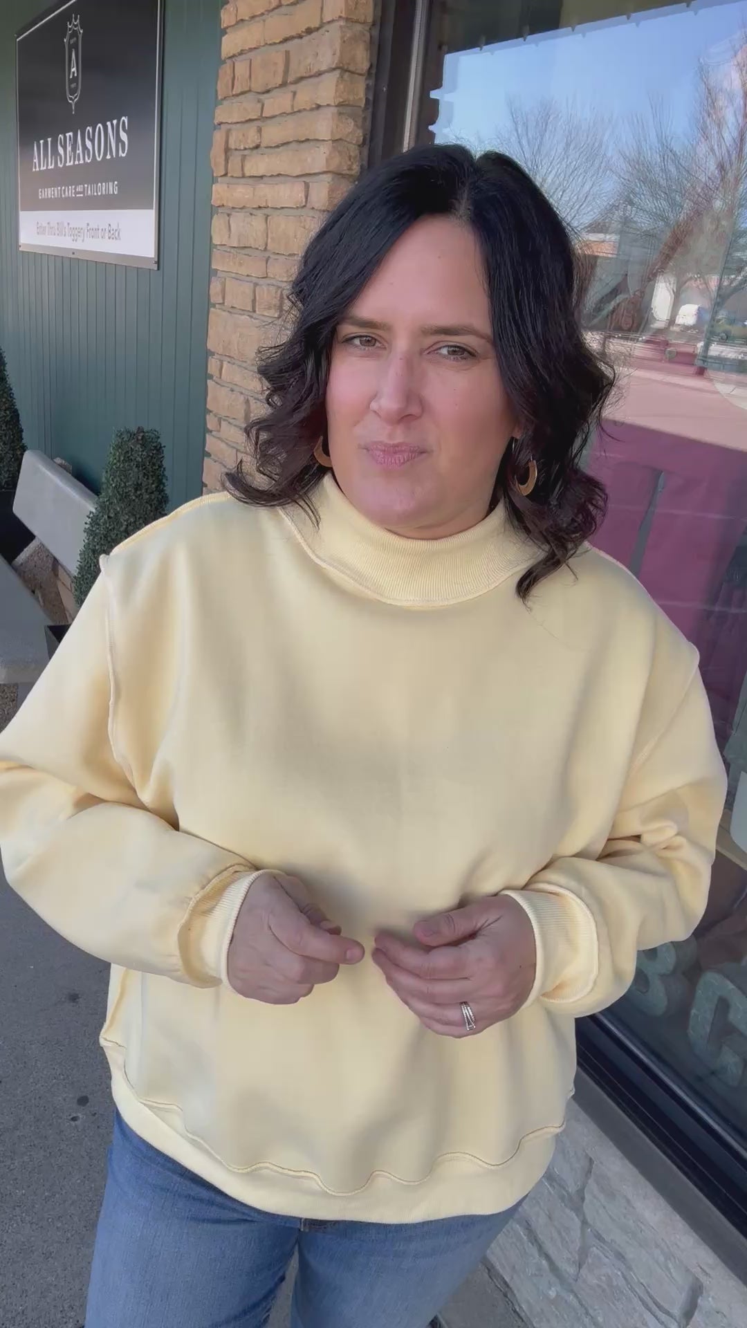 Okay… this is the cutest dang thing since sliced bread. Our Butter Yellow Solid Reversible Mock Neck Sweatshirt is oversized, cozy, and completely on trend. It’s designed to be roomy and relaxed, giving you that effortless, cool-girl vibe without sacrificing comfort.