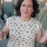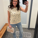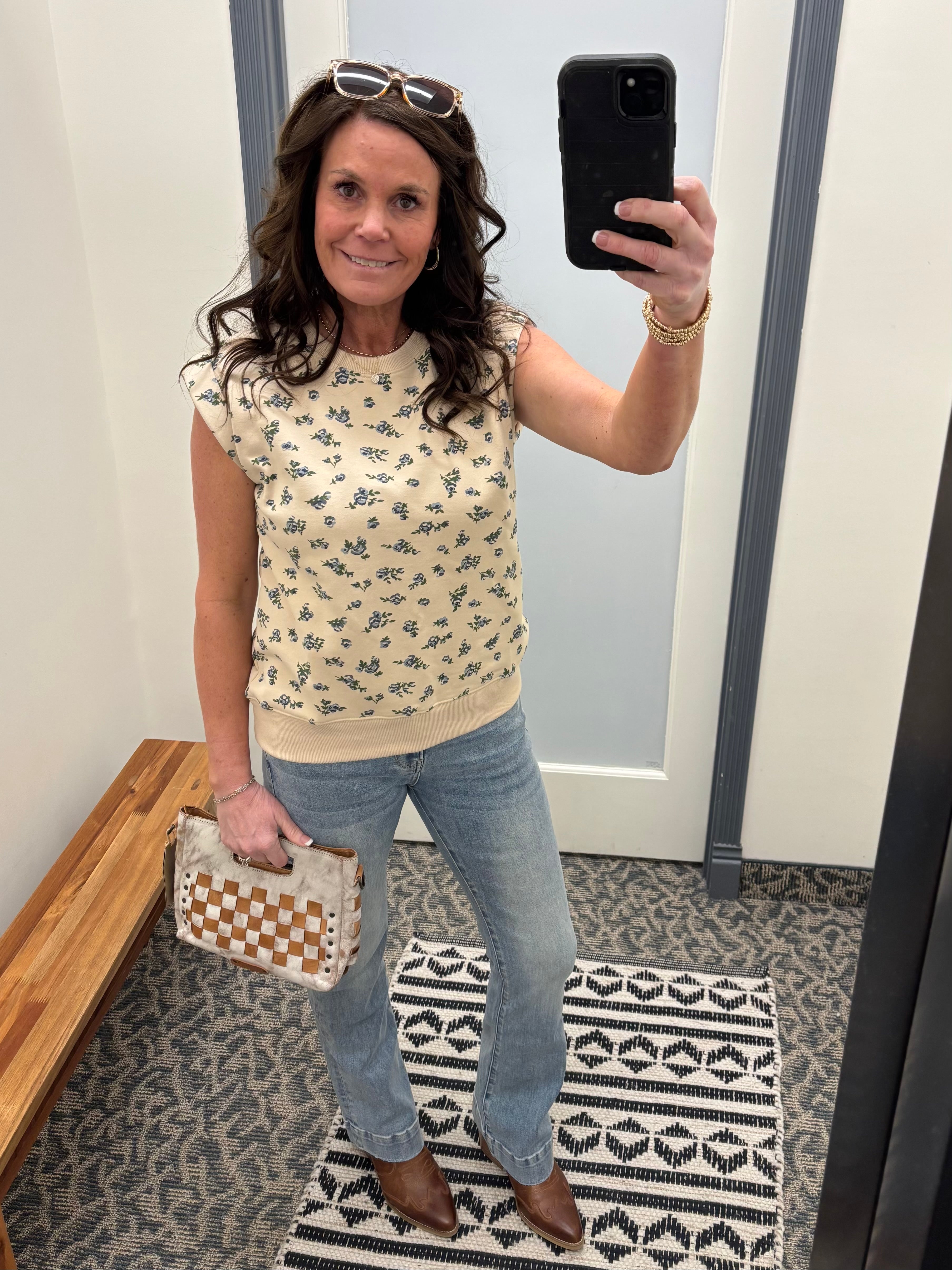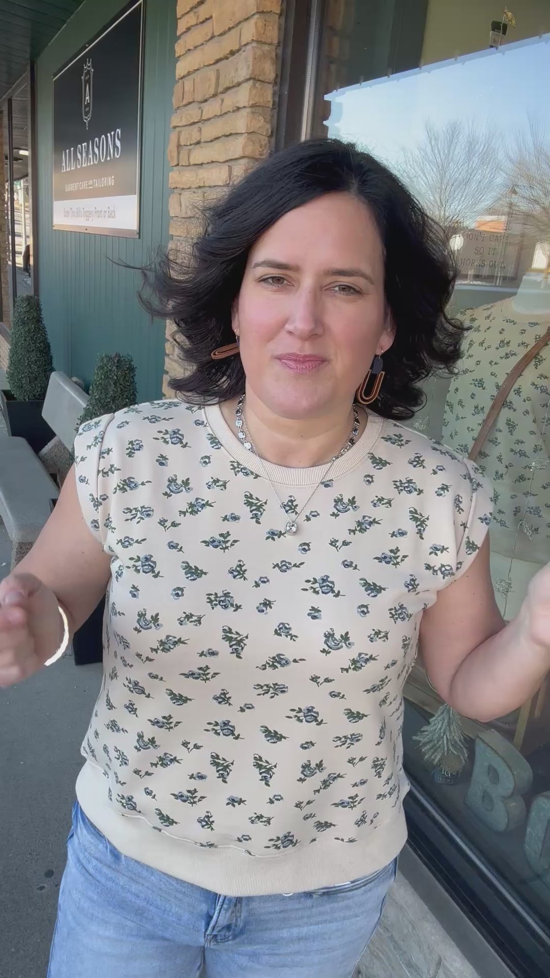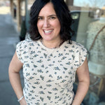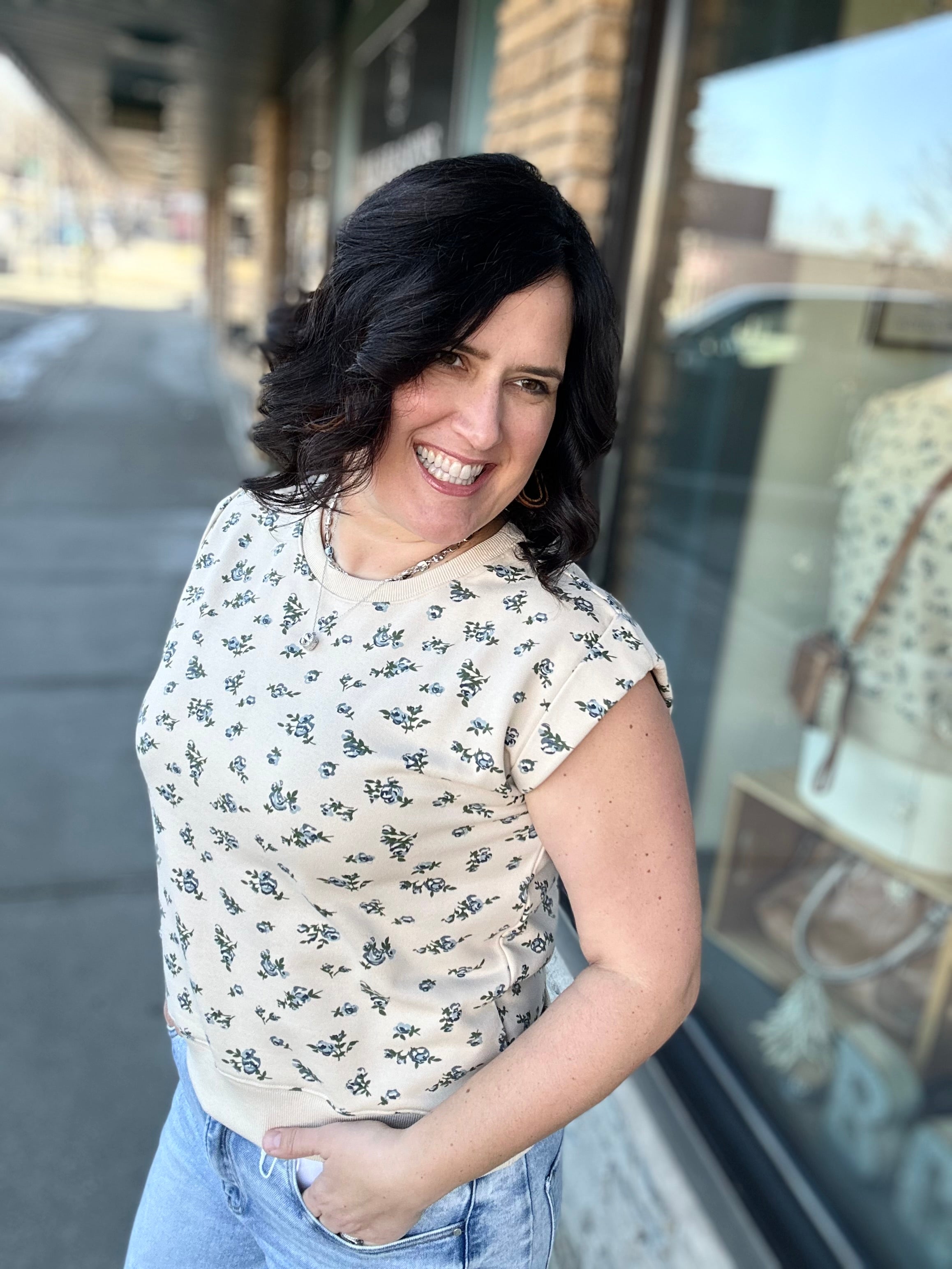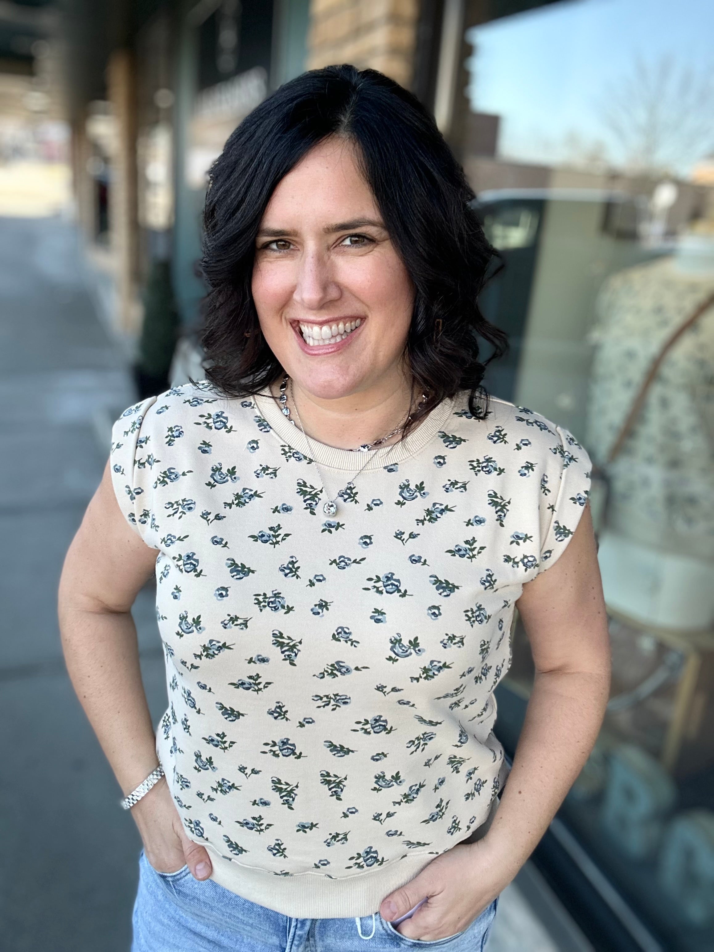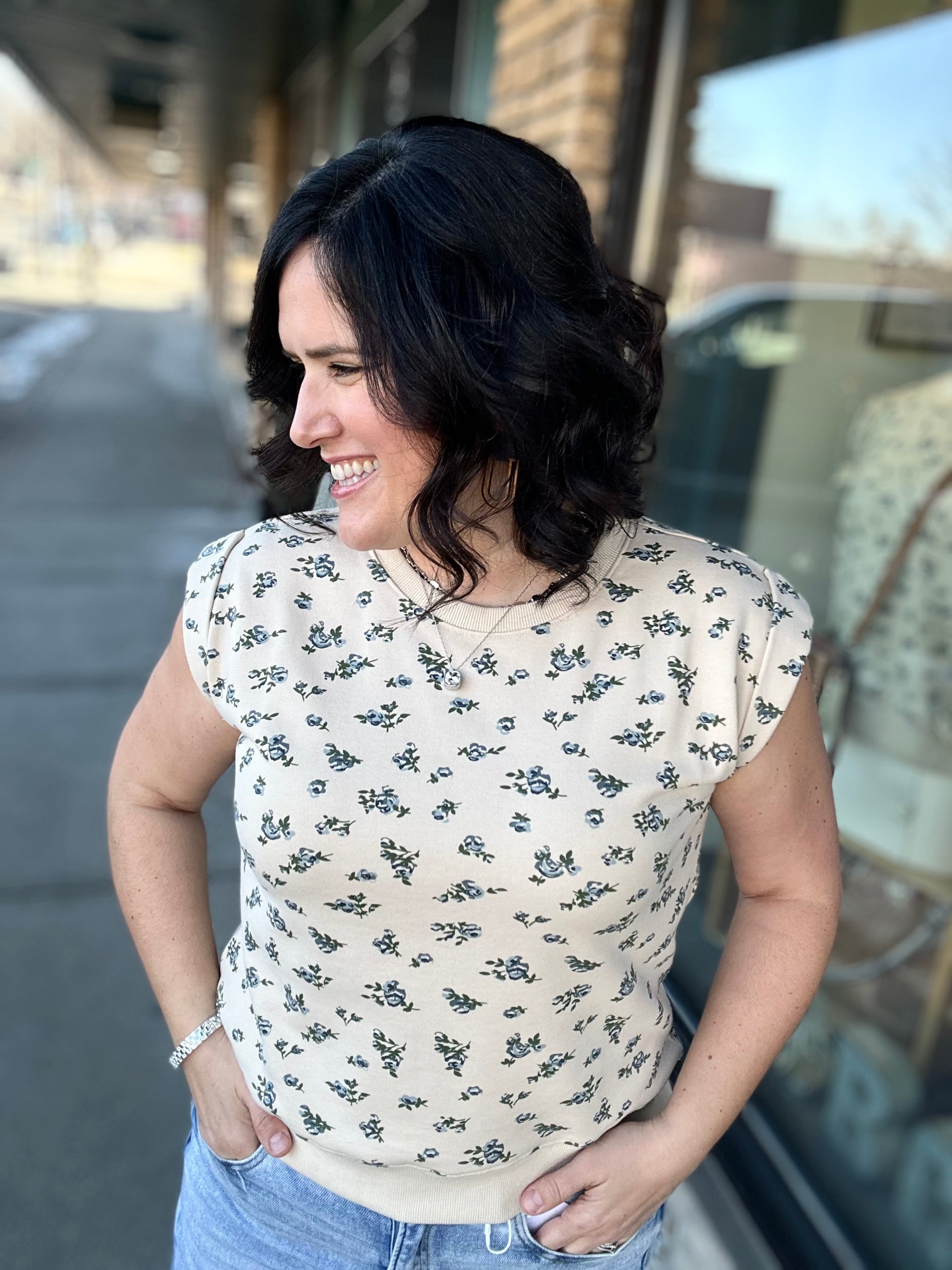 This top feels soft, broken-in, and easy from the moment you slip it on. The French terry fabric gives you that cozy sweatshirt feel, while the muscle-style sleeveless cut keeps it modern and flattering. The neutral base paired with a soft blue floral design adds just the right amount of charm without feeling overdone.
