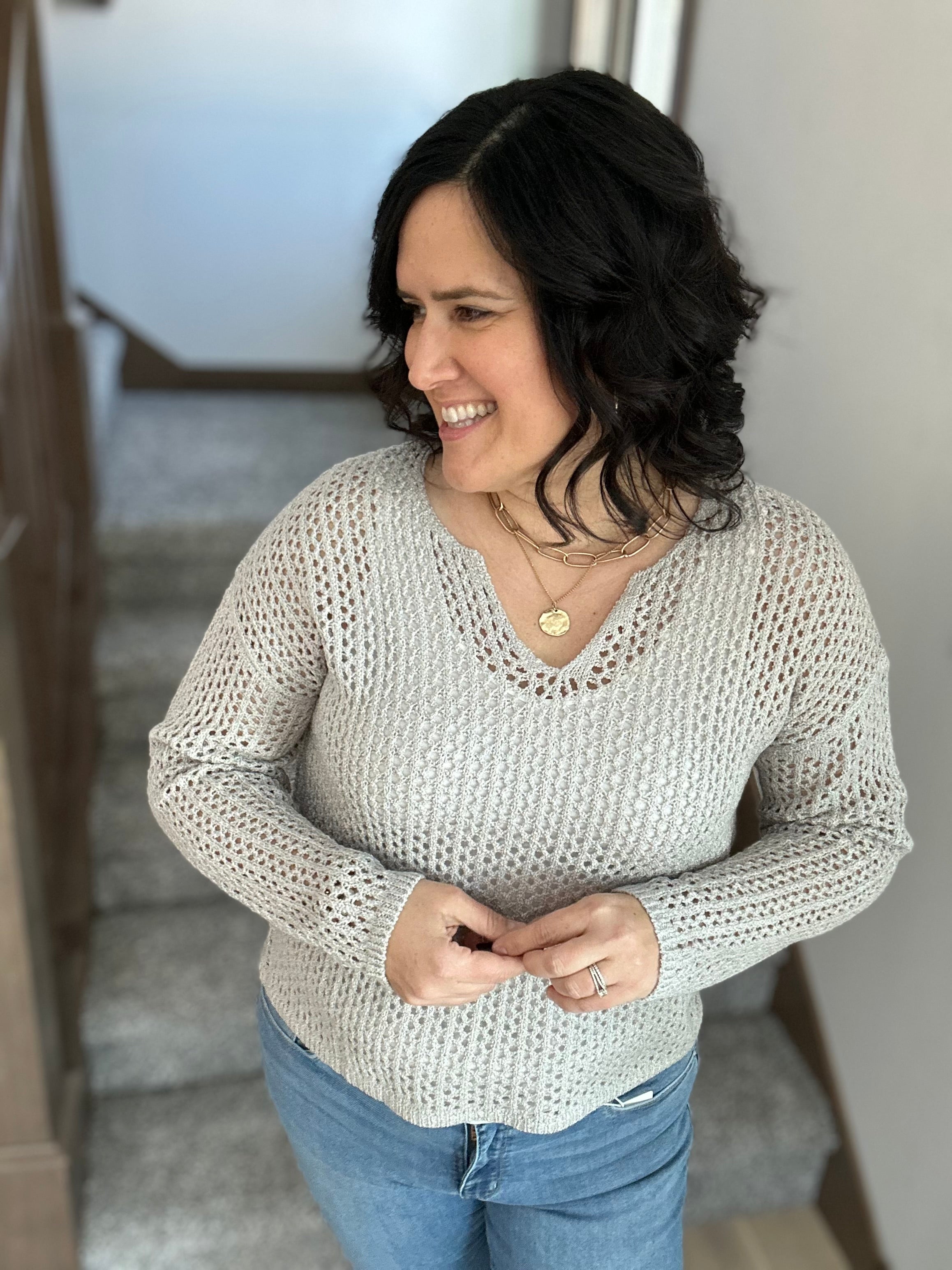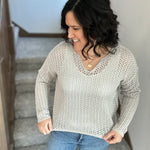 Grey Split Neck Open Knit Sweater