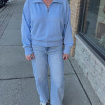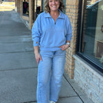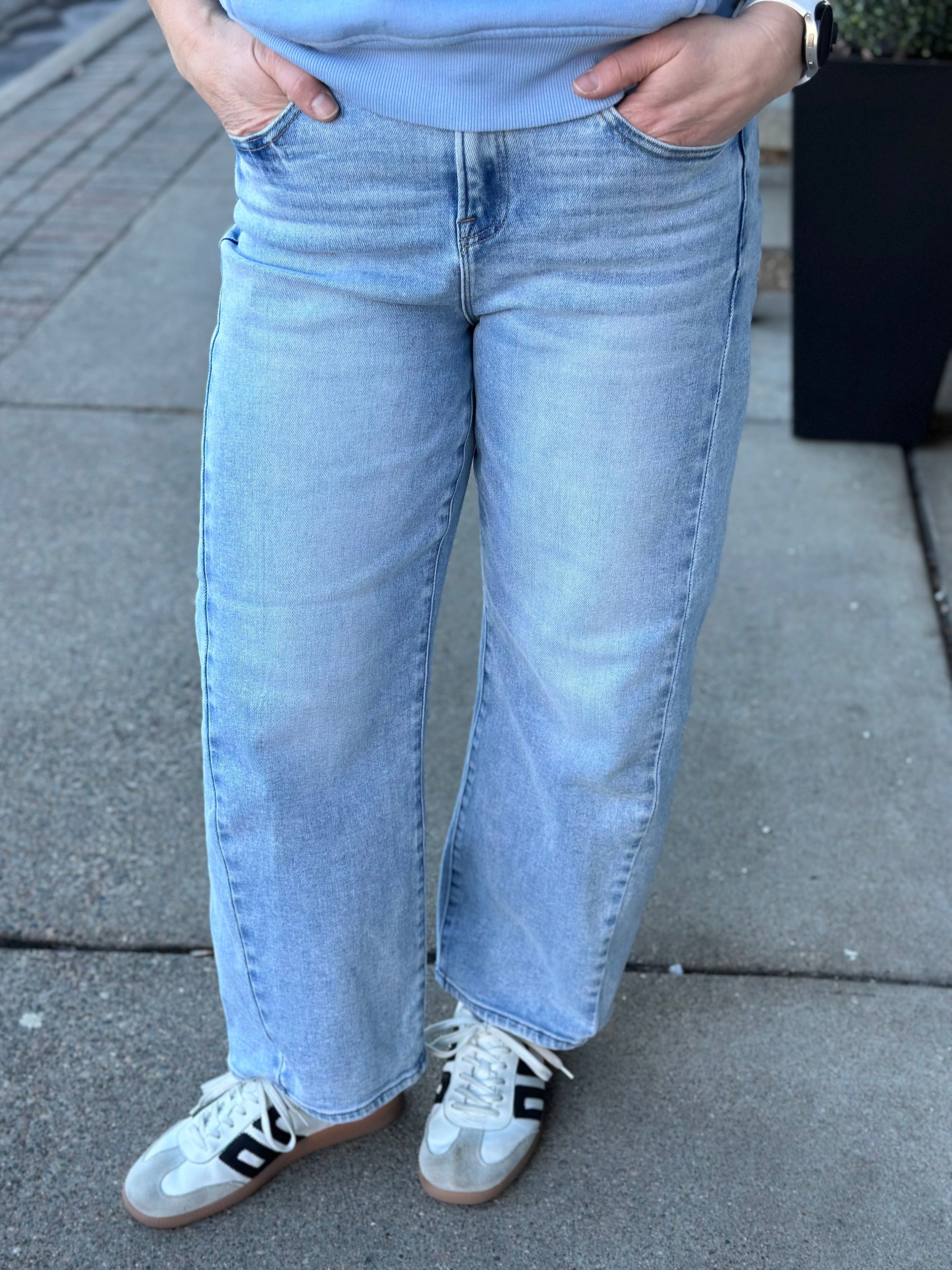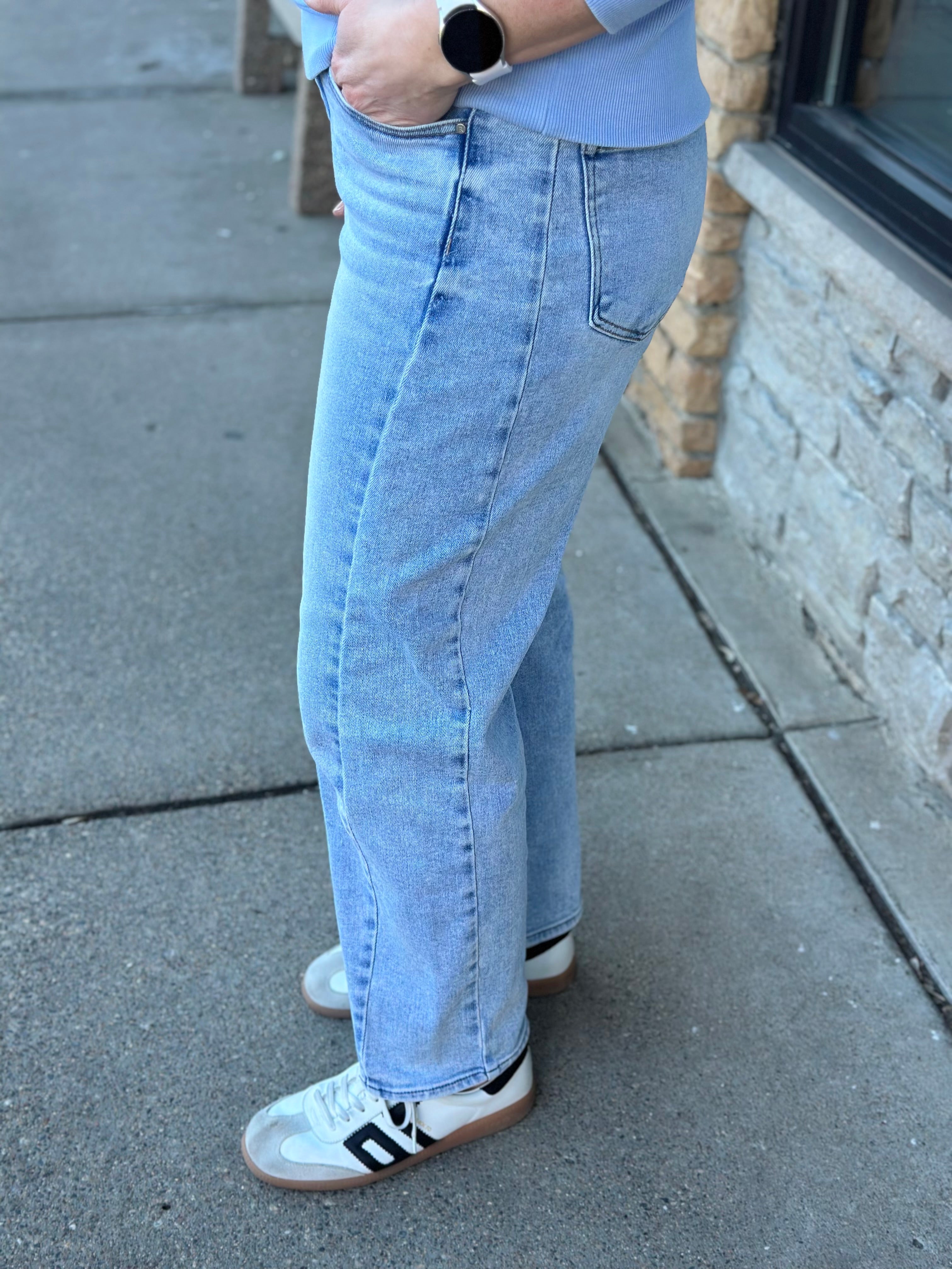 Meet your new favorite everyday denim: a light blue barrel-leg jean designed to flatter, move, and turn heads without even trying.