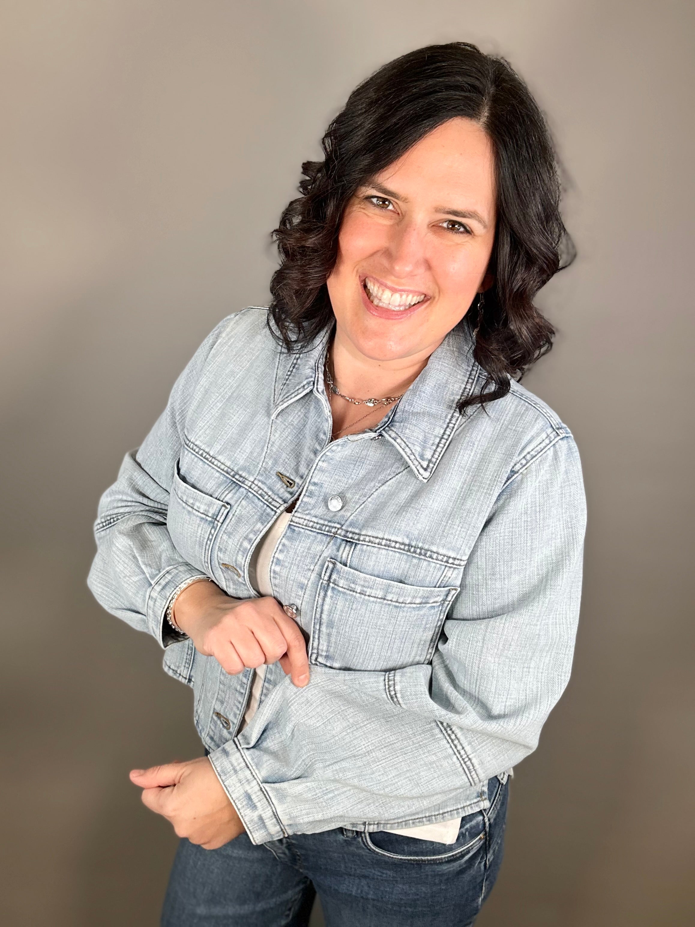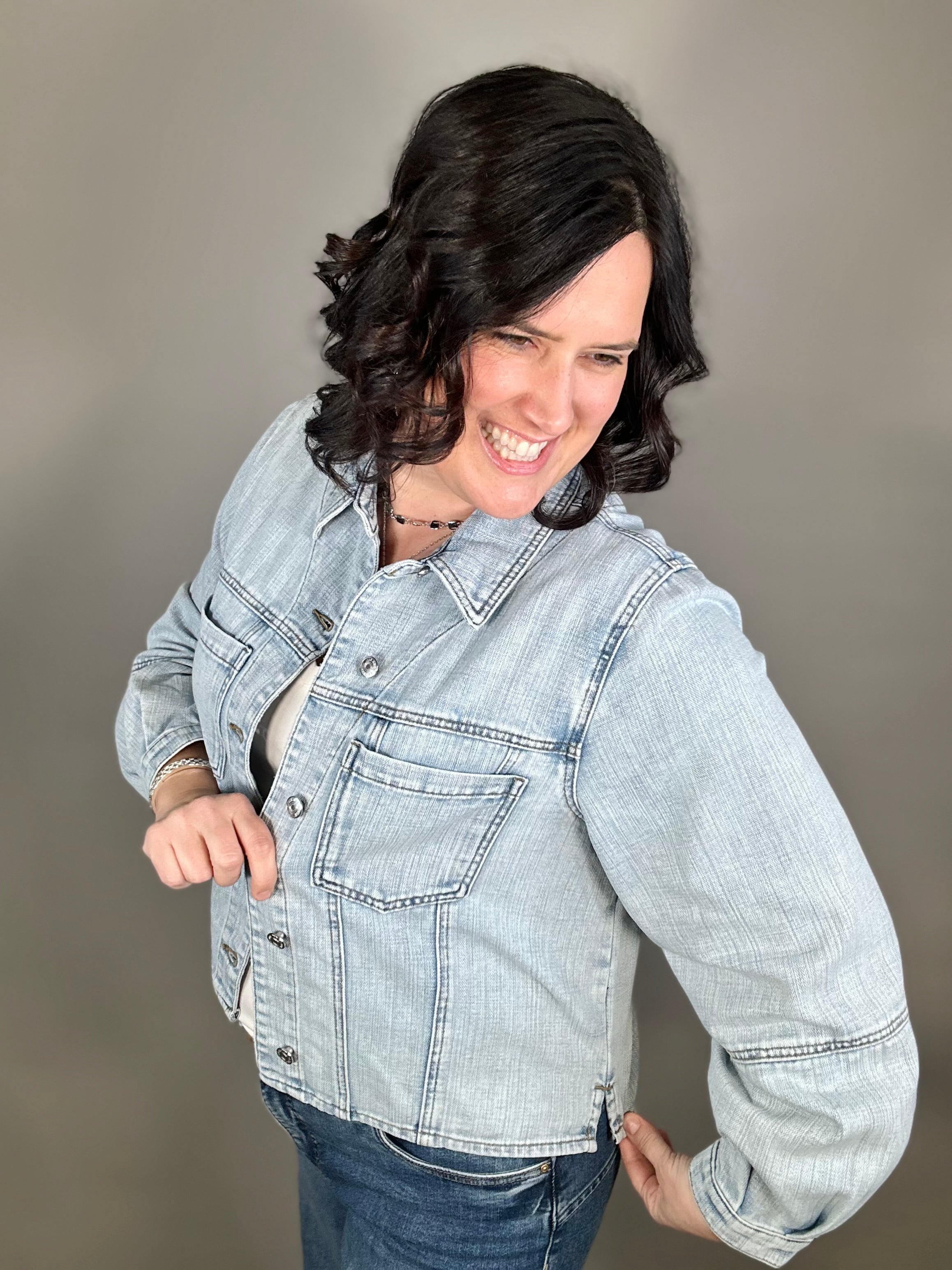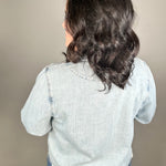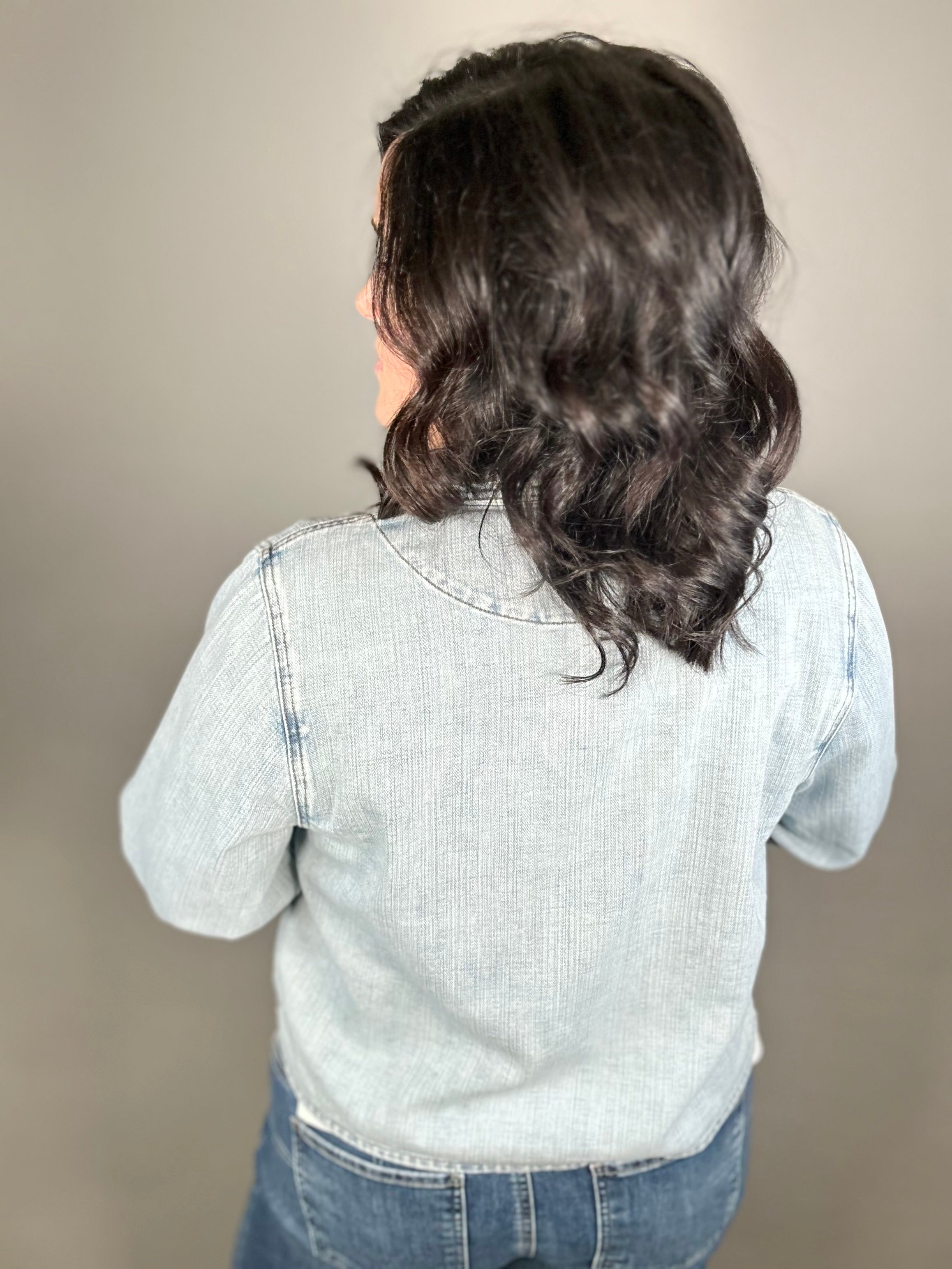 Made with a dreamy soft denim blend (79% Cotton, 21% Spandex), this jacket moves with you instead of feeling stiff or restrictive. The light wash gives it that lived-in, easygoing vibe, while the classic button front and functional front pockets keep it timeless and practical.