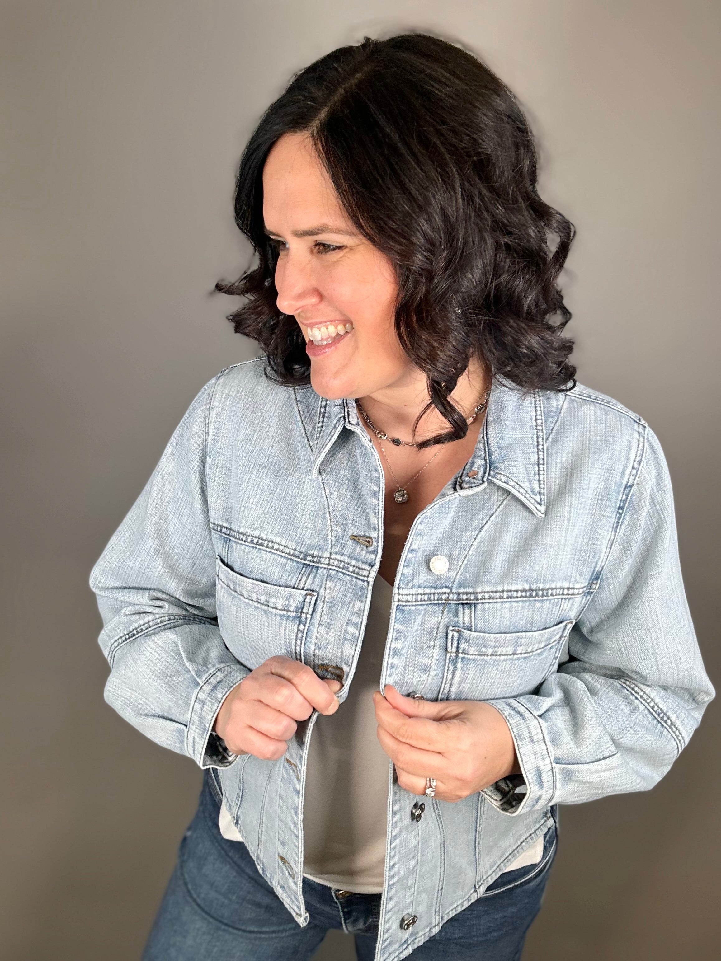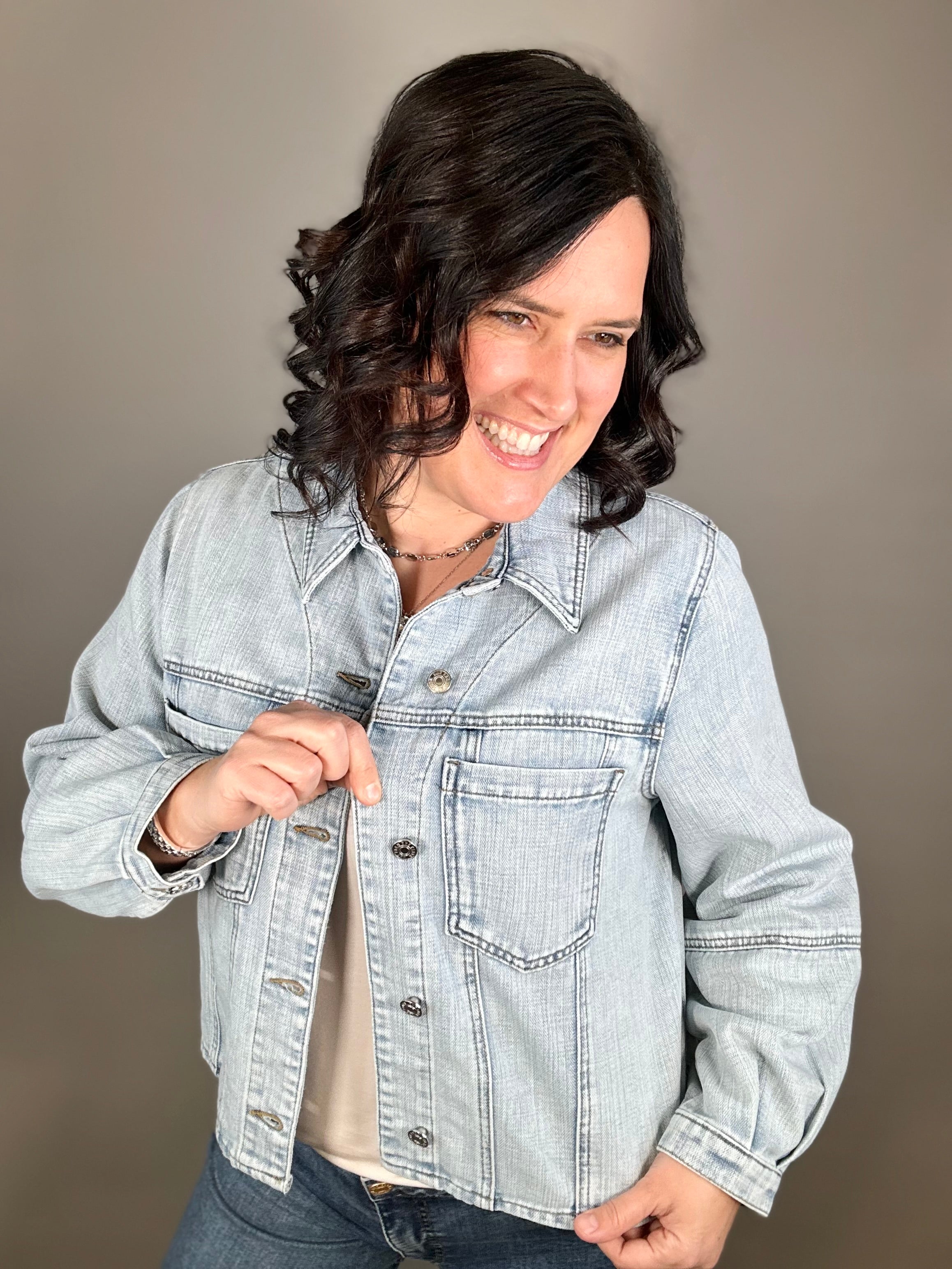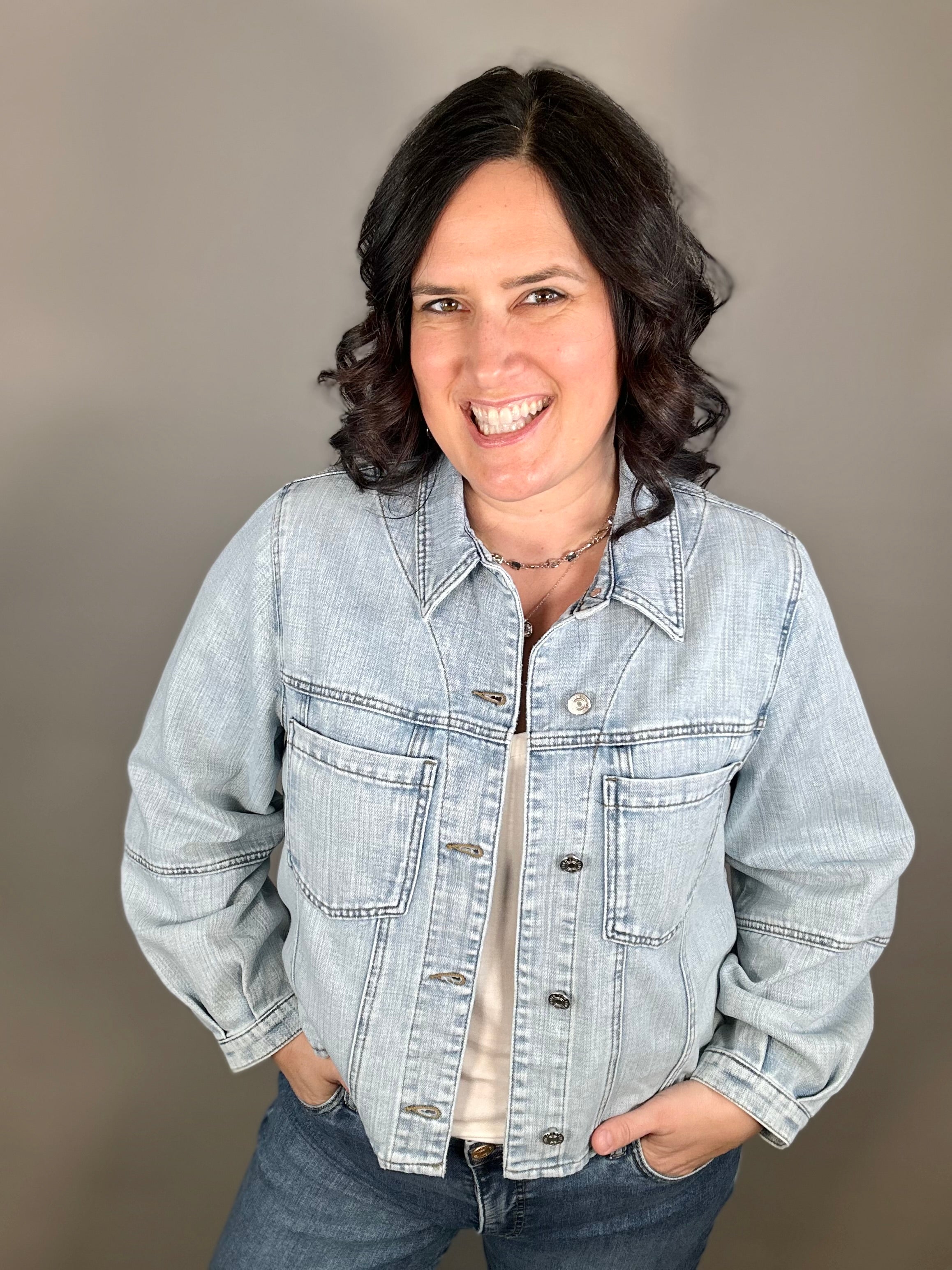 Made with a dreamy soft denim blend (79% Cotton, 21% Spandex), this jacket moves with you instead of feeling stiff or restrictive. The light wash gives it that lived-in, easygoing vibe, while the classic button front and functional front pockets keep it timeless and practical.