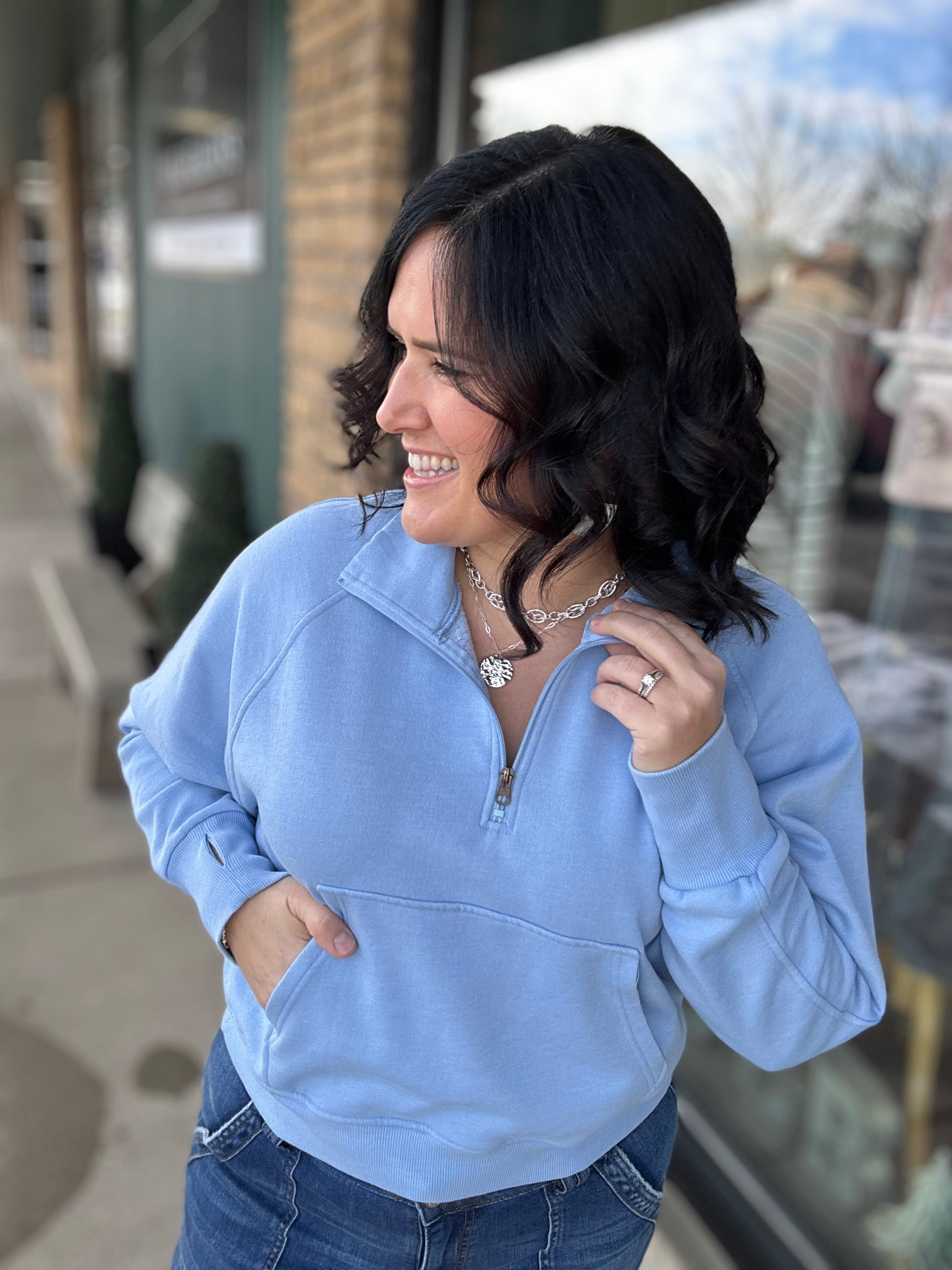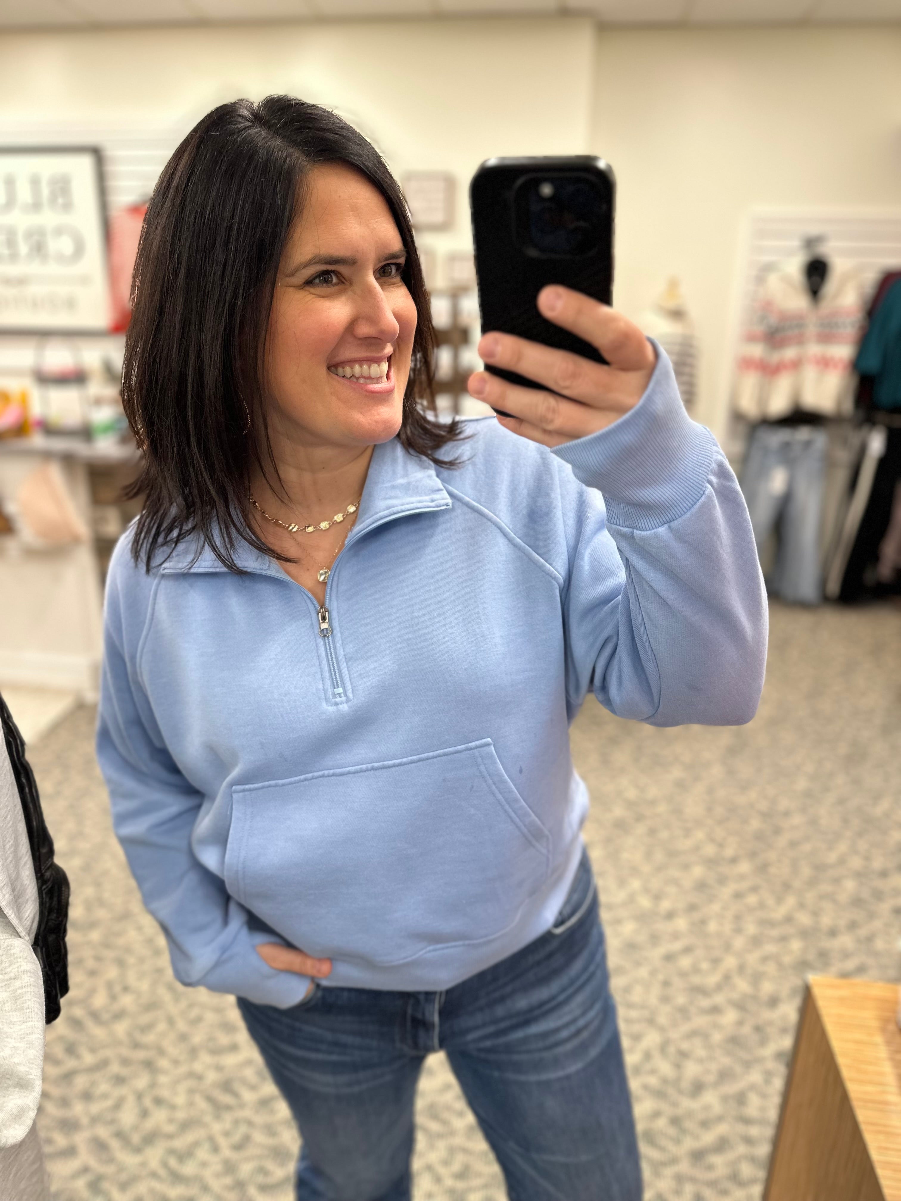 This quarter zip sweatshirt is the kind of cozy you’ll reach for on repeat. Designed with a relaxed-but-true-to-size fit, it features a soft, fleece-like lining that feels amazing the moment you slip it on. The washed-out finish gives it that perfectly lived-in look, while the dolman-style chest creates an easy, flattering drape without feeling bulky.