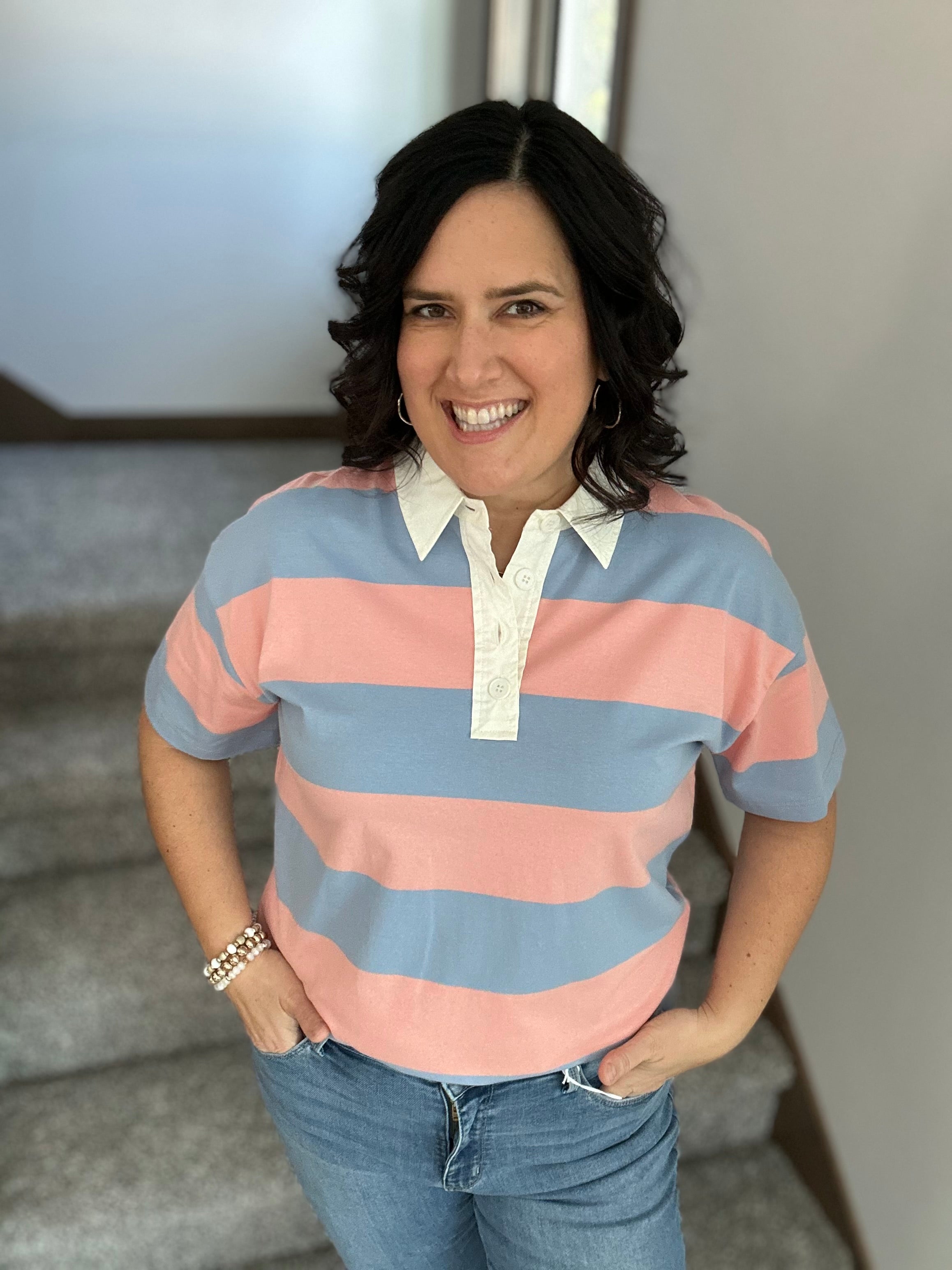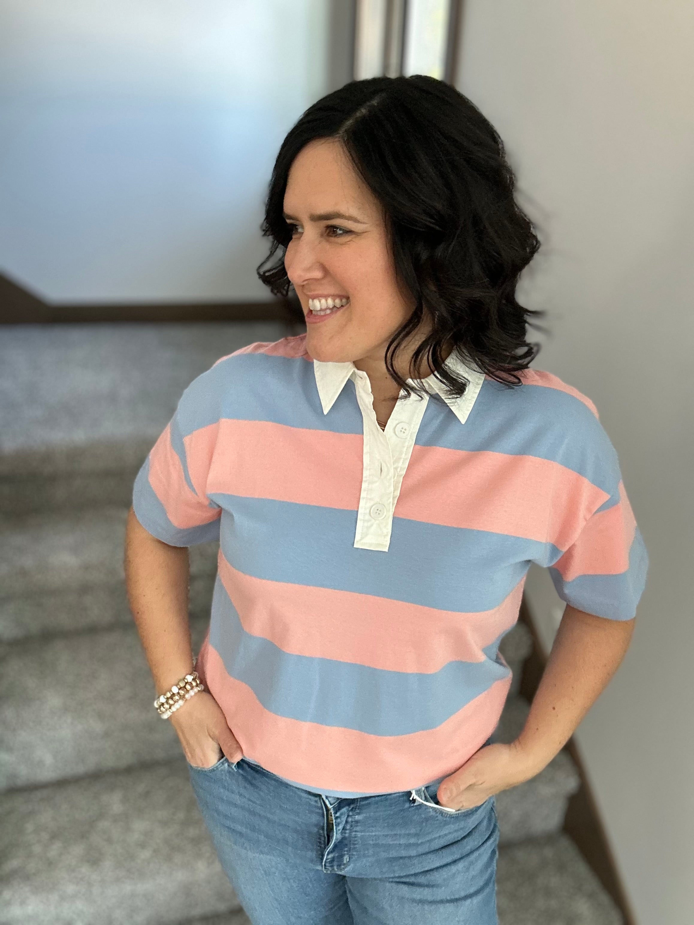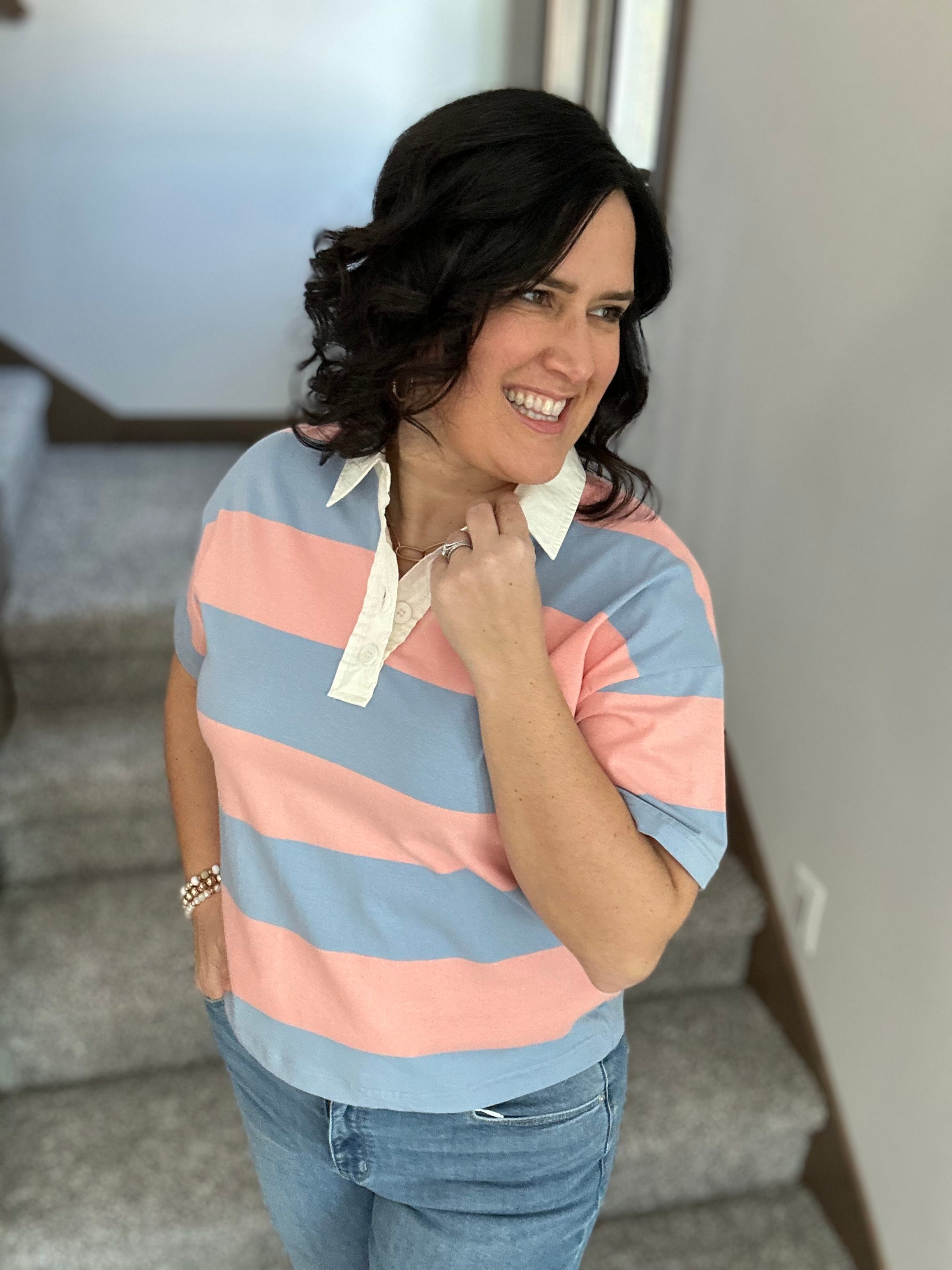 ✨ Easy, sporty, and full of personality — the Peach/Blue Rugby Polo Top is the perfect blend of comfort and cool for everyday wear.