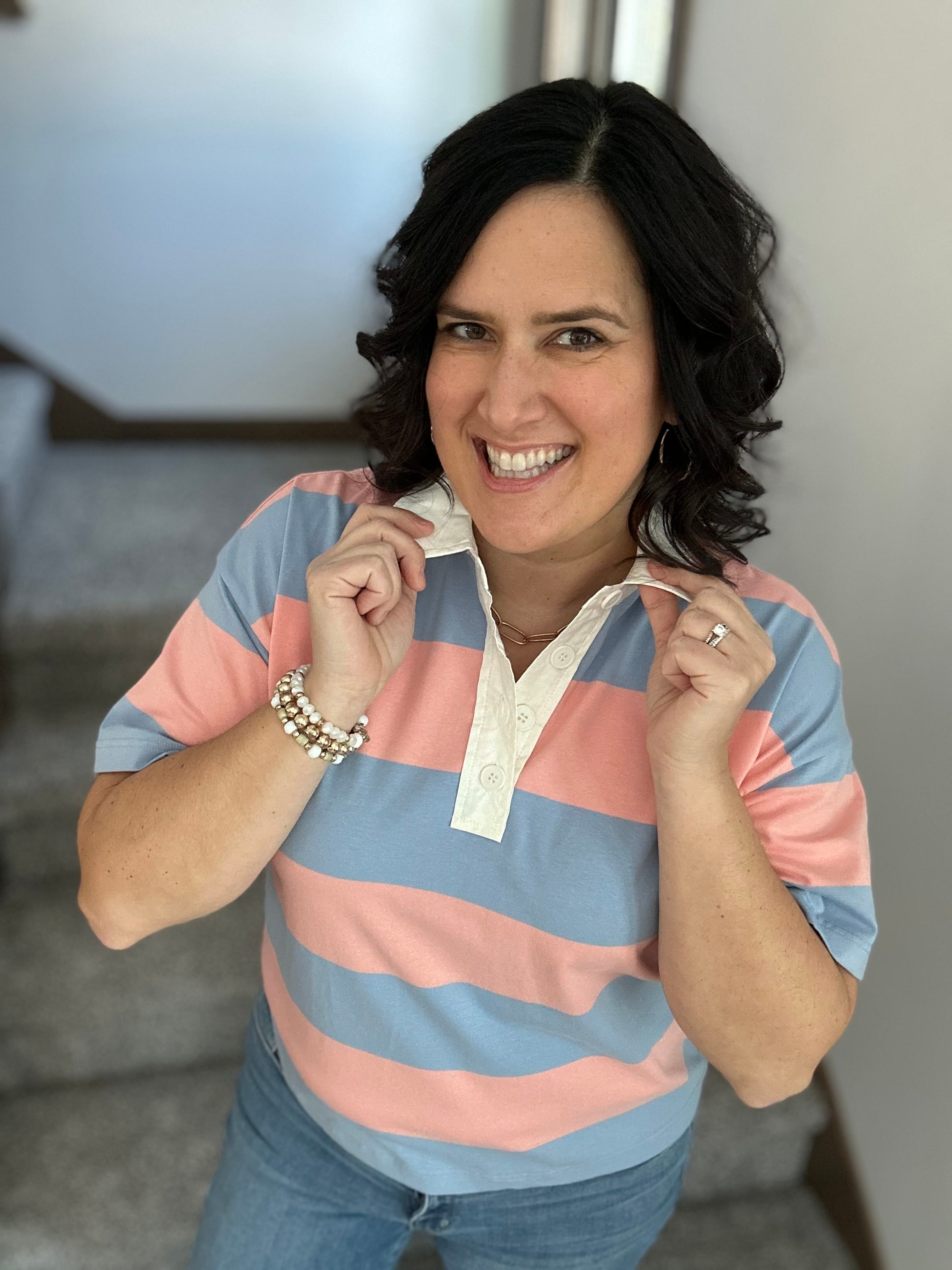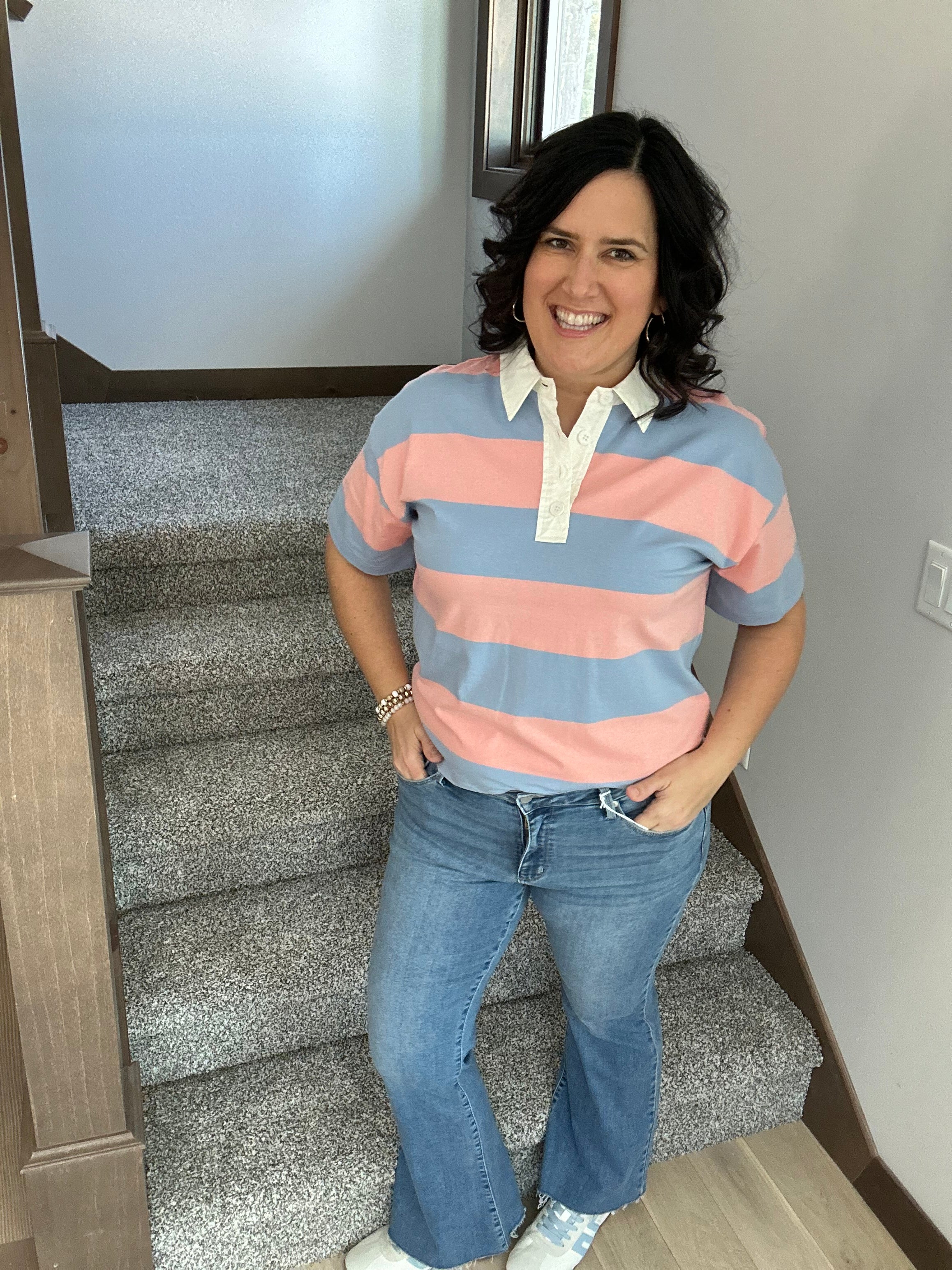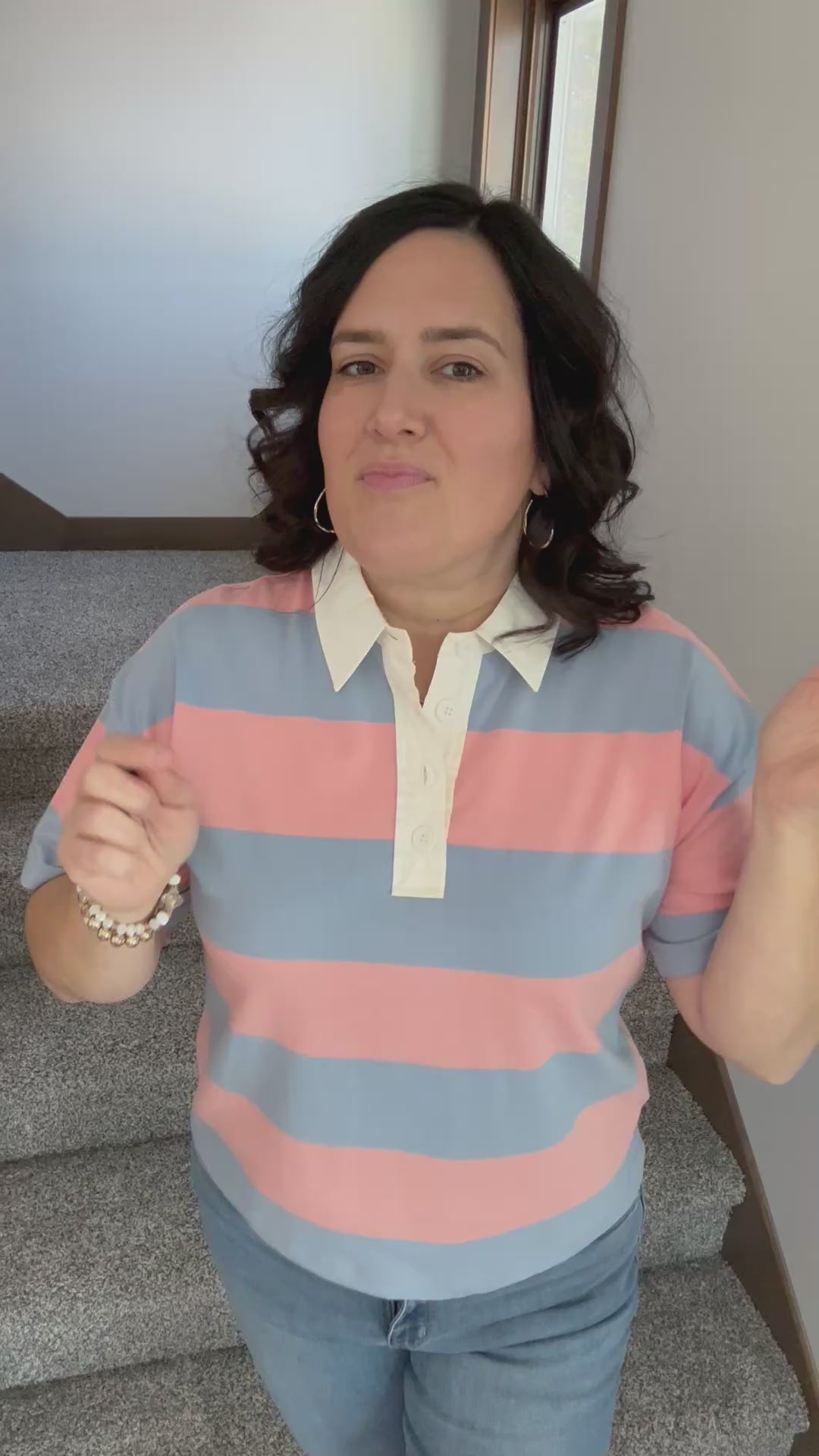 ✨ Easy, sporty, and full of personality — the Peach/Blue Rugby Polo Top is the perfect blend of comfort and cool for everyday wear.