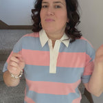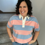Sporty, playful, and effortlessly cool — the Peach/Blue Rugby Polo Top from Staccato brings a fresh twist to a classic athletic-inspired style. With its relaxed, oversized fit and bold rugby stripes, this top is the perfect mix of comfort and statement style.