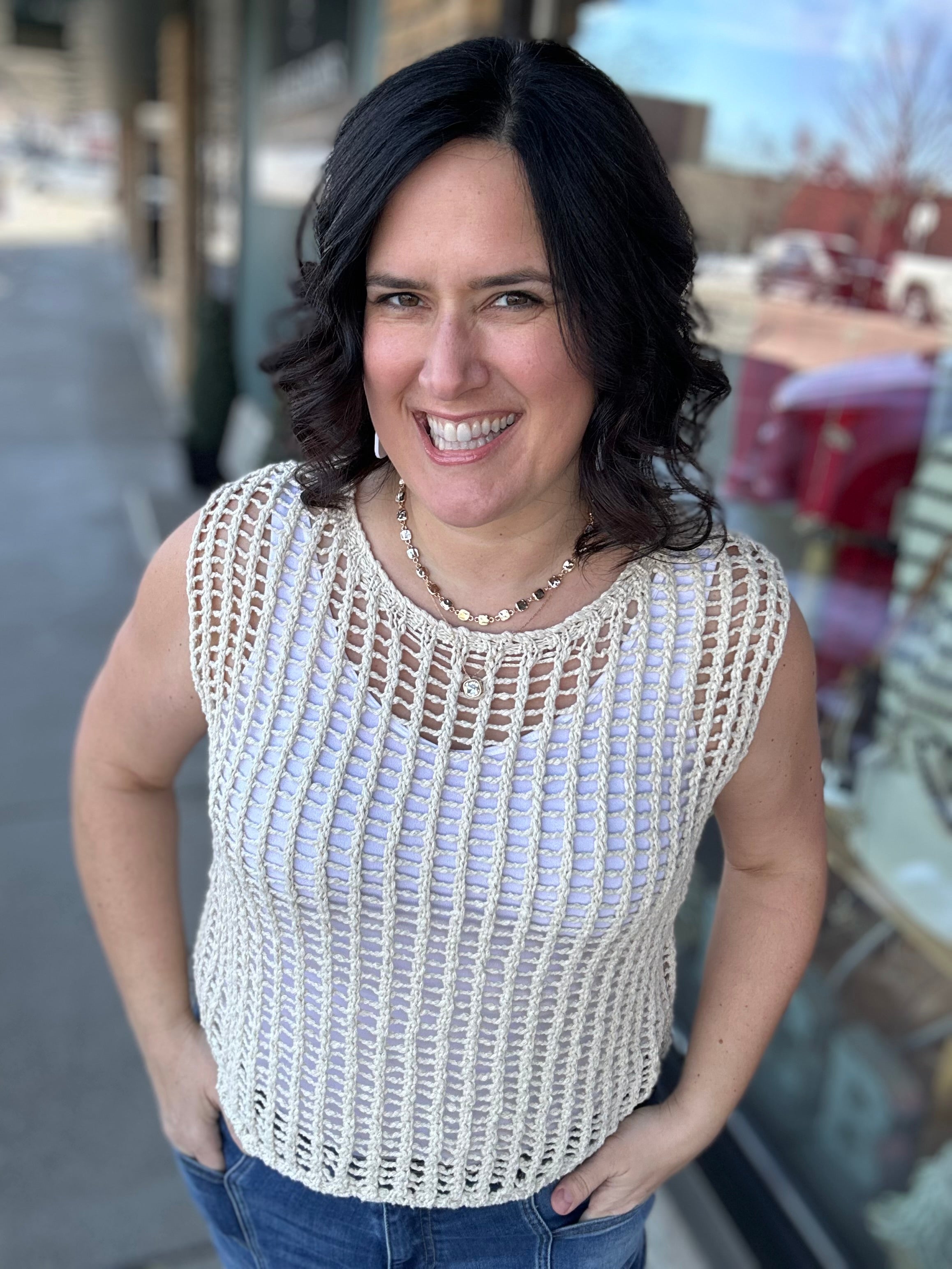 The chunky open-stitch knit adds texture and dimension, while still feeling breathable and lightweight thanks to the 100% cotton fabric. It’s relaxed, laid-back, and perfectly on trend — without feeling overdone. The classic crew neckline keeps it timeless, making it a piece you’ll reach for year after year.