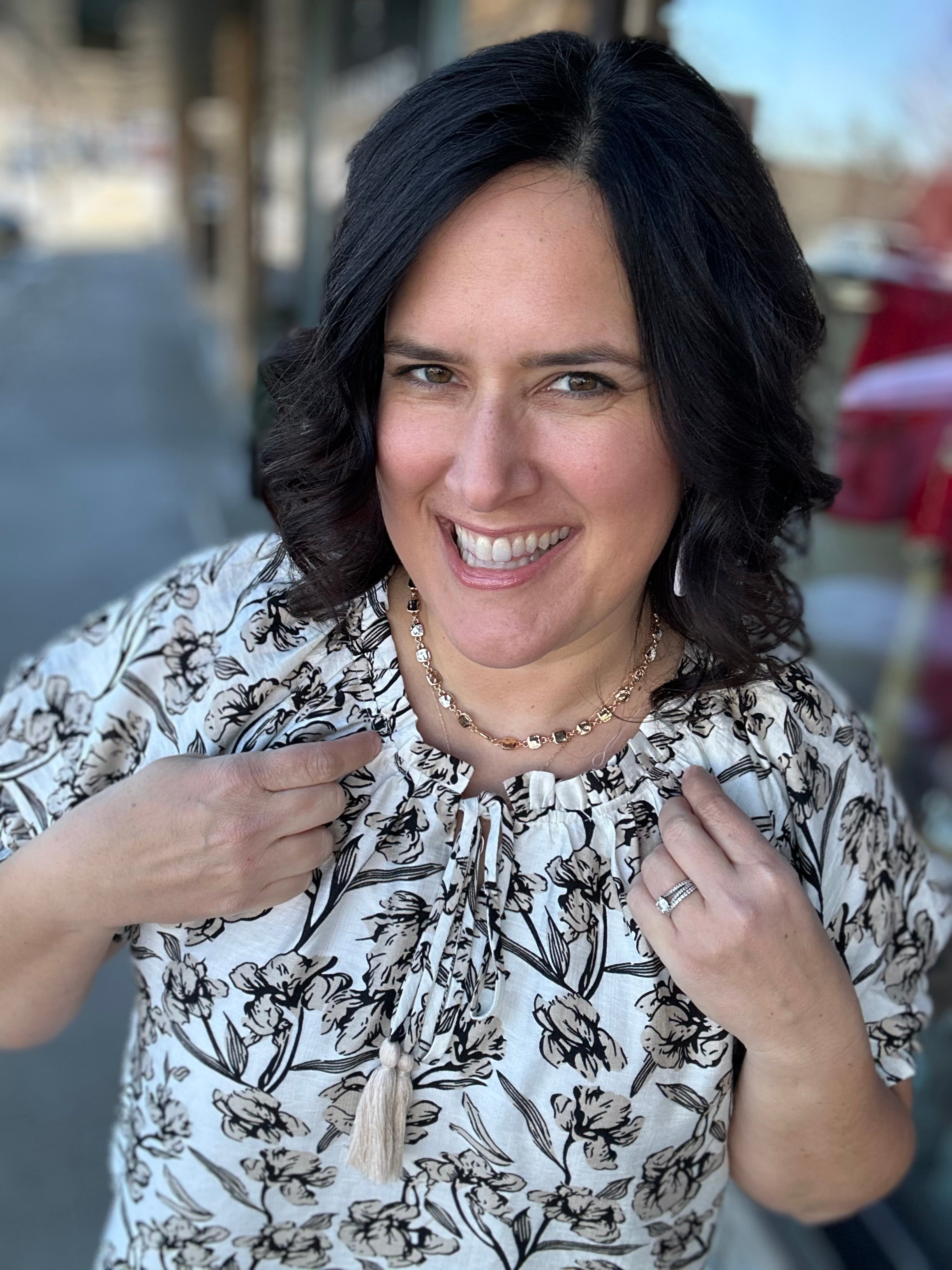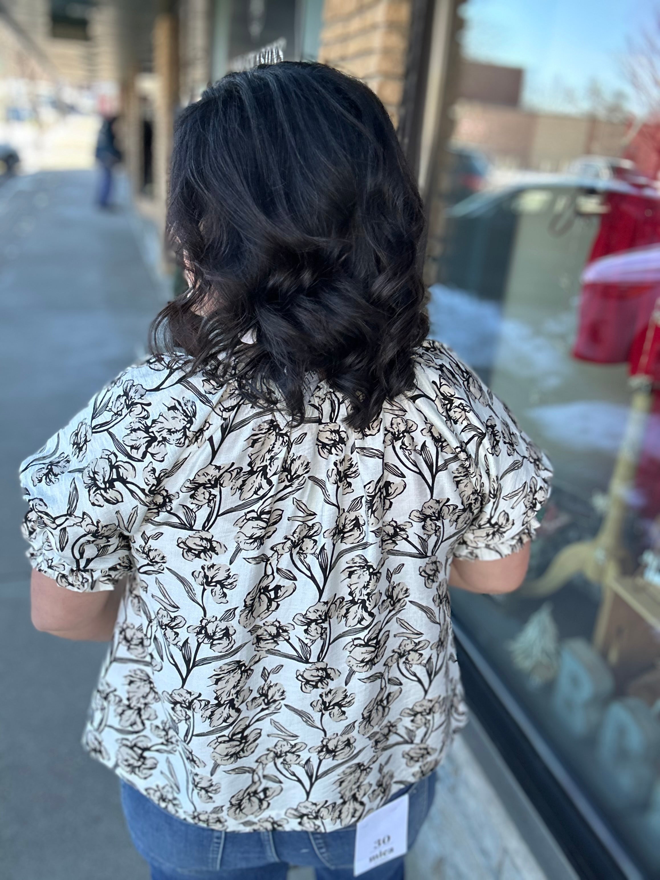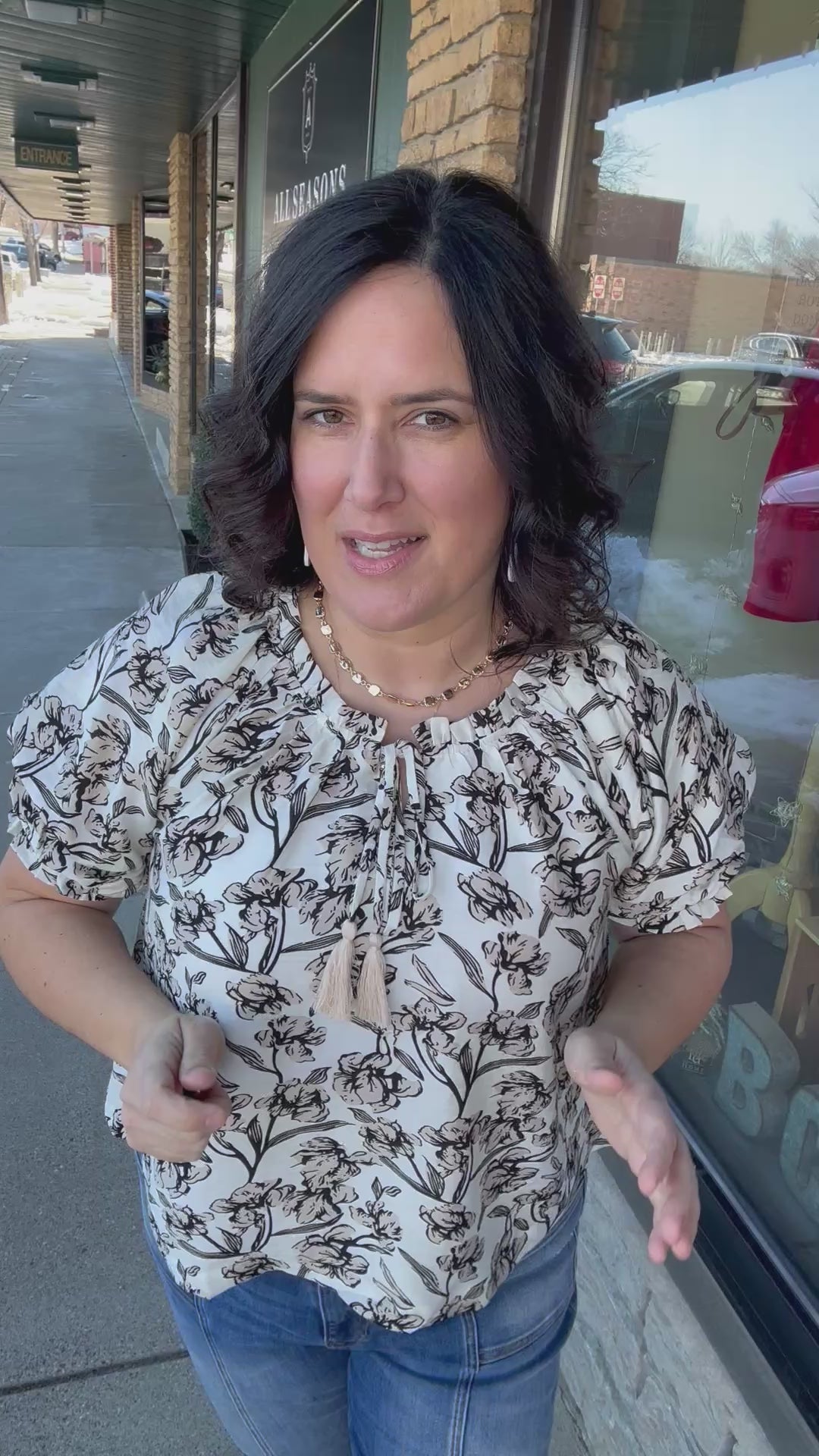 The soft taupe and black floral pattern gives you that neutral-with-interest vibe. It’s subtle, classy, and easy to style, but still makes a statement. The tie elastic collar adds just the right amount of detail (wear it tied for a polished look or leave it slightly open for a relaxed feel). And those bubble sleeves? So flattering. So fun. They give you shape without clinging.